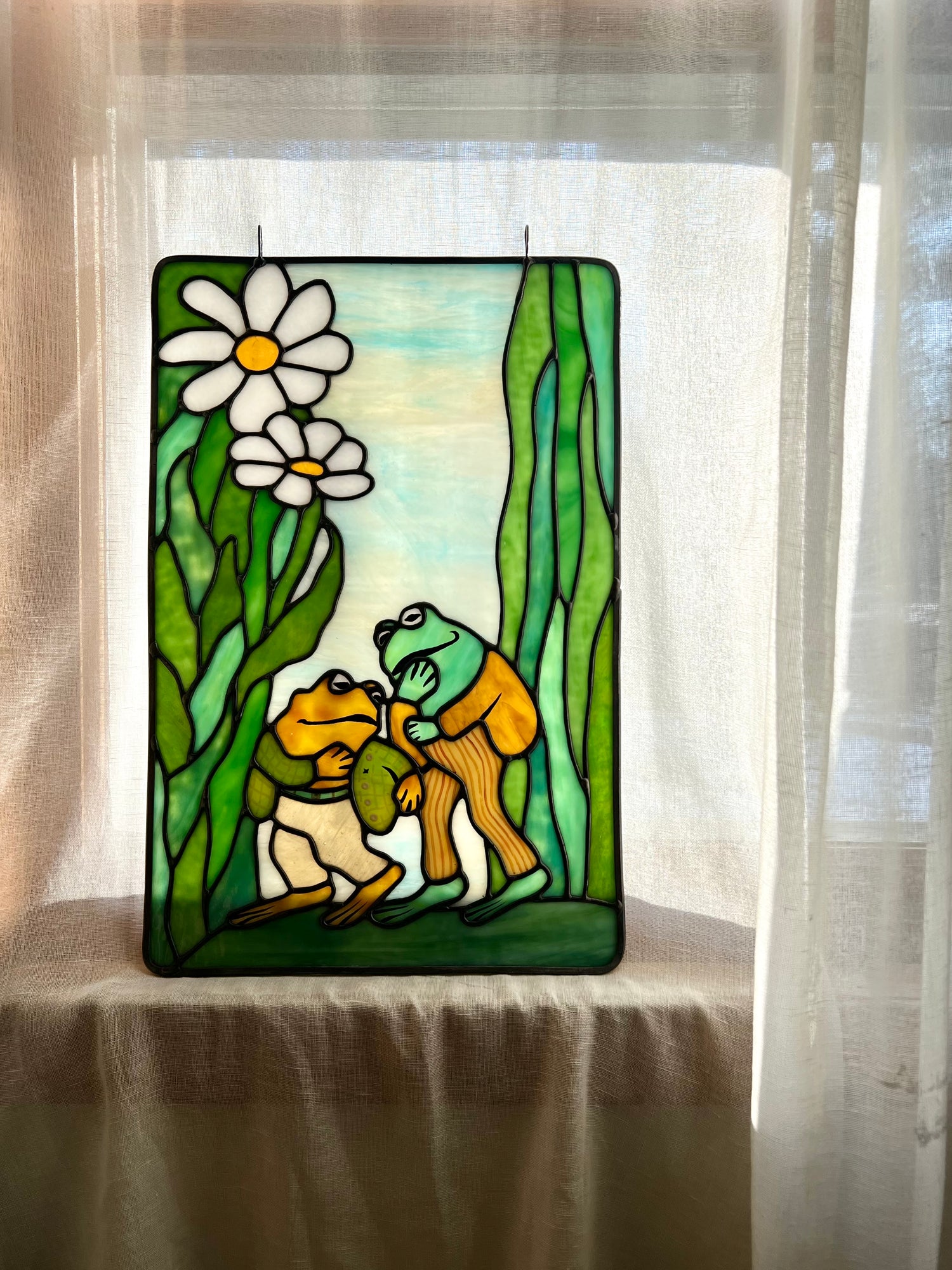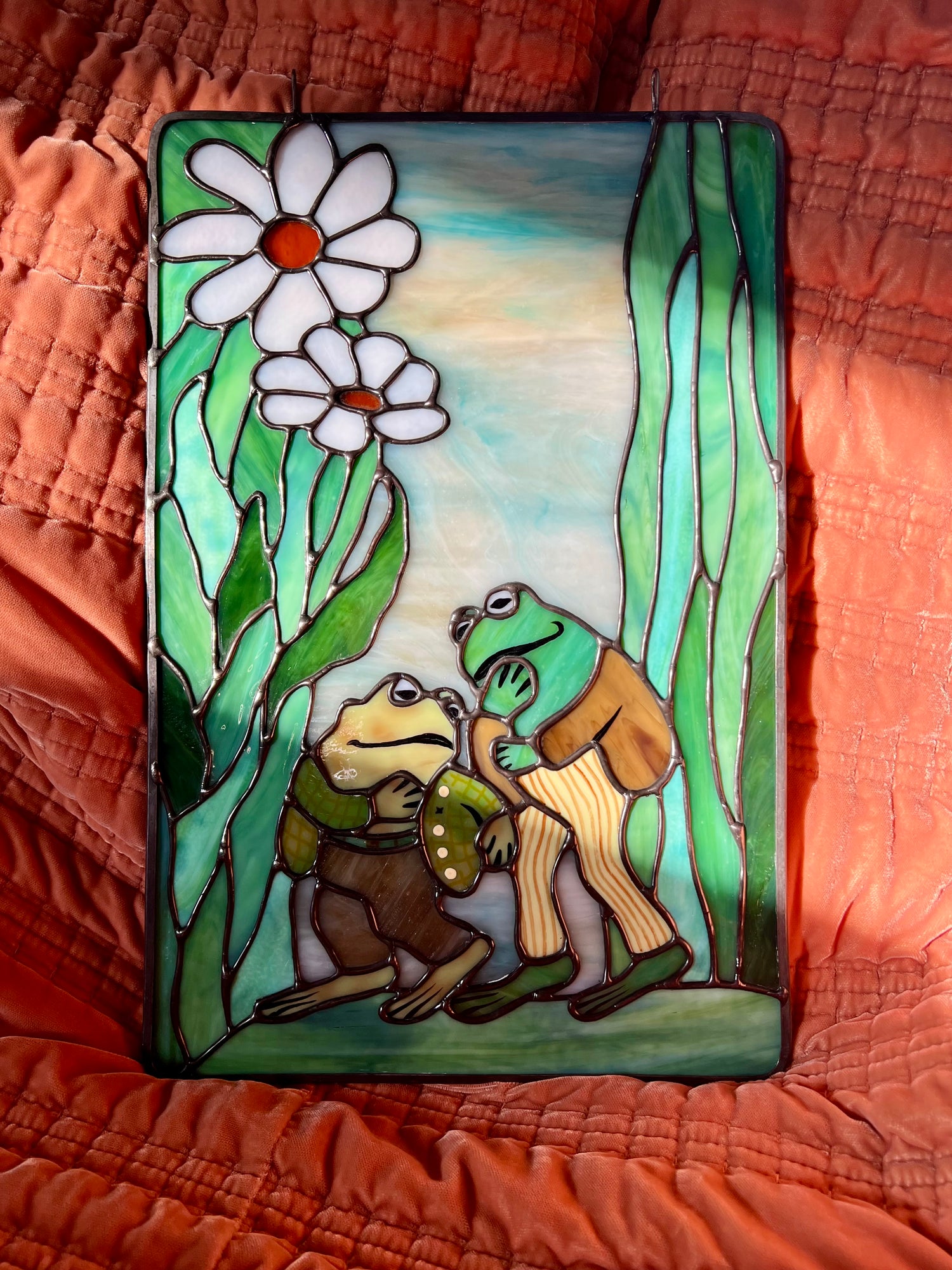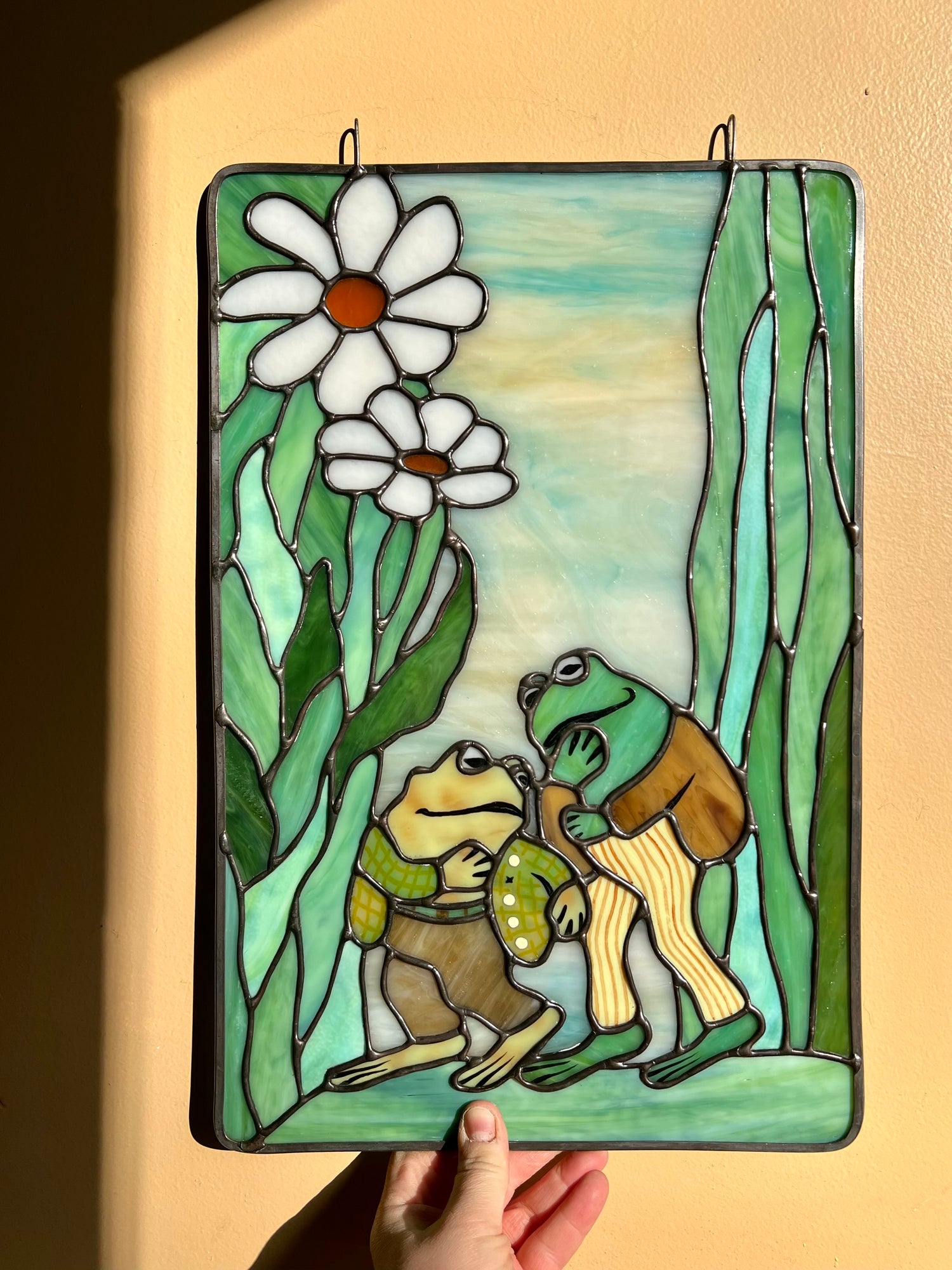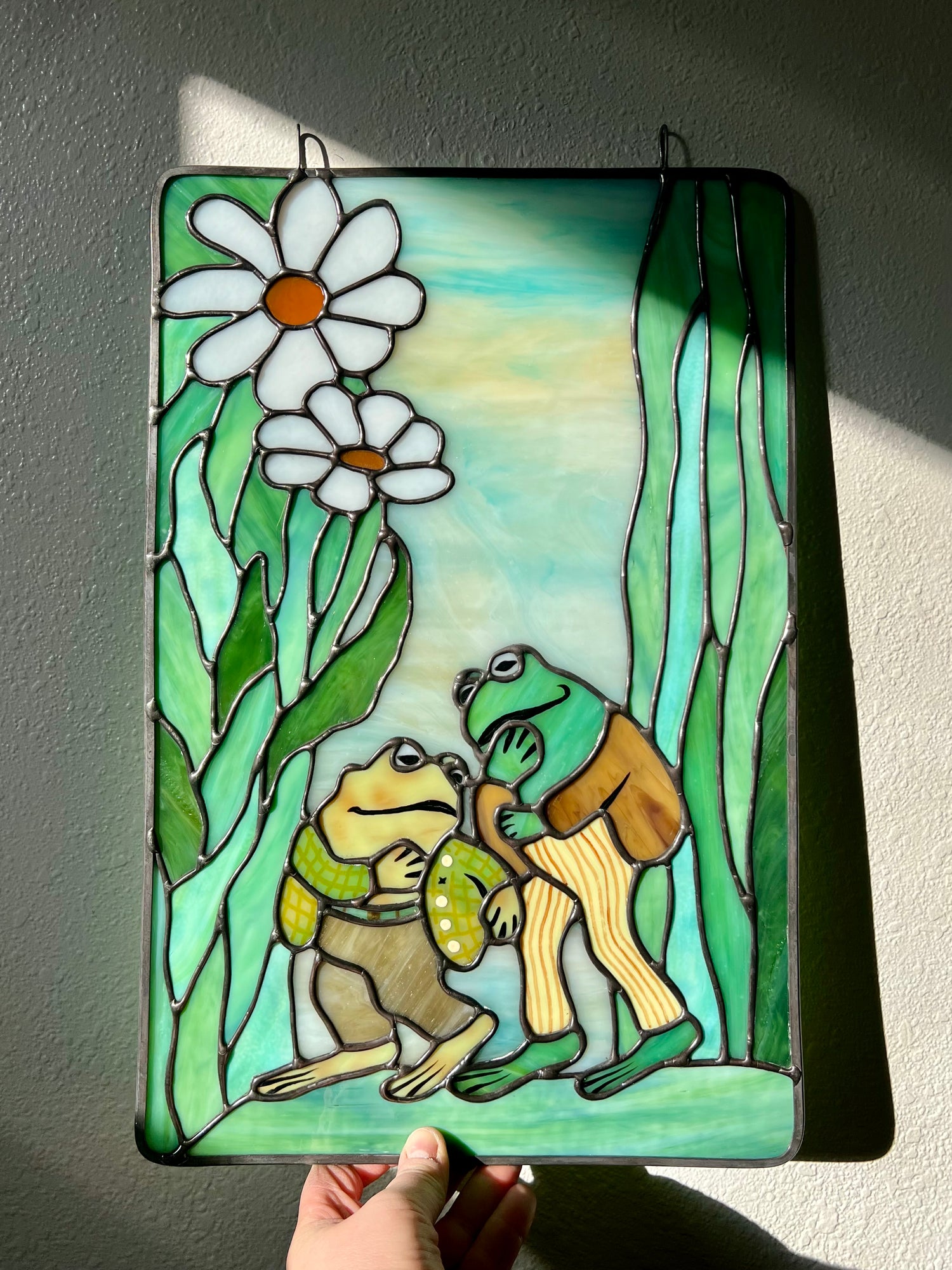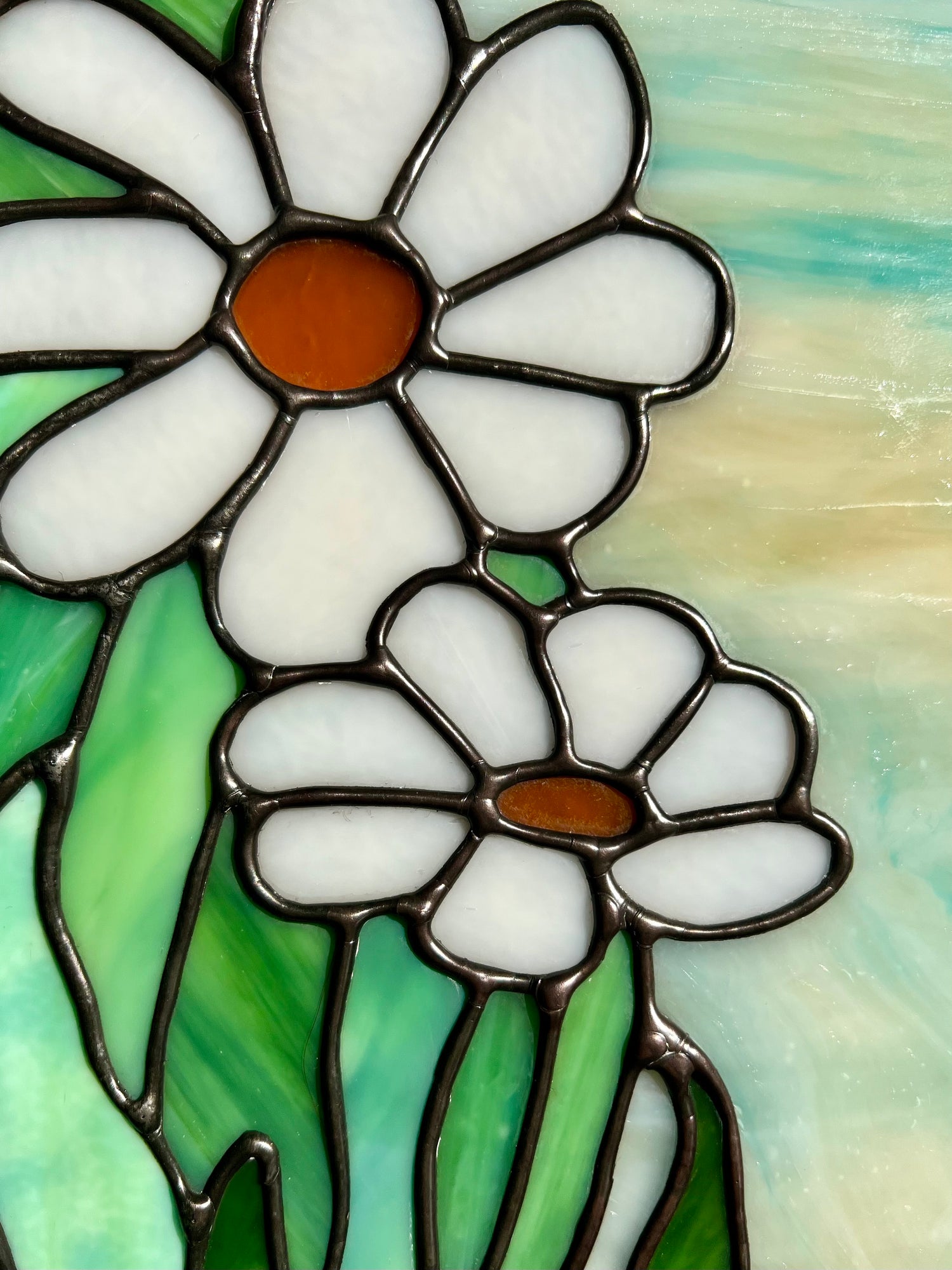 stained glass / lead tin solder / lead frame / black patina / hand painted details / zinc chain for hanging