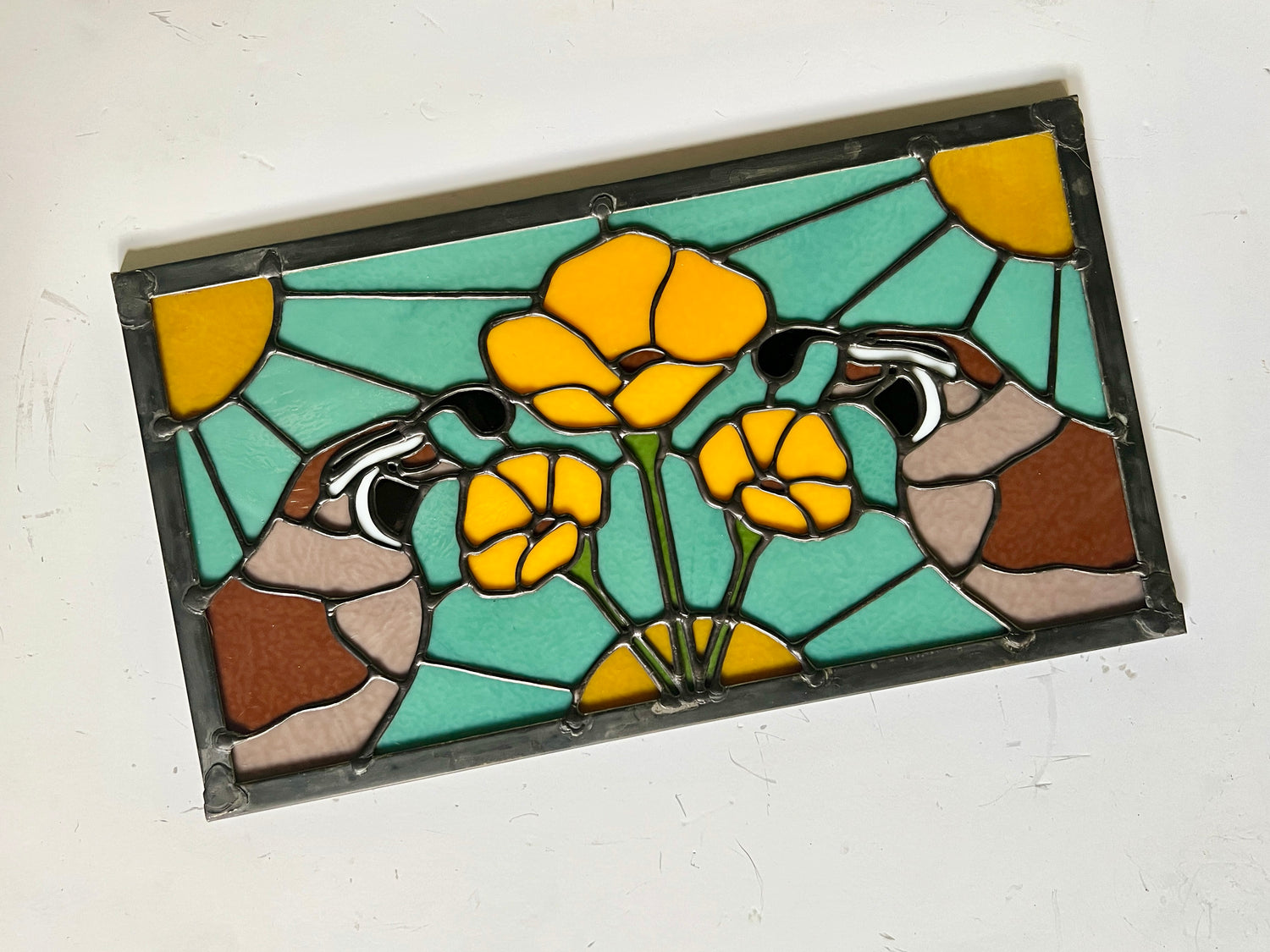 bullseye stained glass / lead tin solder / zinc frame / black patina