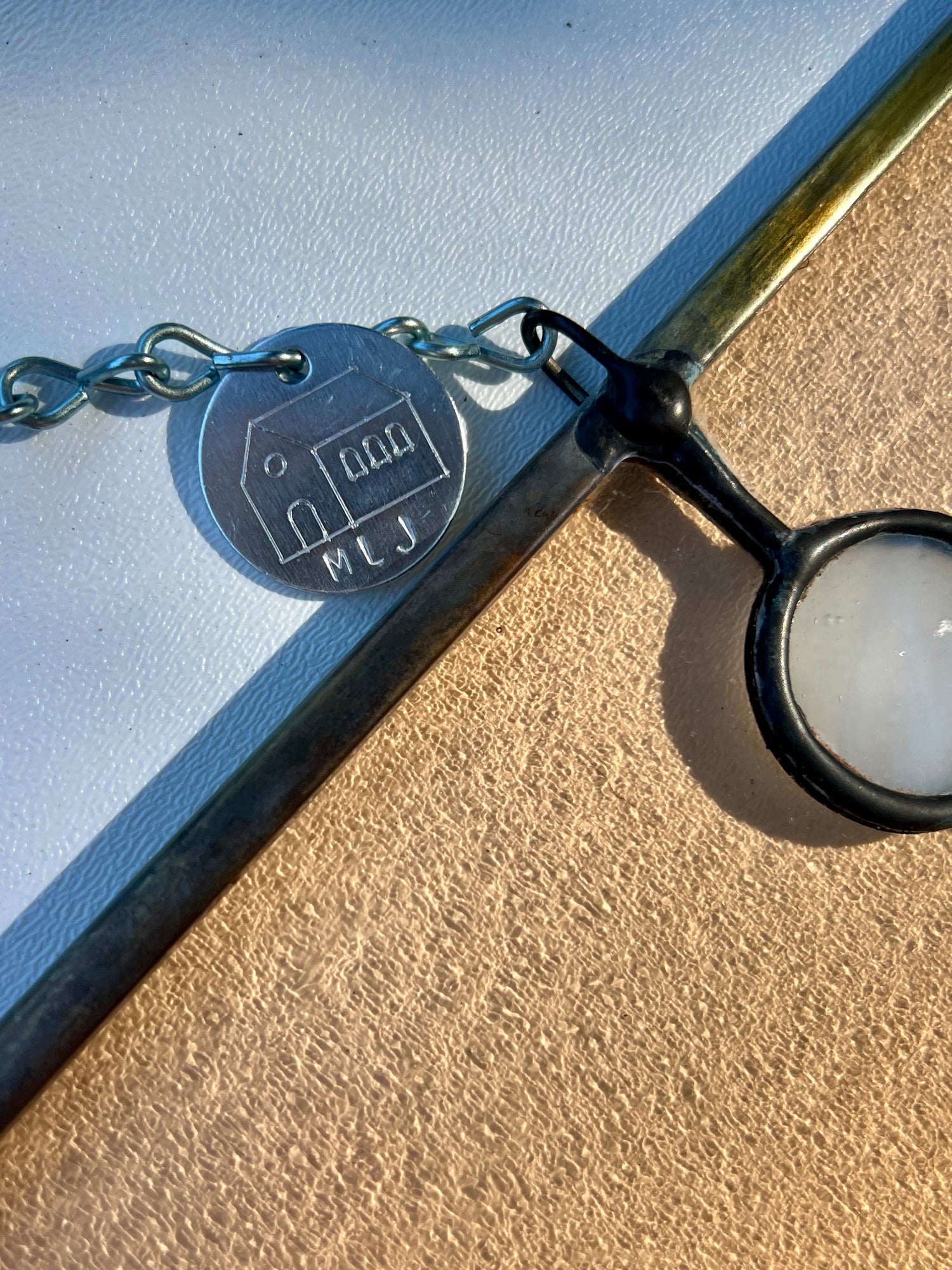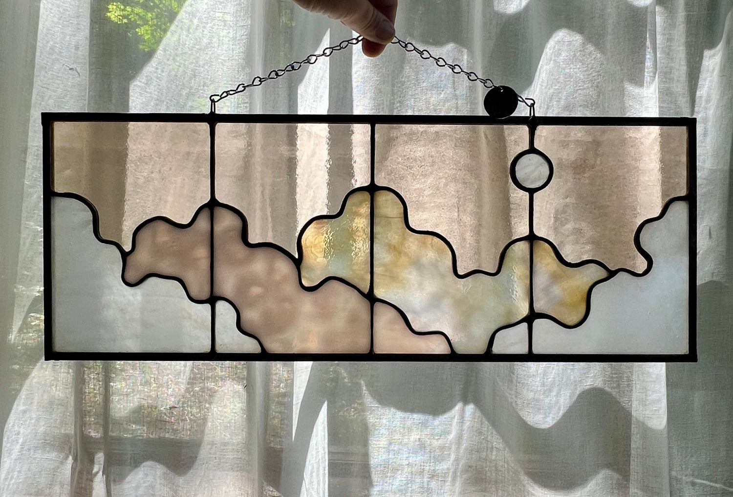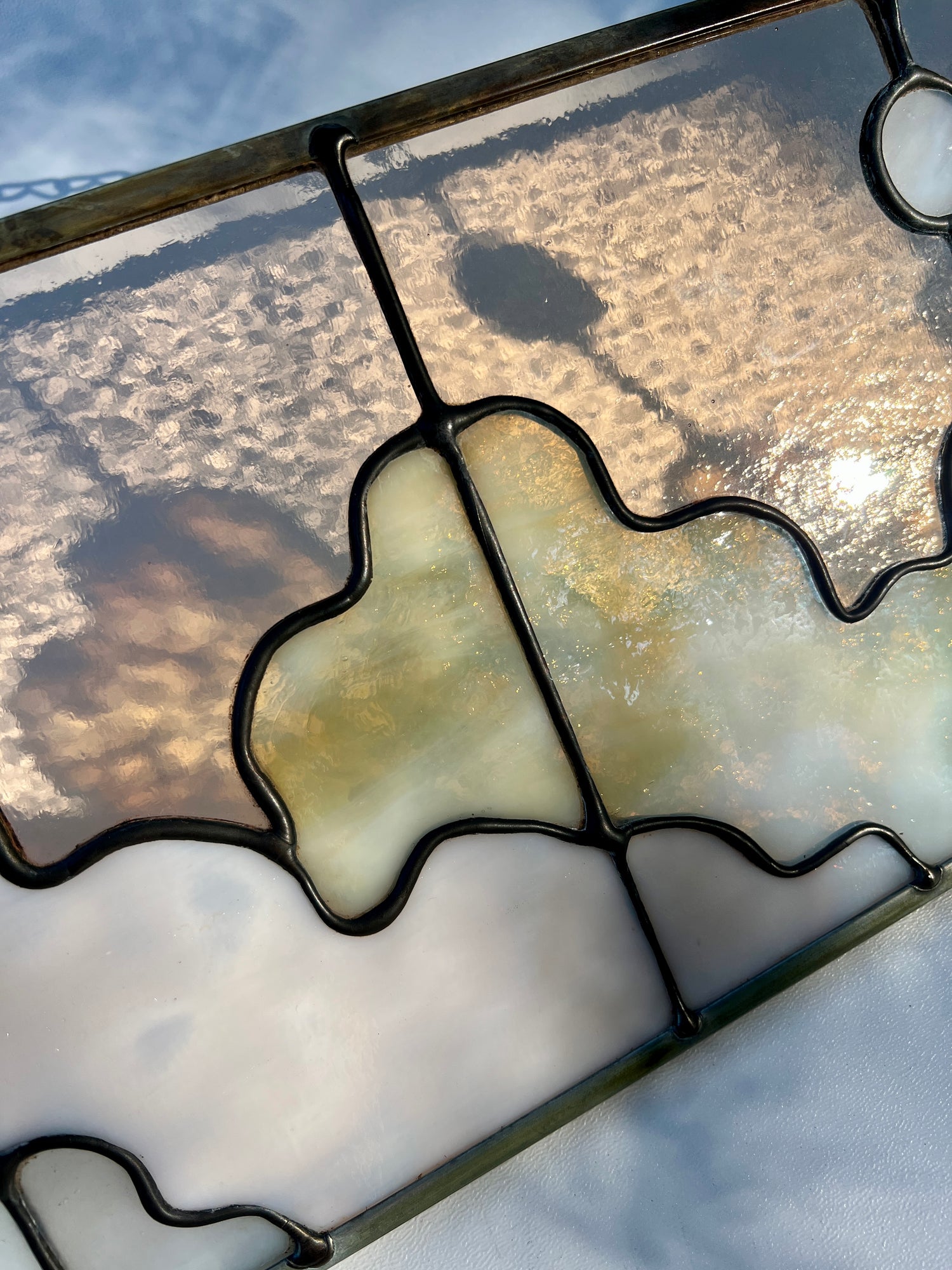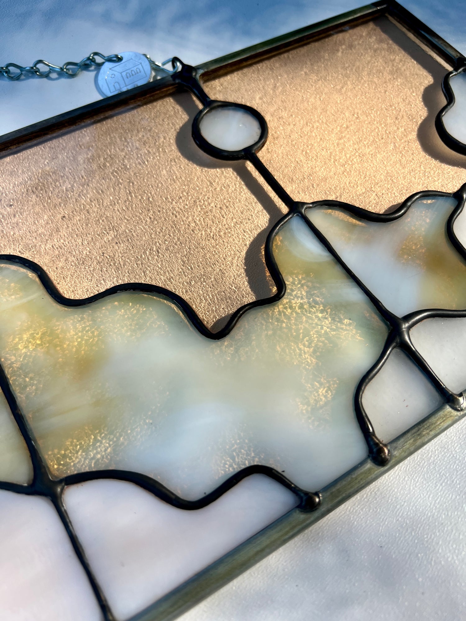 stained glass / lead tin solder / zinc came / black patina / zinc chain