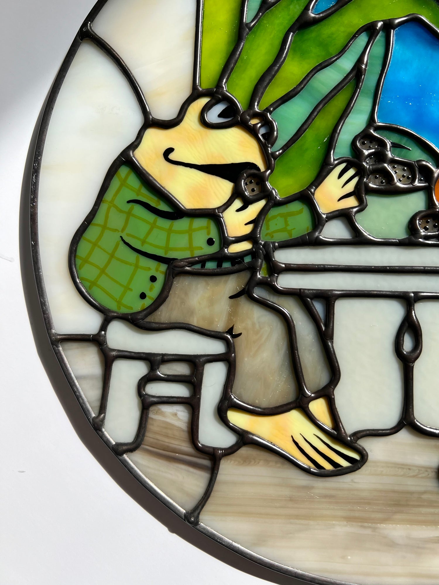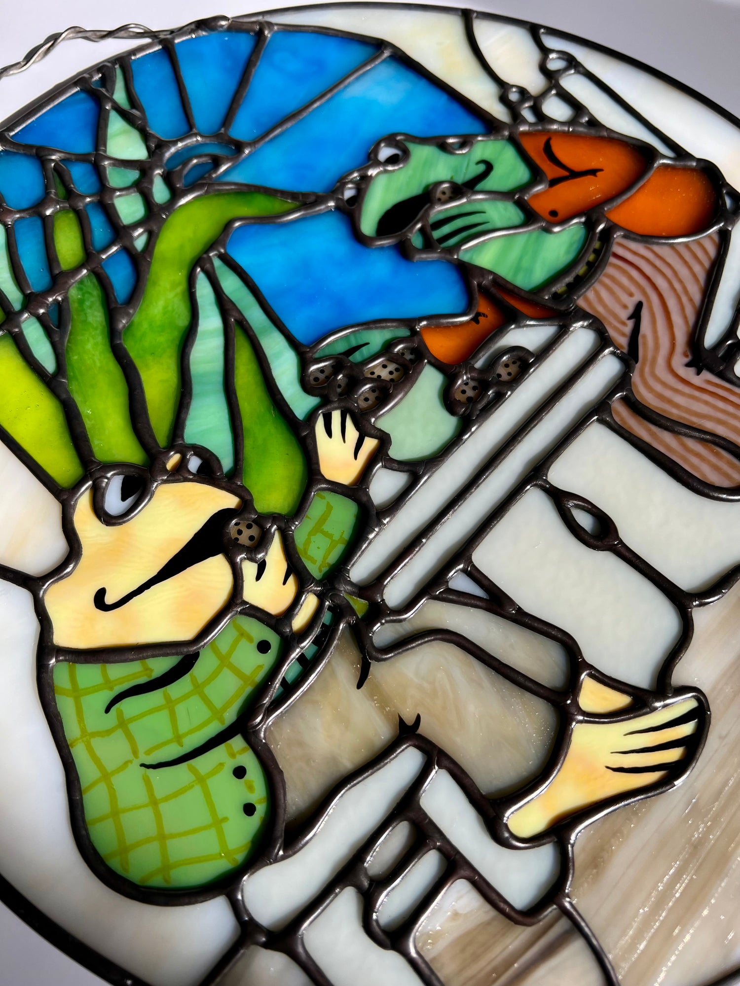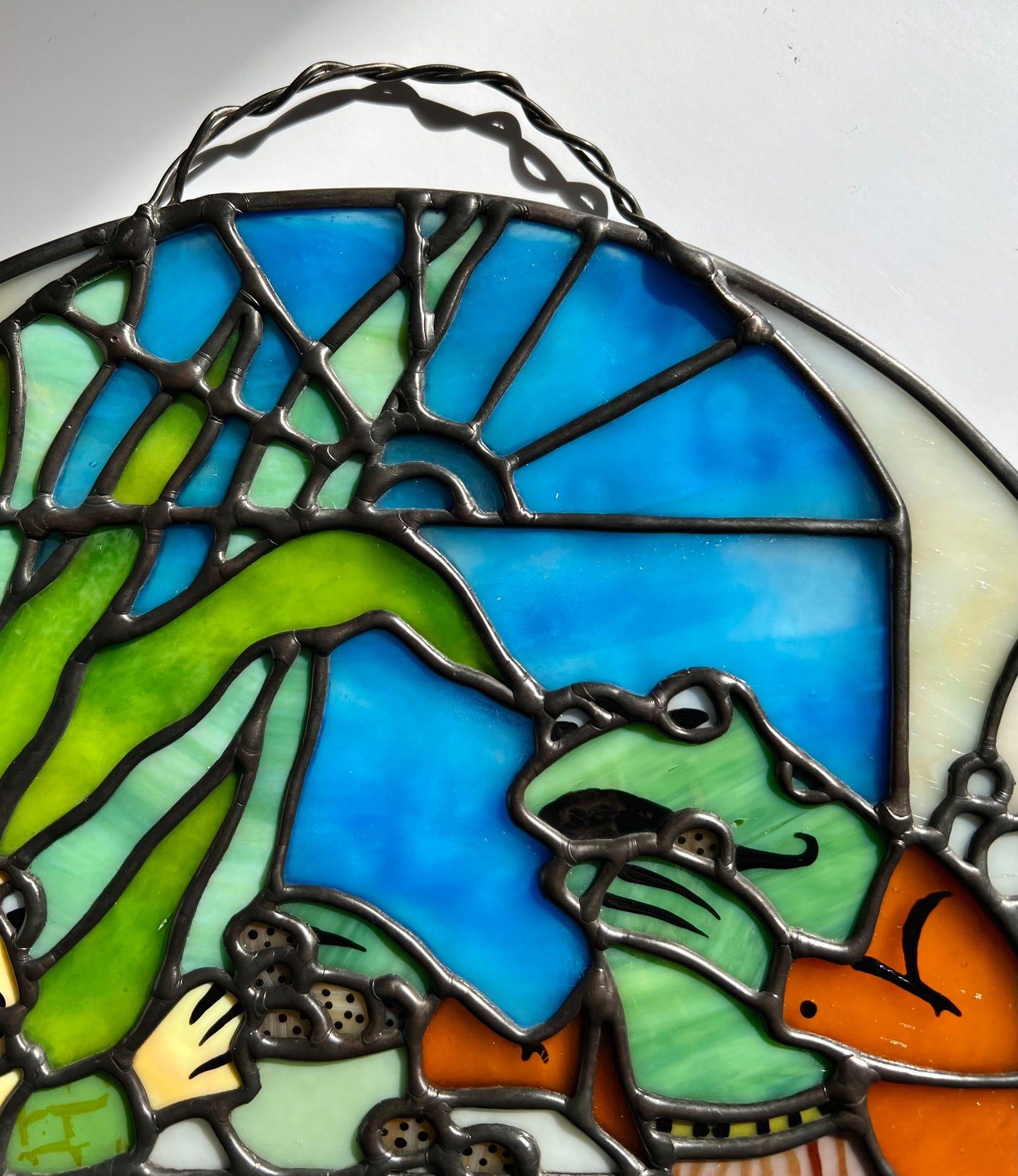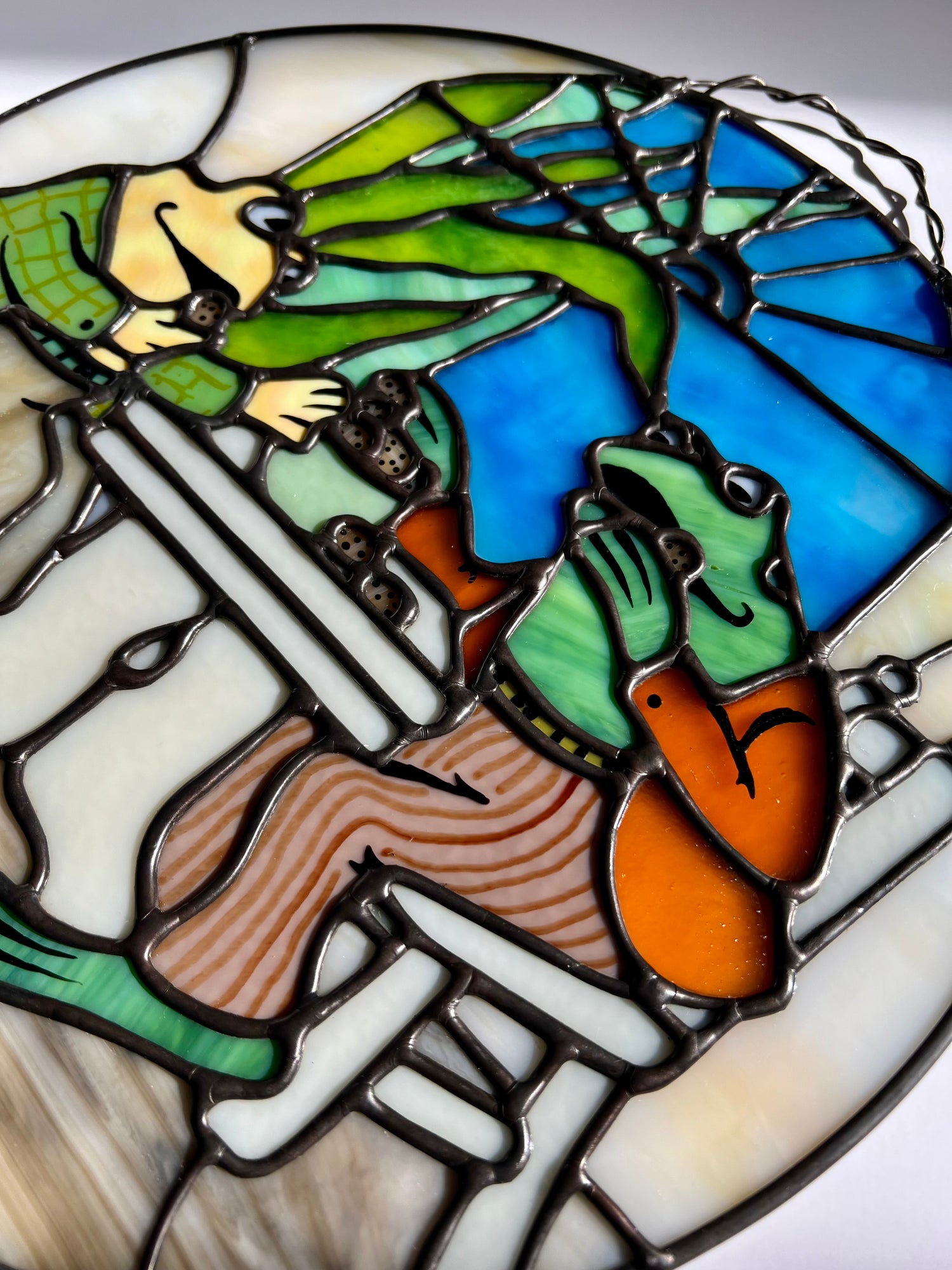 stained glass / lead tin solder / lead frame / black patina / hand painted details / zinc chain for hanging