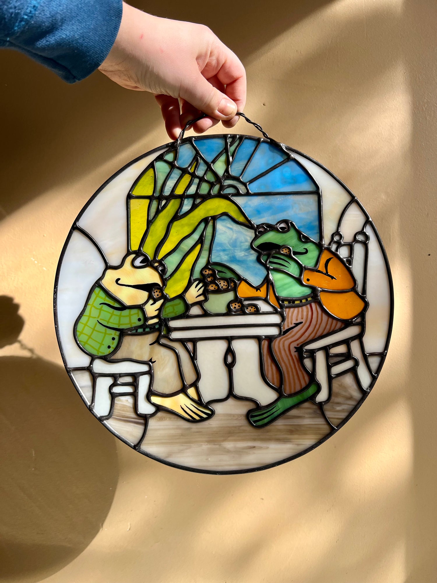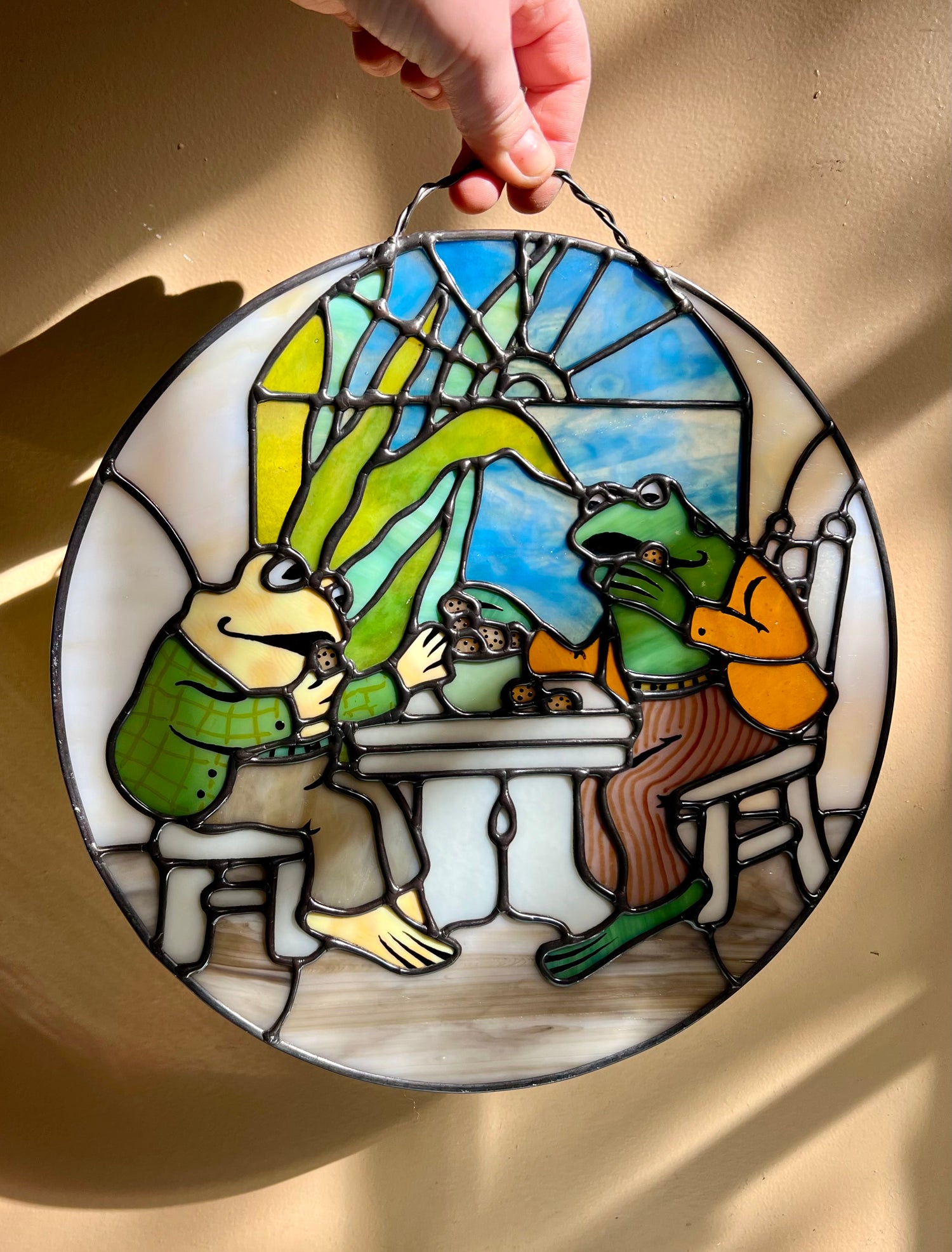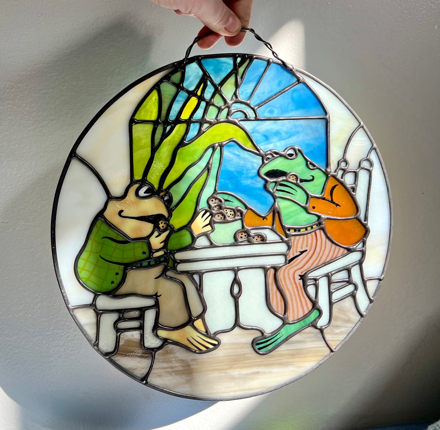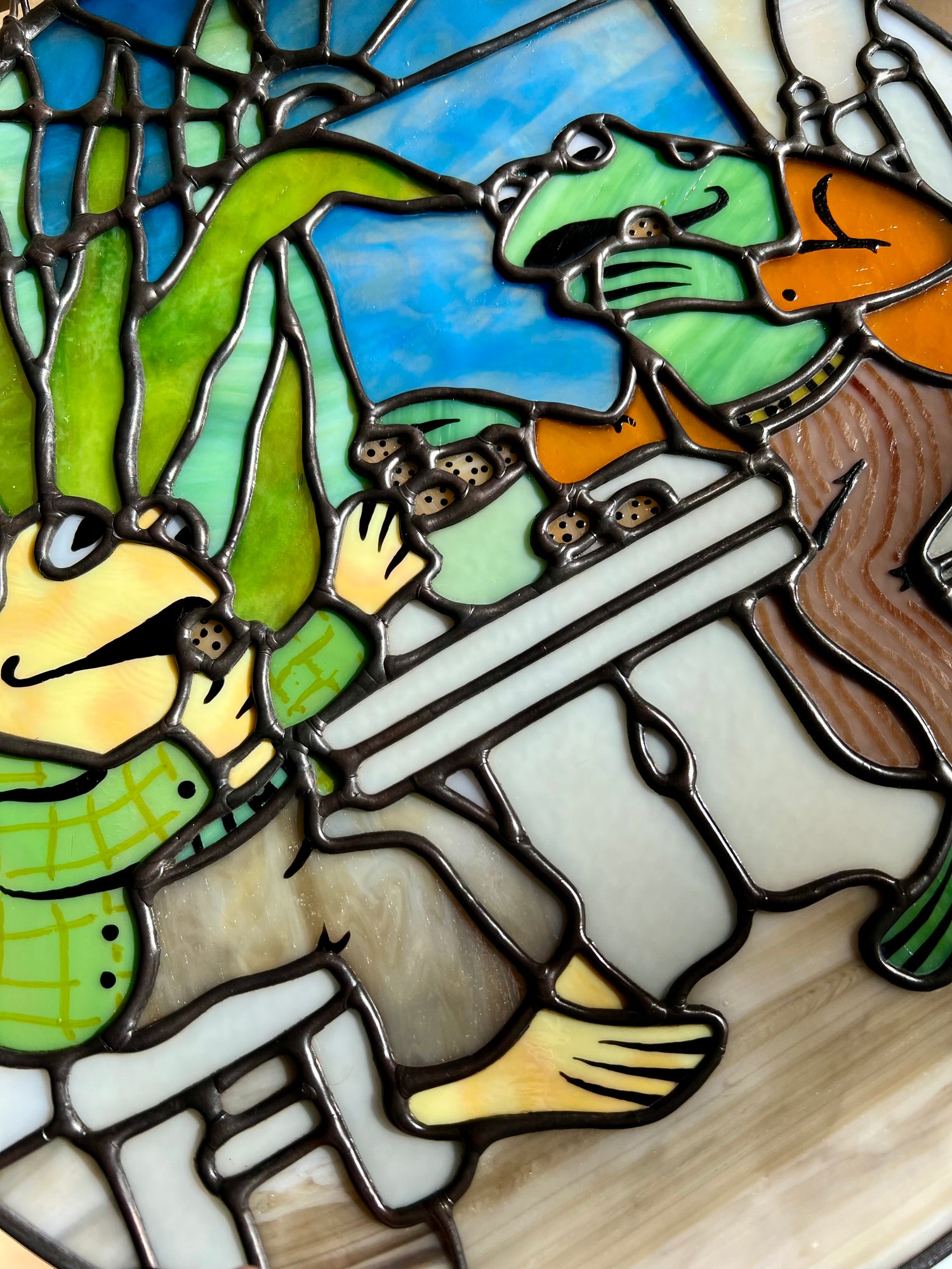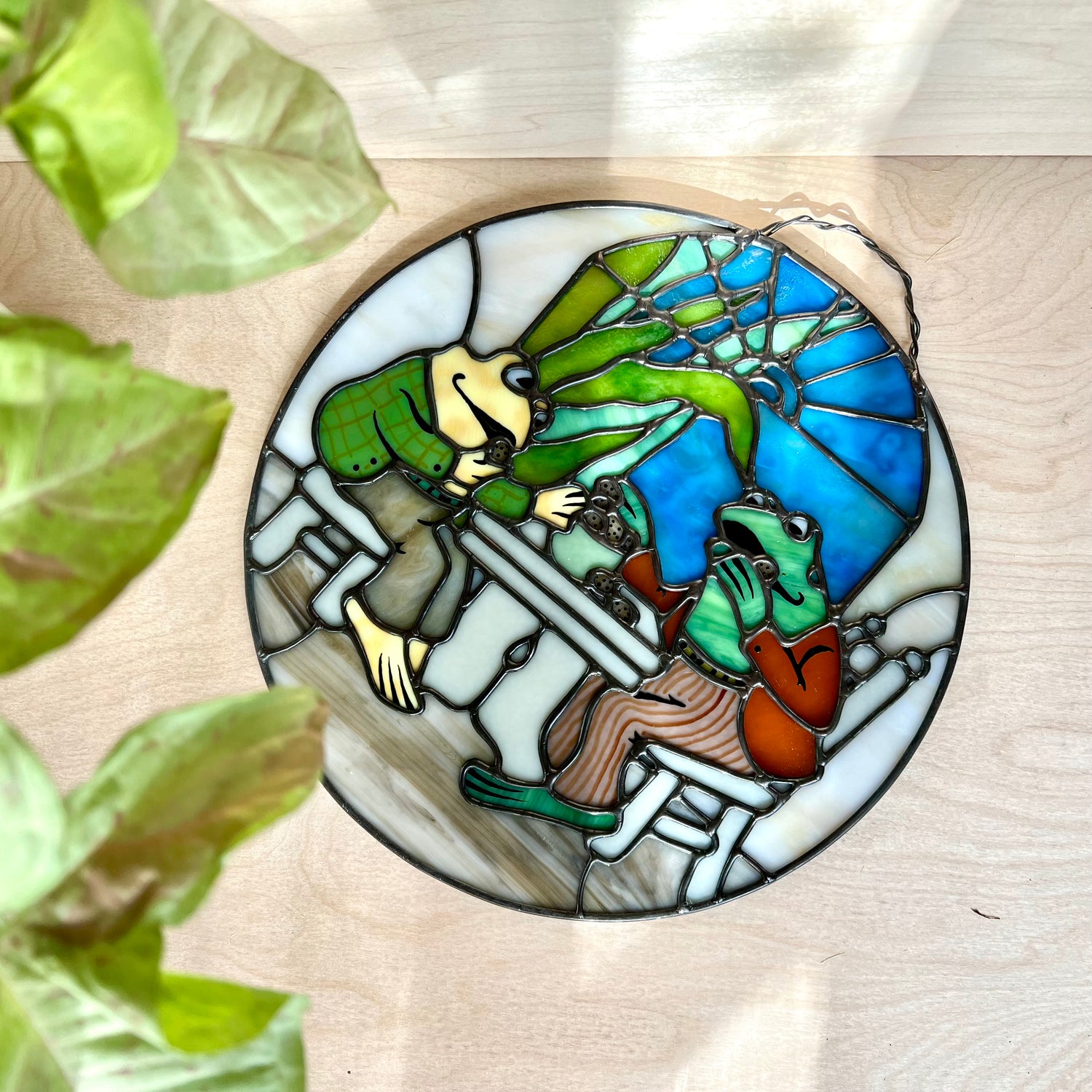 stained glass / lead tin solder / lead frame / black patina / hand painted details / zinc chain for hanging