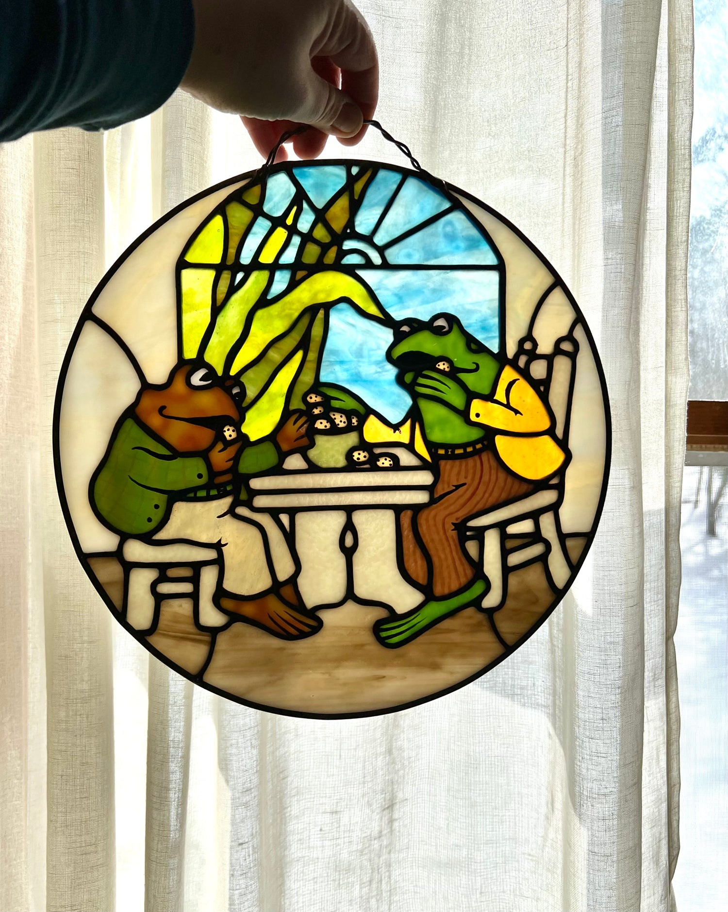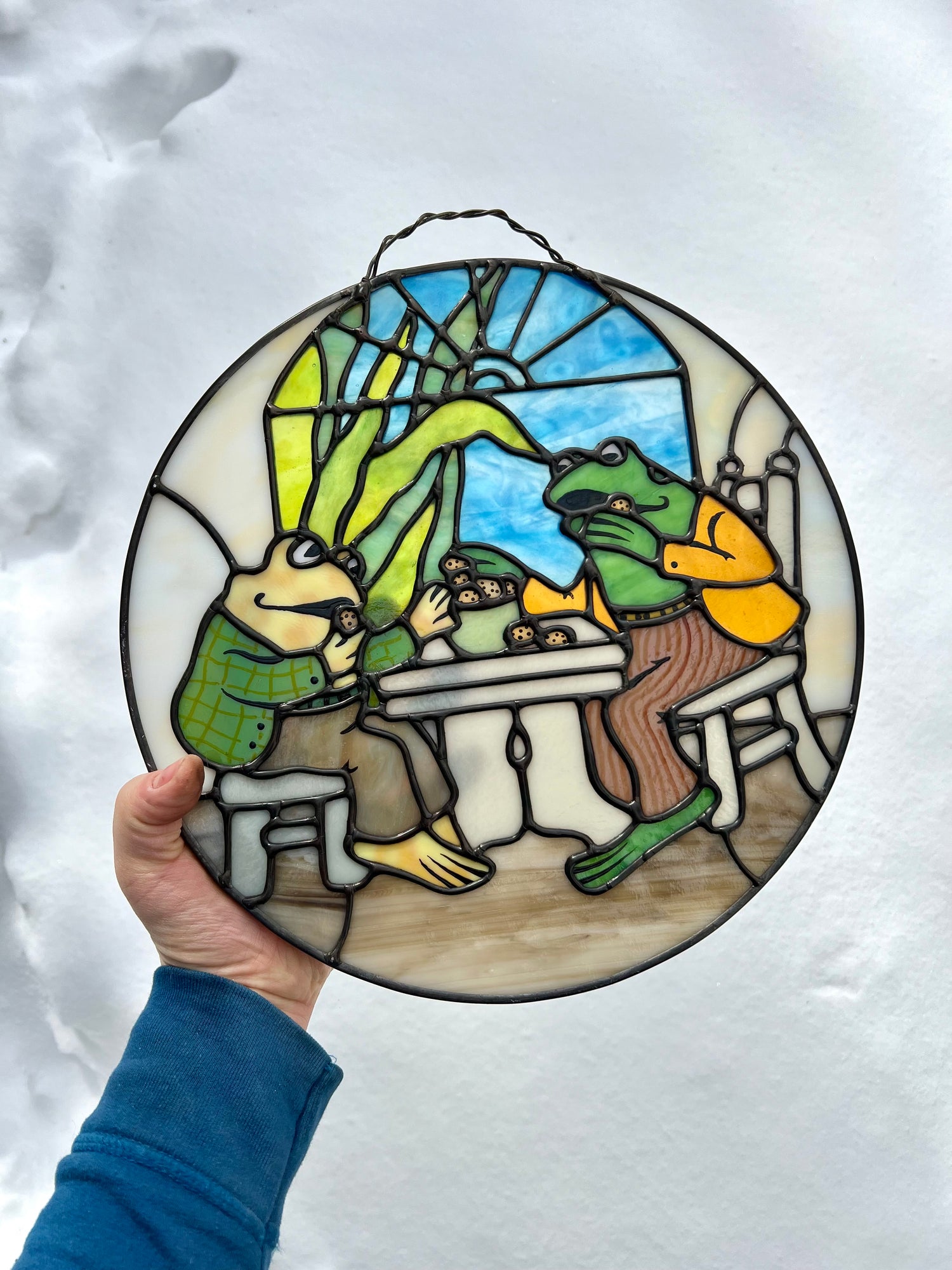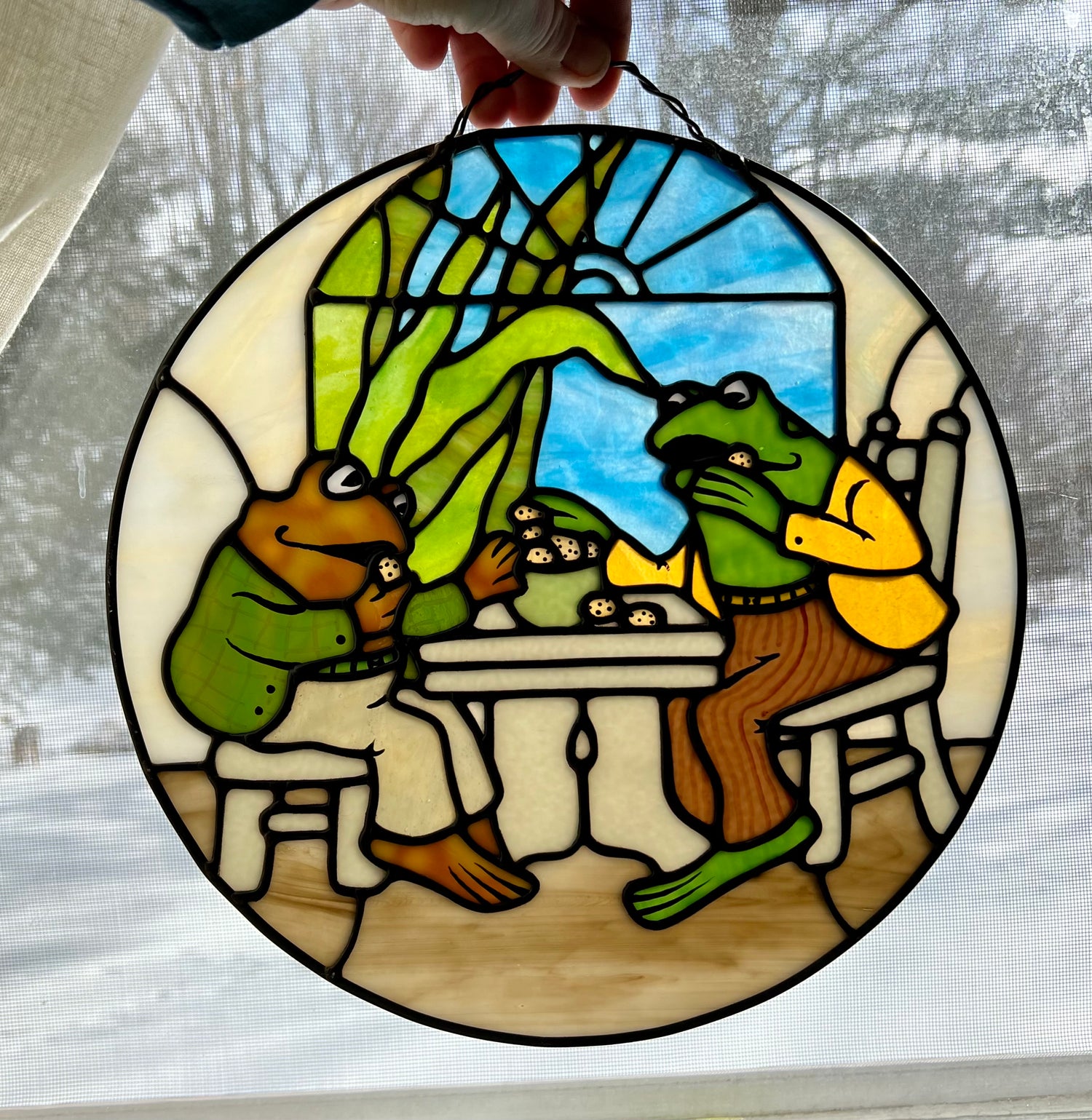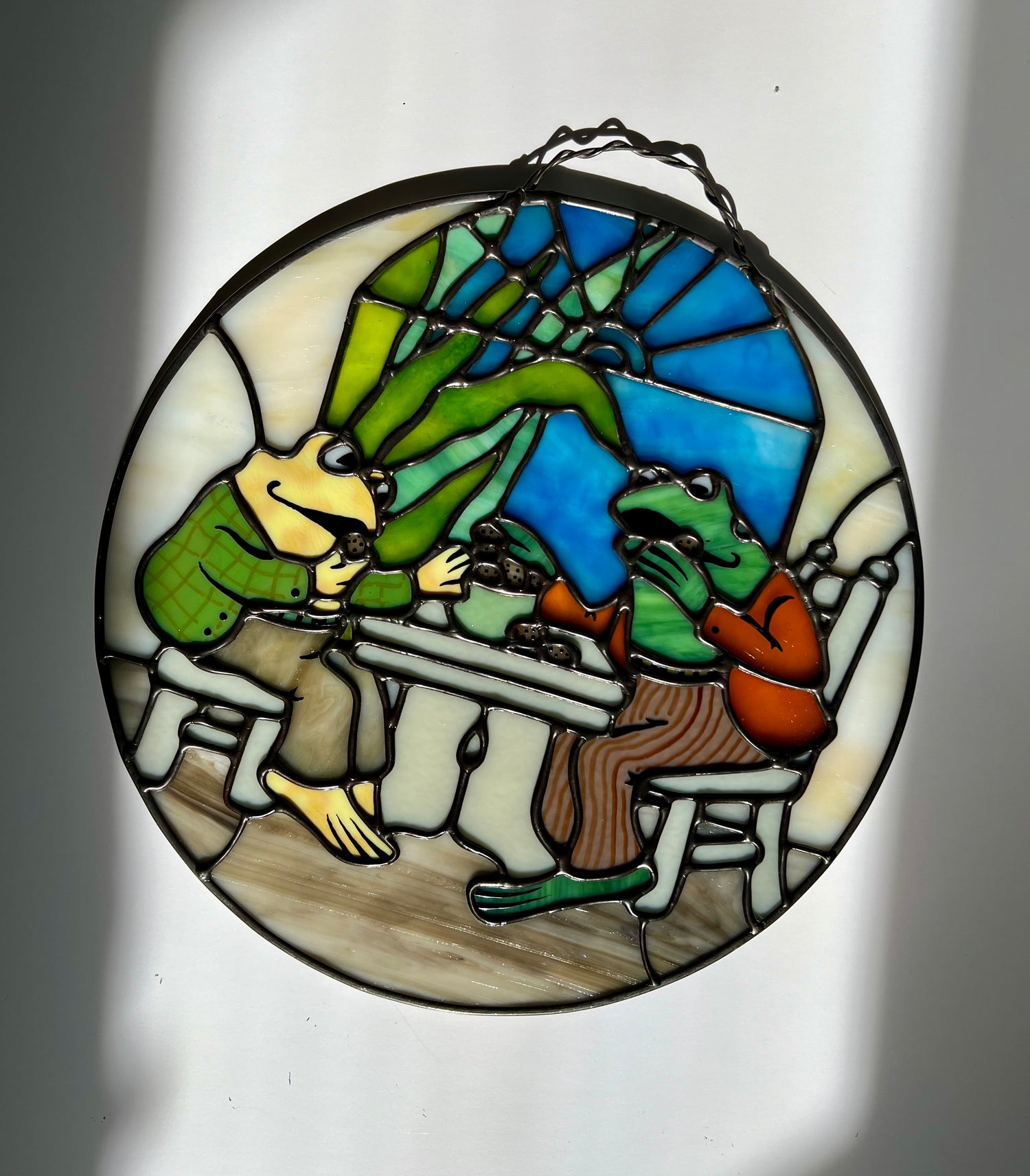 stained glass / lead tin solder / lead frame / black patina / hand painted details / zinc chain for hanging