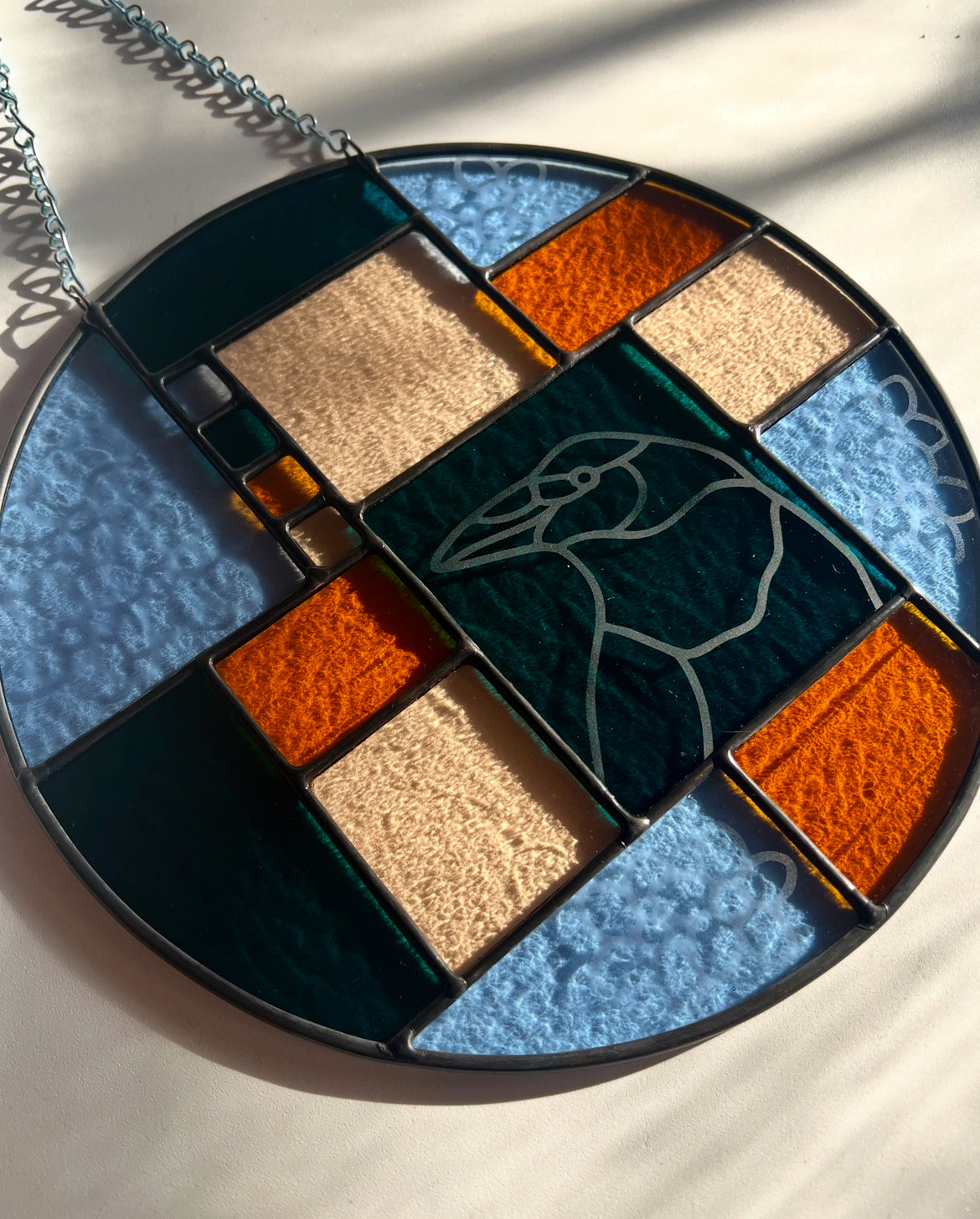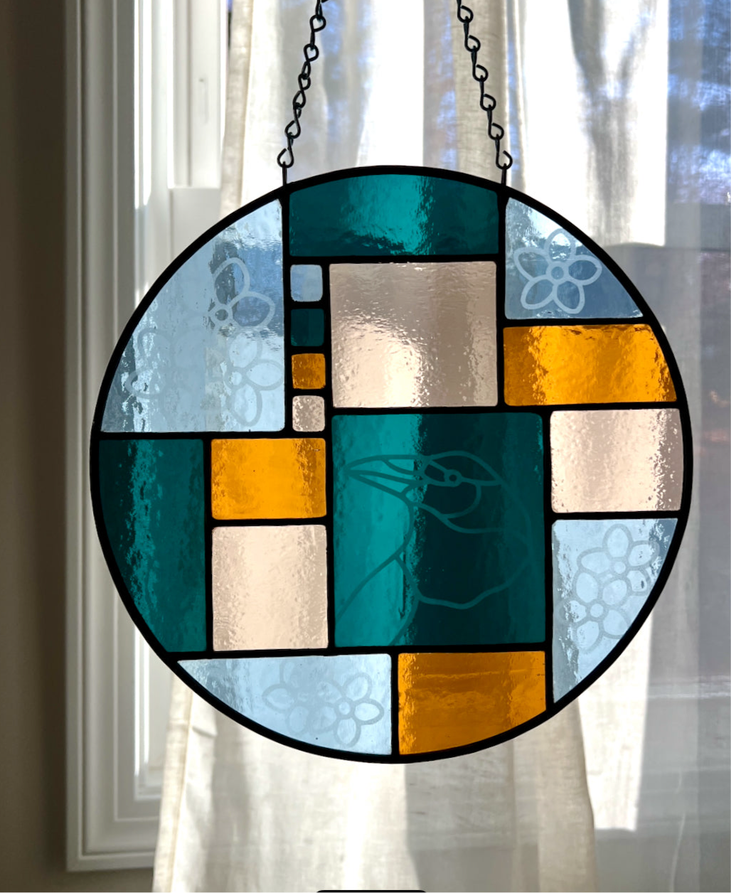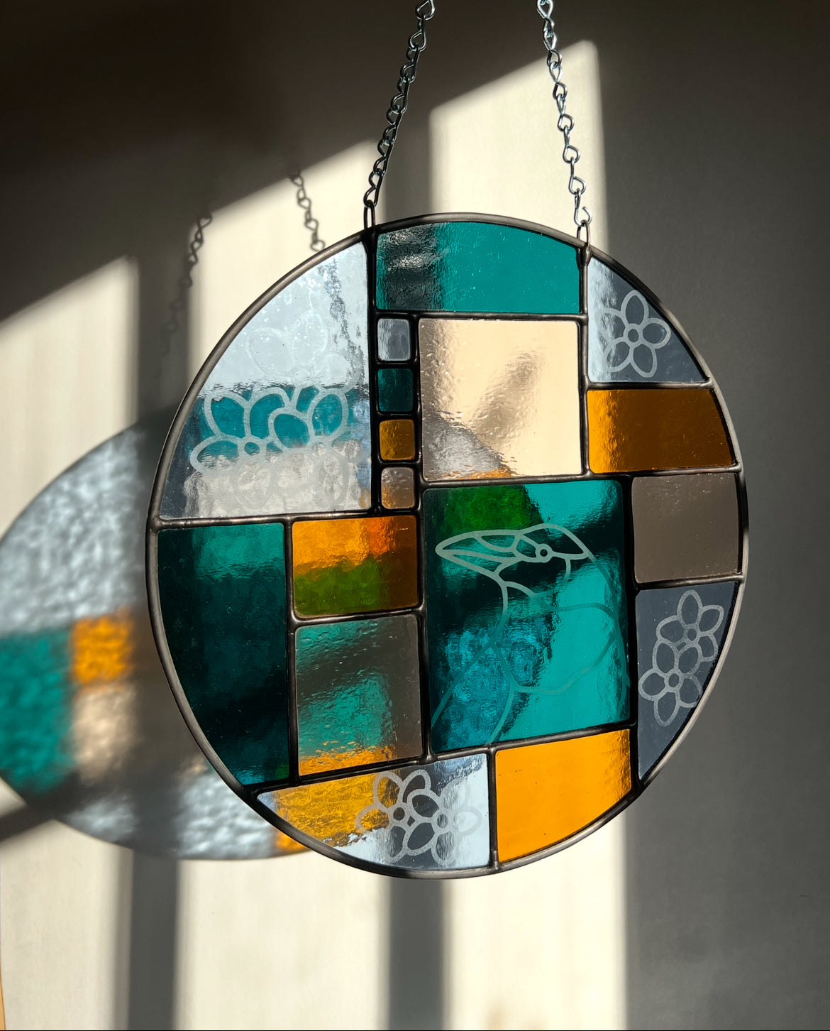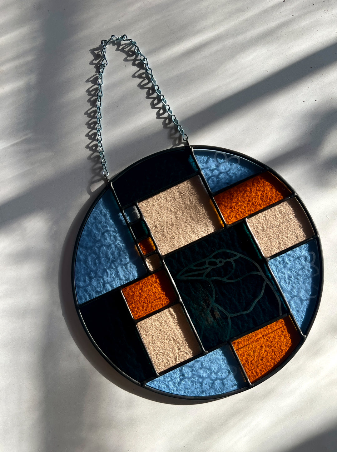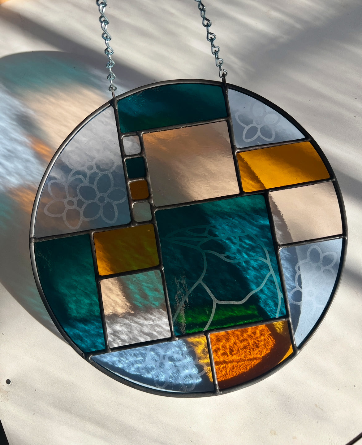 stained glass / lead tin solder / black patina / etched details / lead came / zinc chain