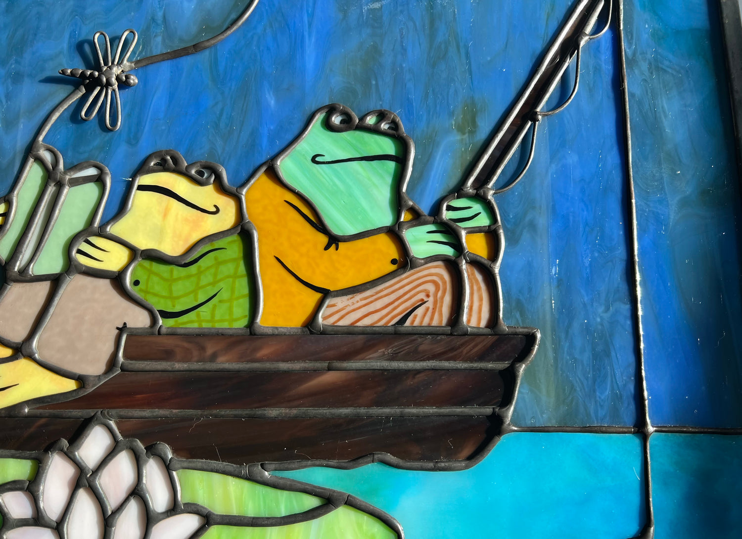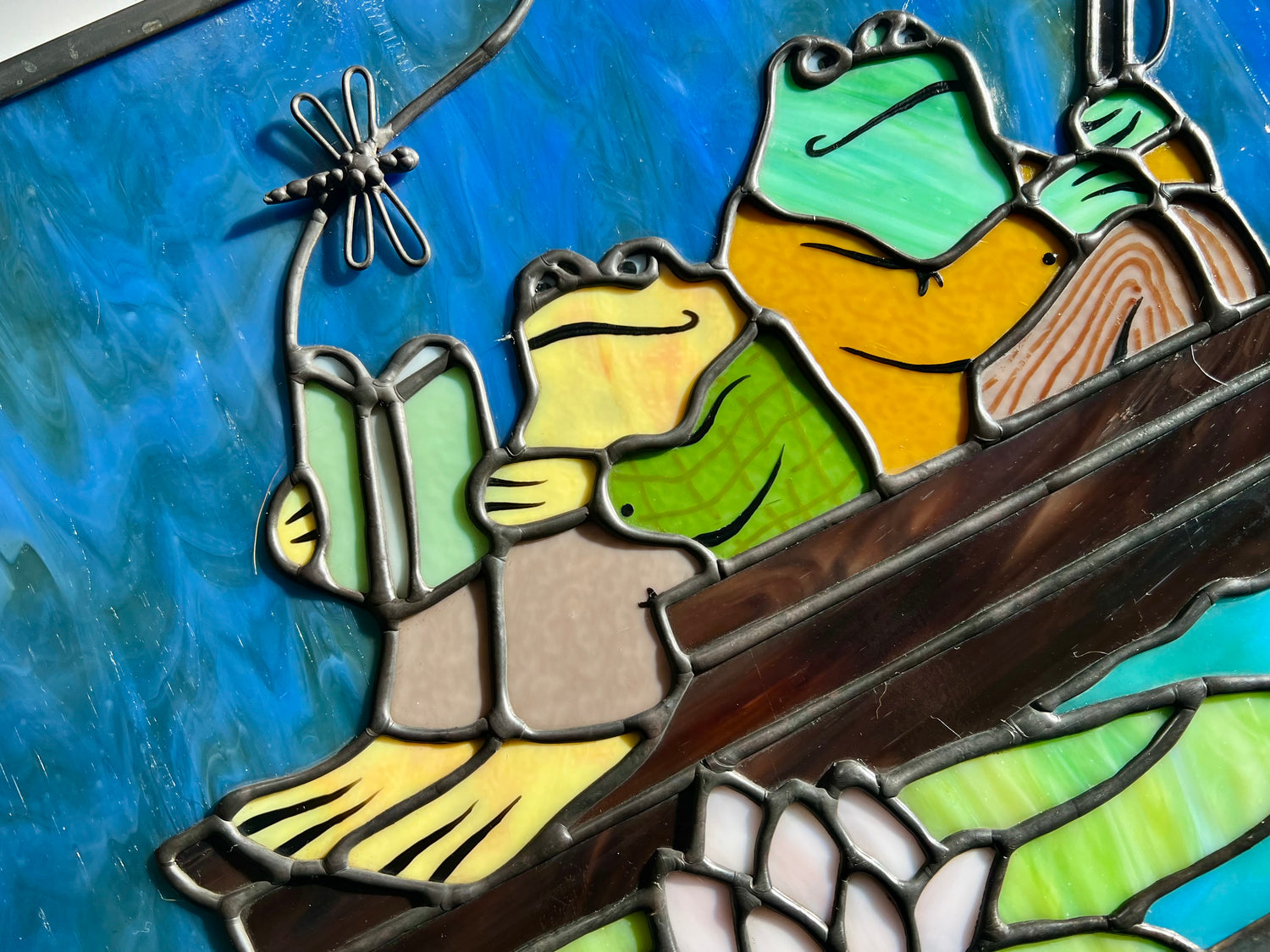 stained glass / lead tin solder / zinc frame / black patina / hand painted details / wire details / solder details / zinc chain for hanging