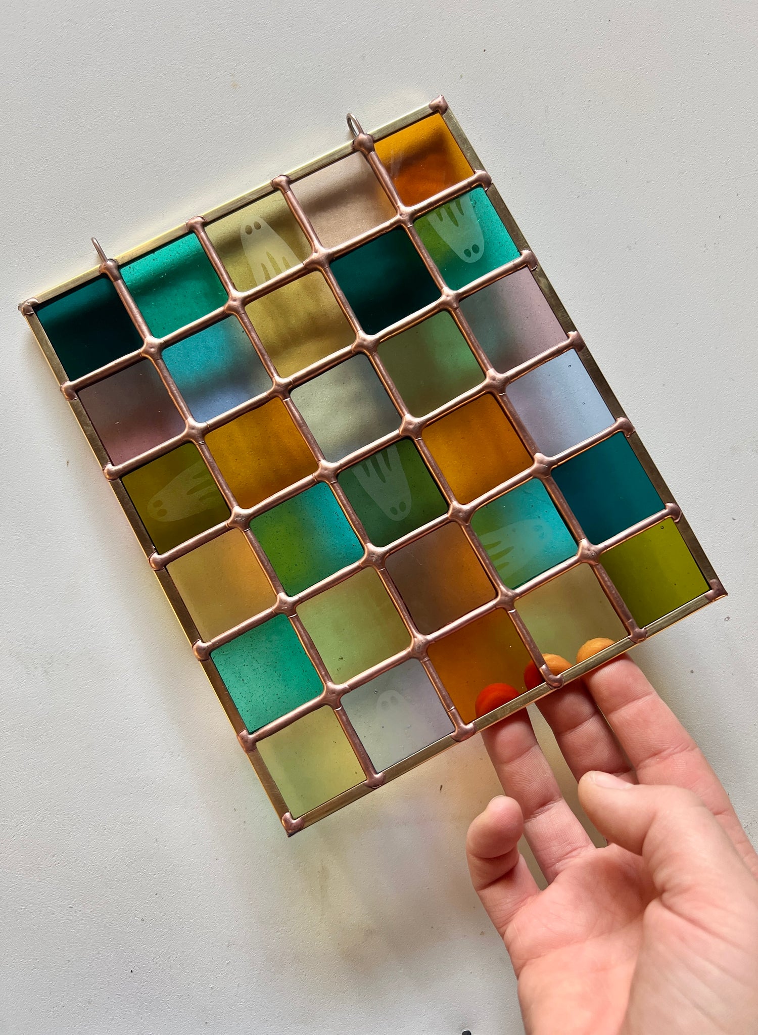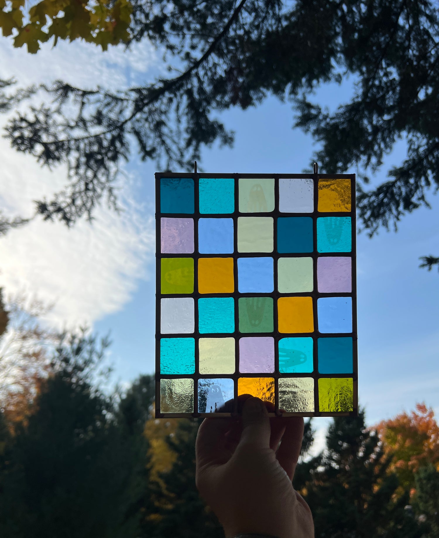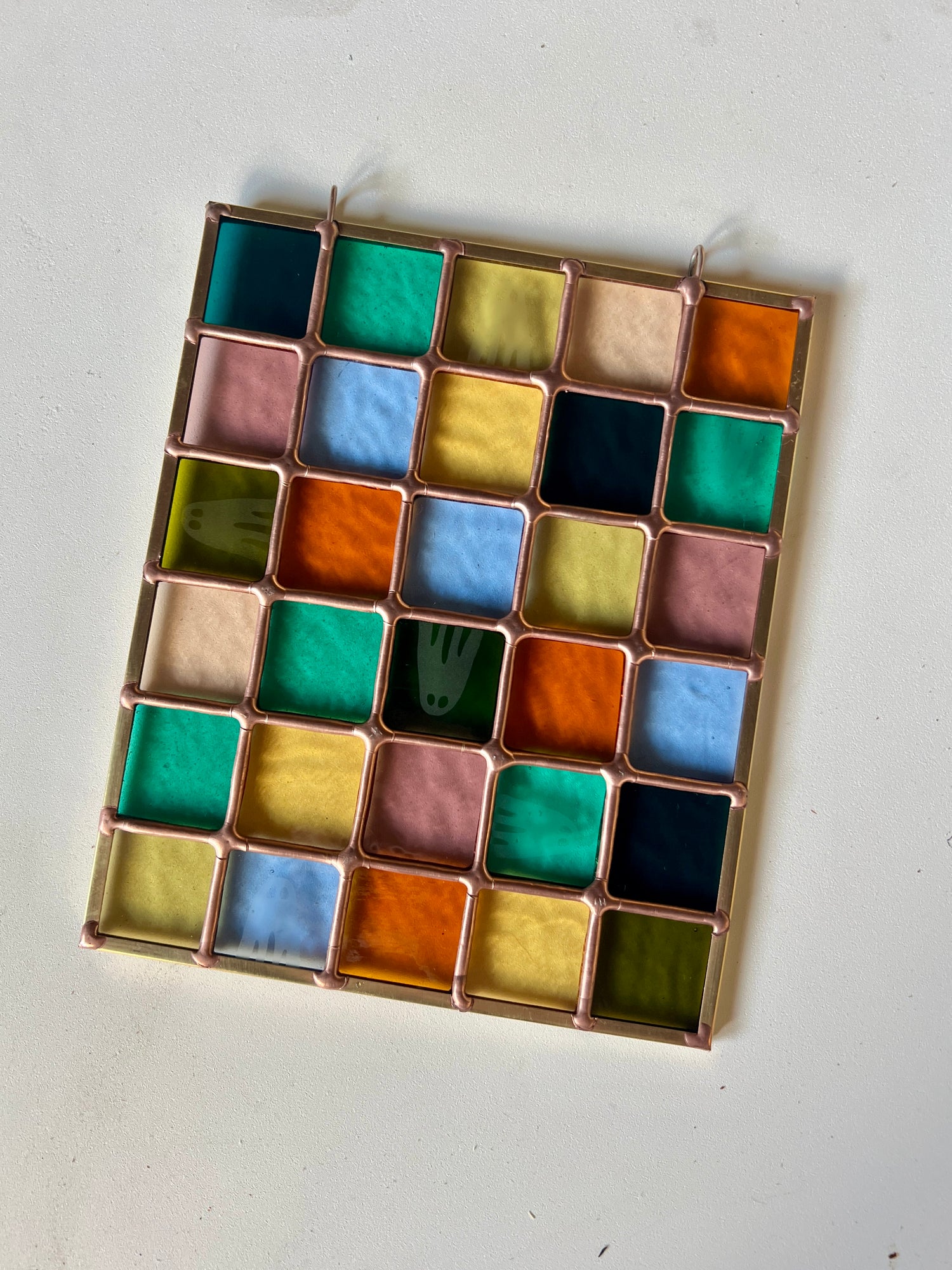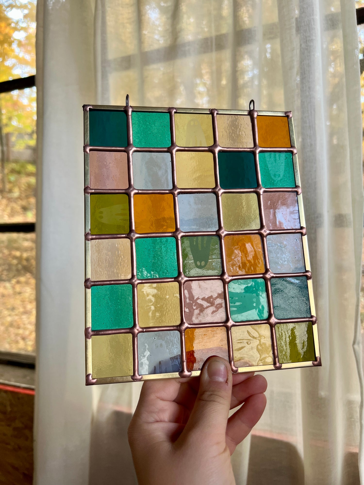stained glass / lead tin solder / etched details / brass came / copper patina