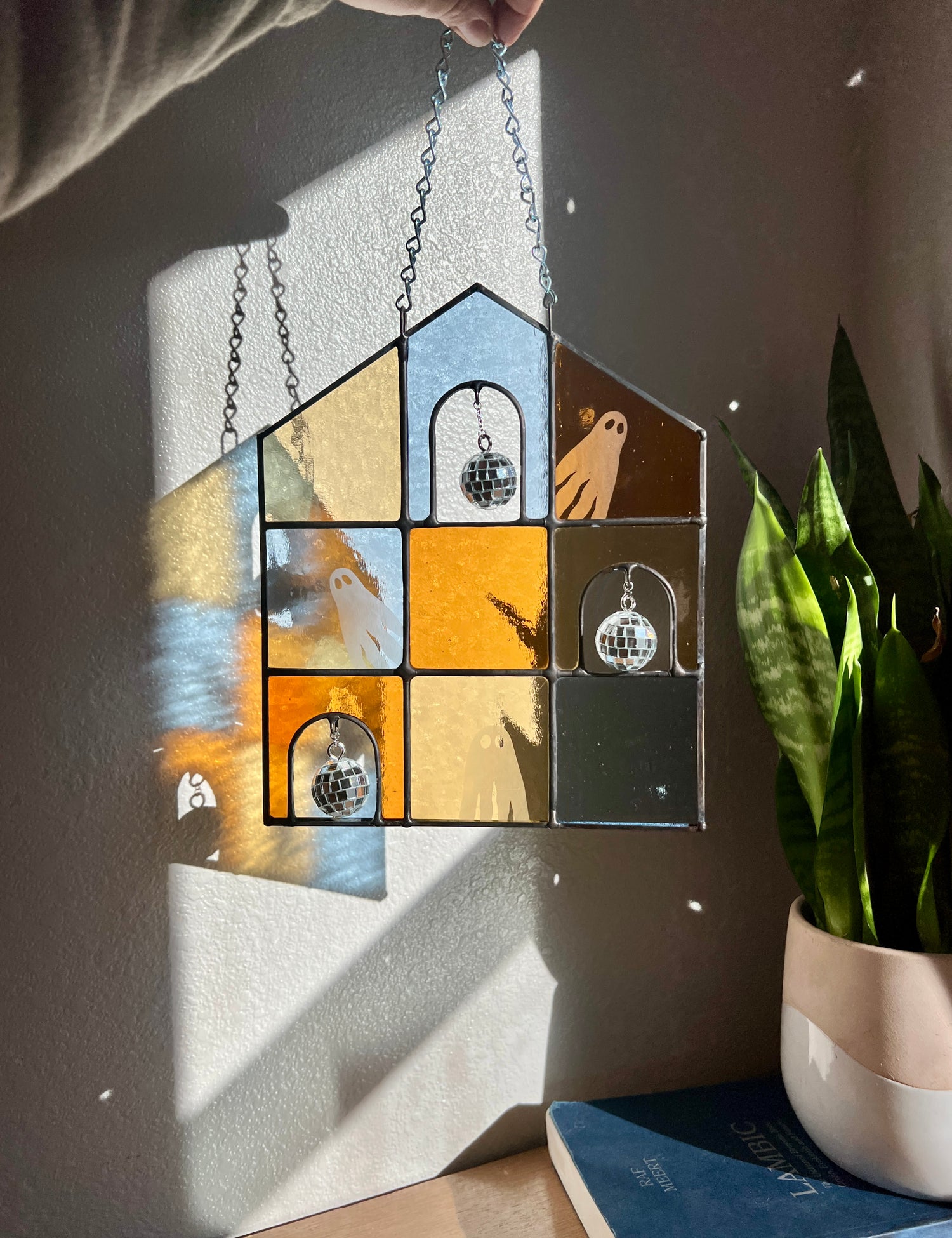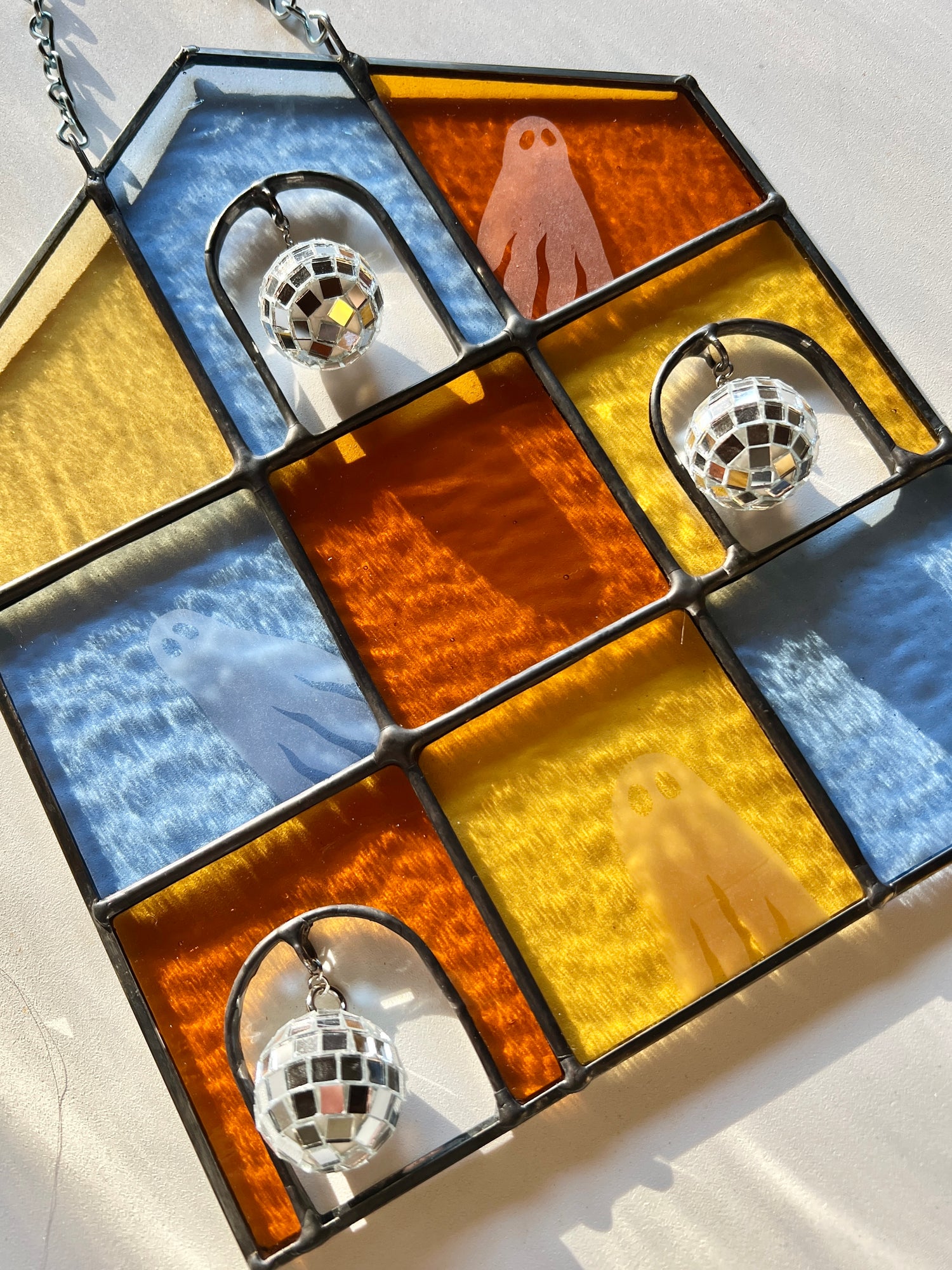 stained glass / lead-tin solder / etched details / black patina / zinc frame / disco ball charms / zinc chain