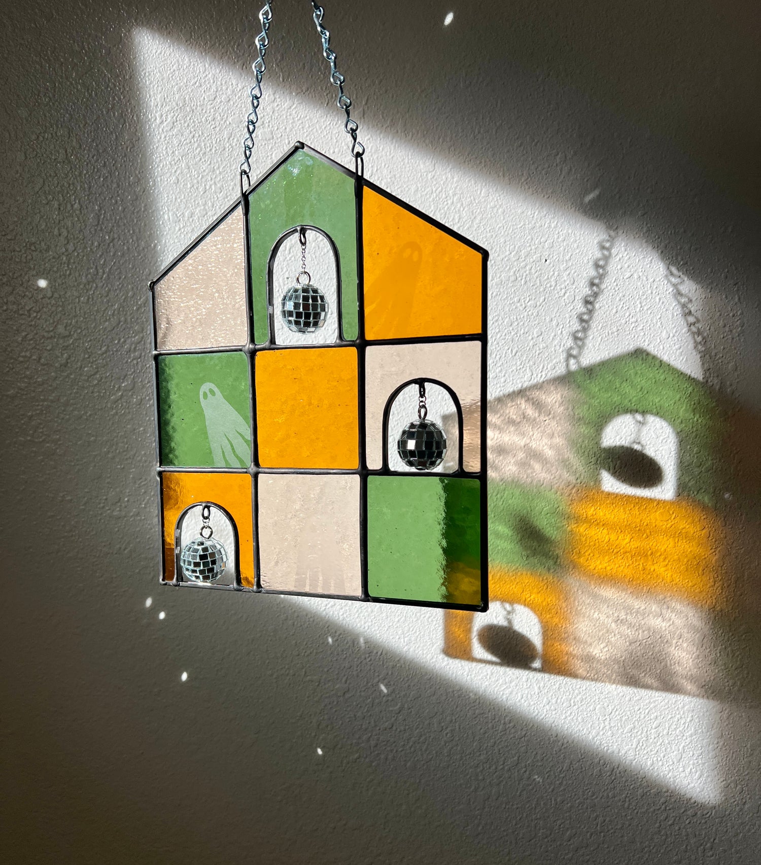 stained glass / lead-tin solder / etched details / black patina / zinc frame / disco ball charms / zinc chain