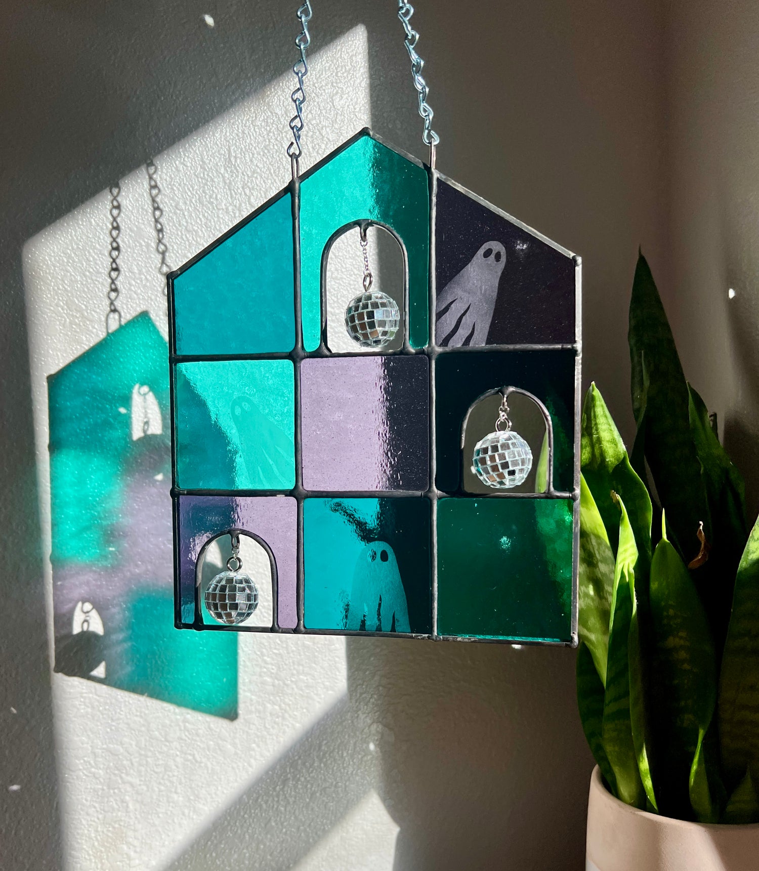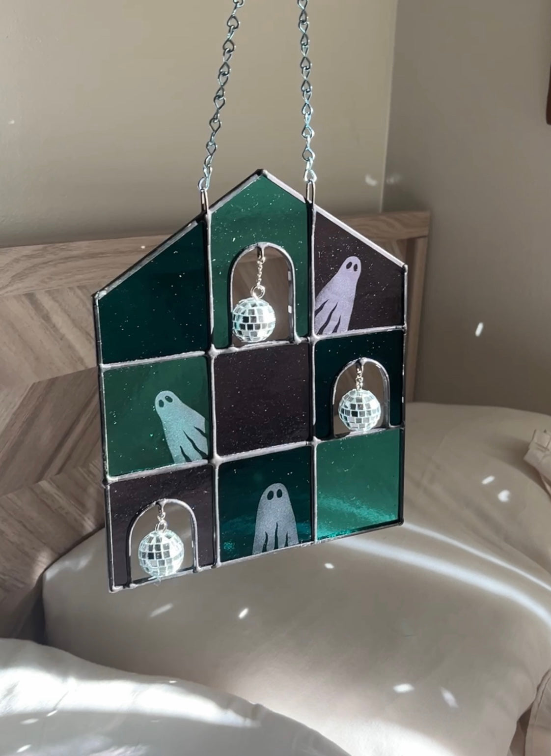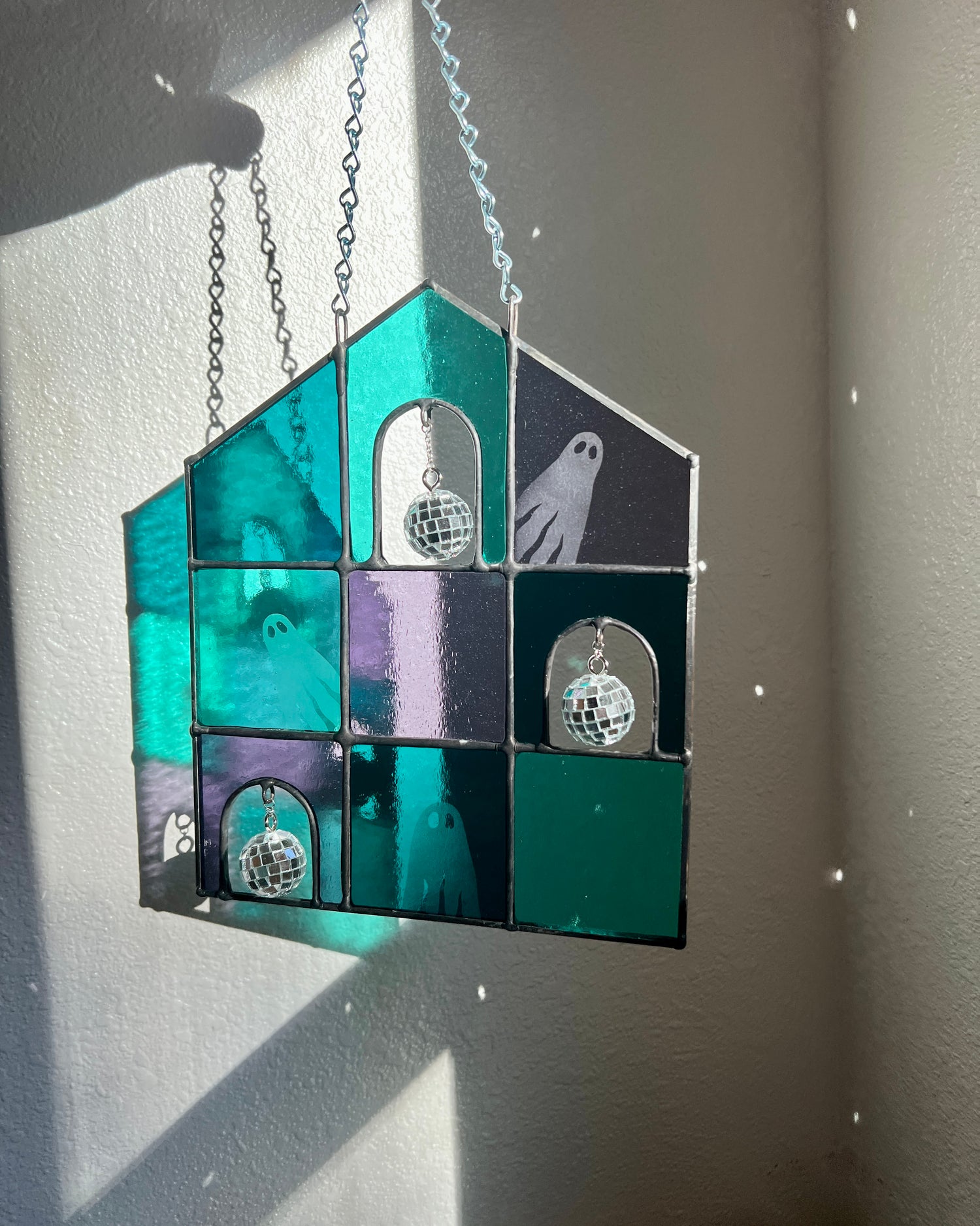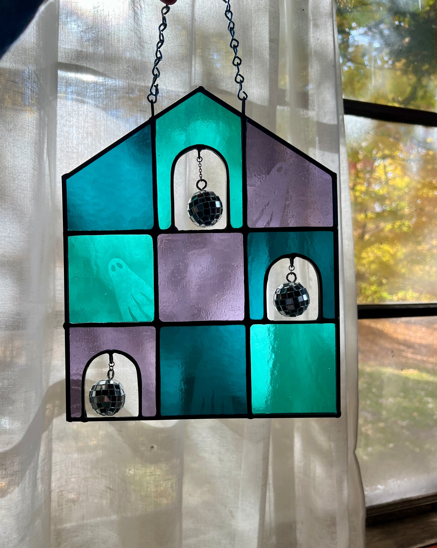 stained glass / lead-tin solder / etched details / black patina / zinc frame / disco ball charms / zinc chain