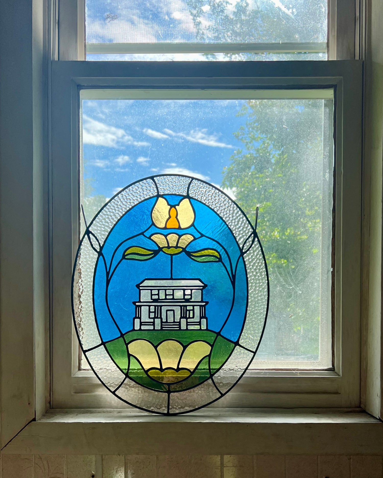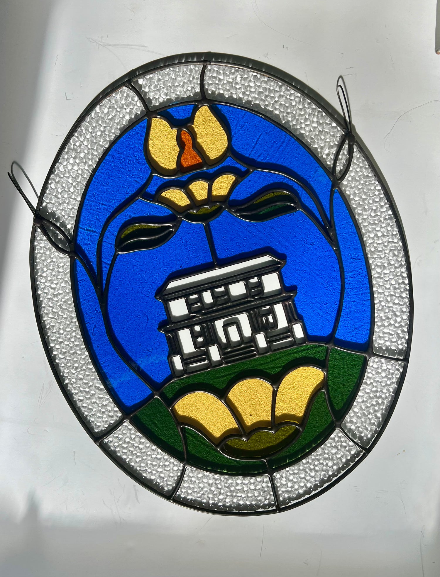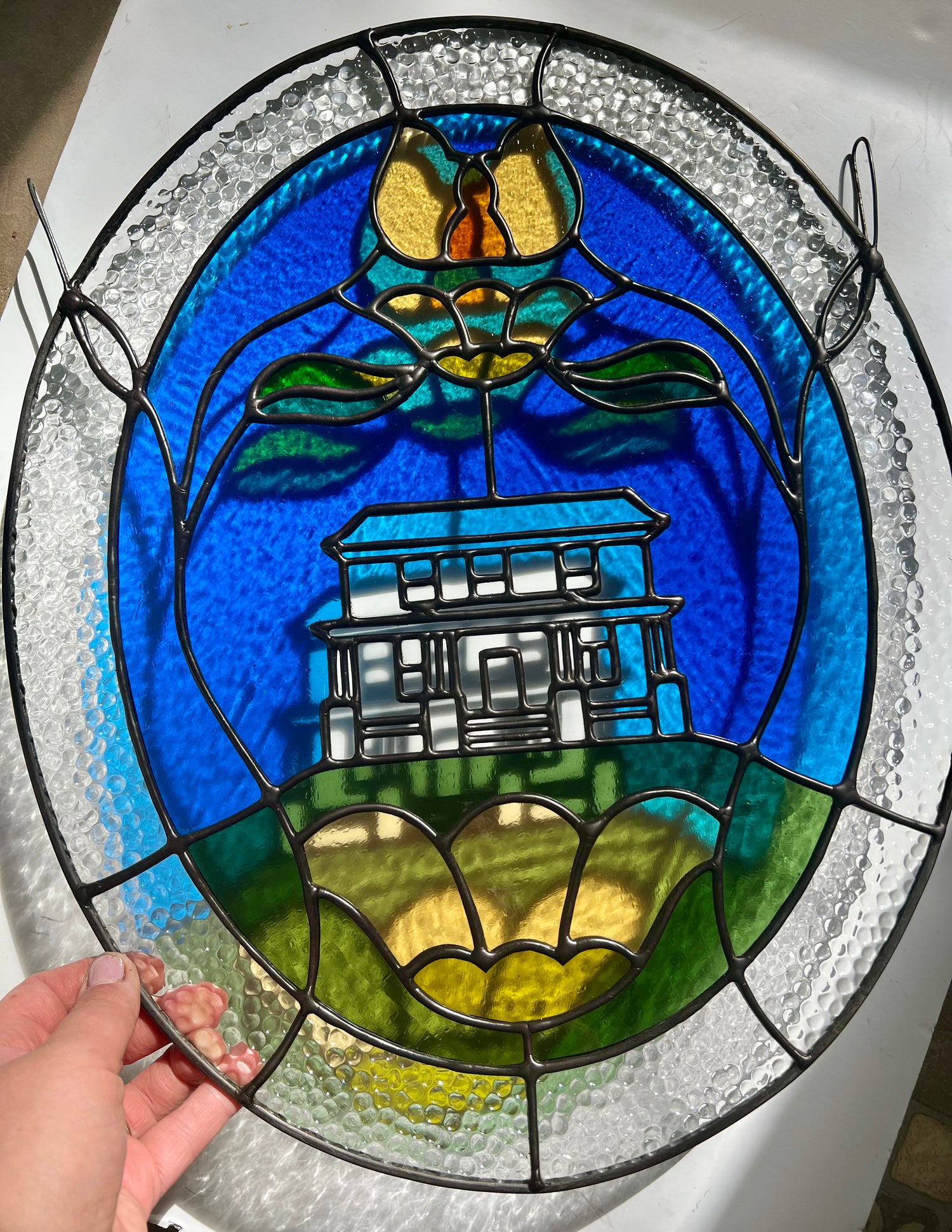 stained glass / lead-tin solder / lead came / black patina / zinc chain