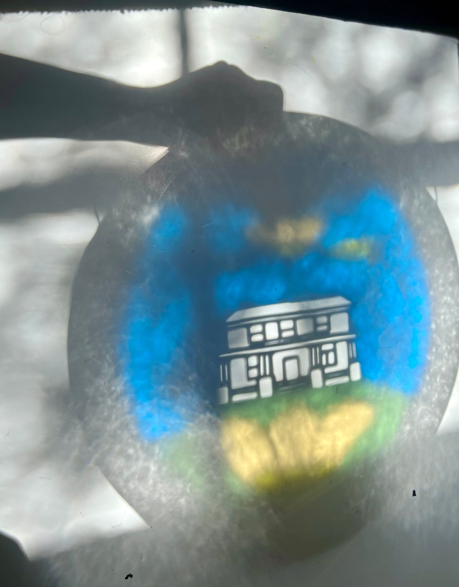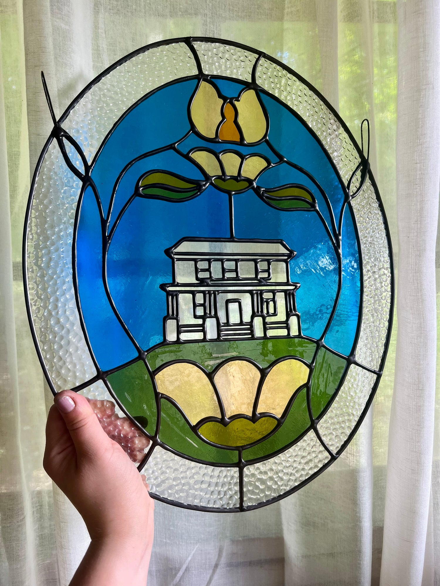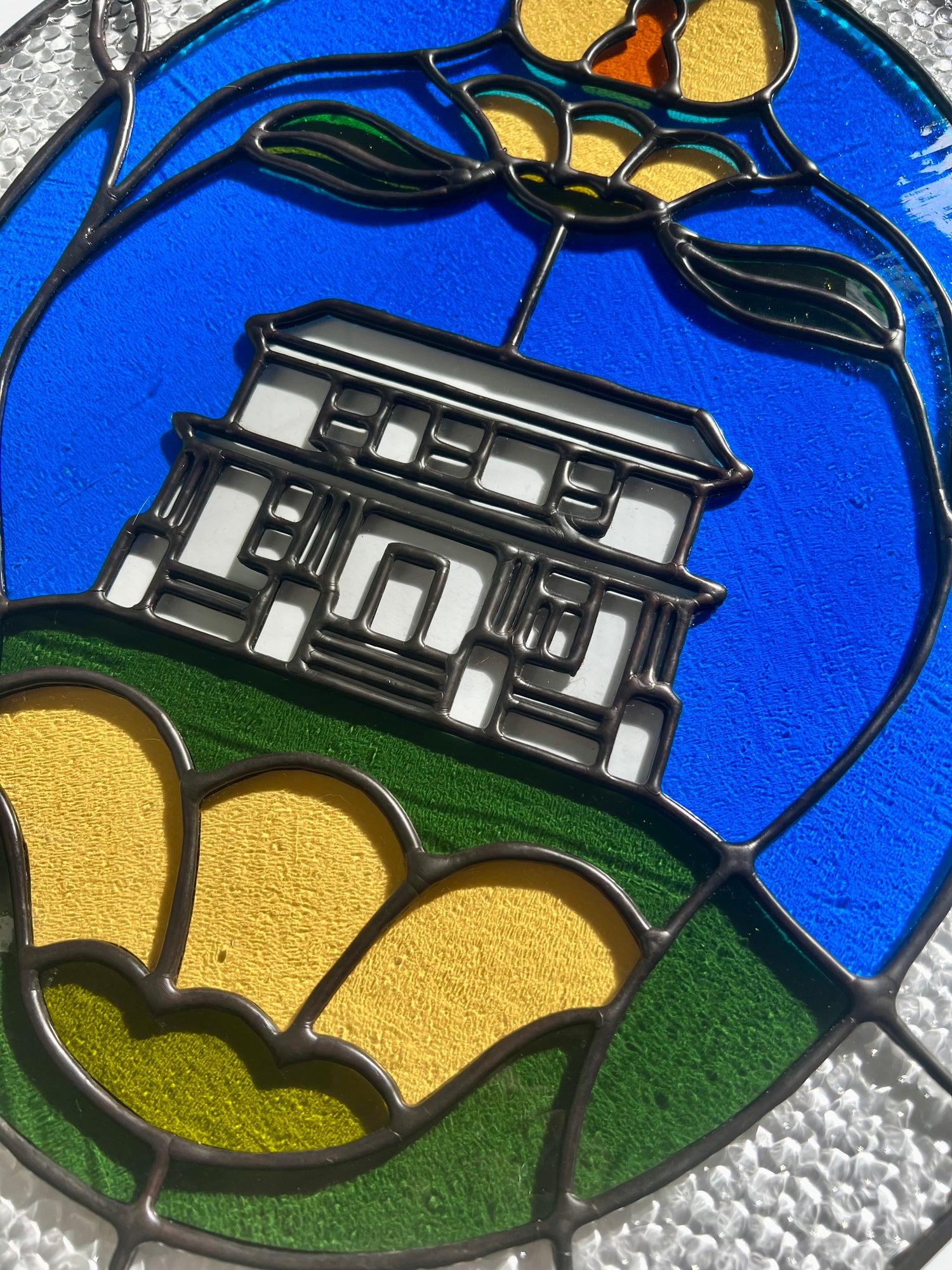 stained glass / lead-tin solder / lead came / black patina / zinc chain