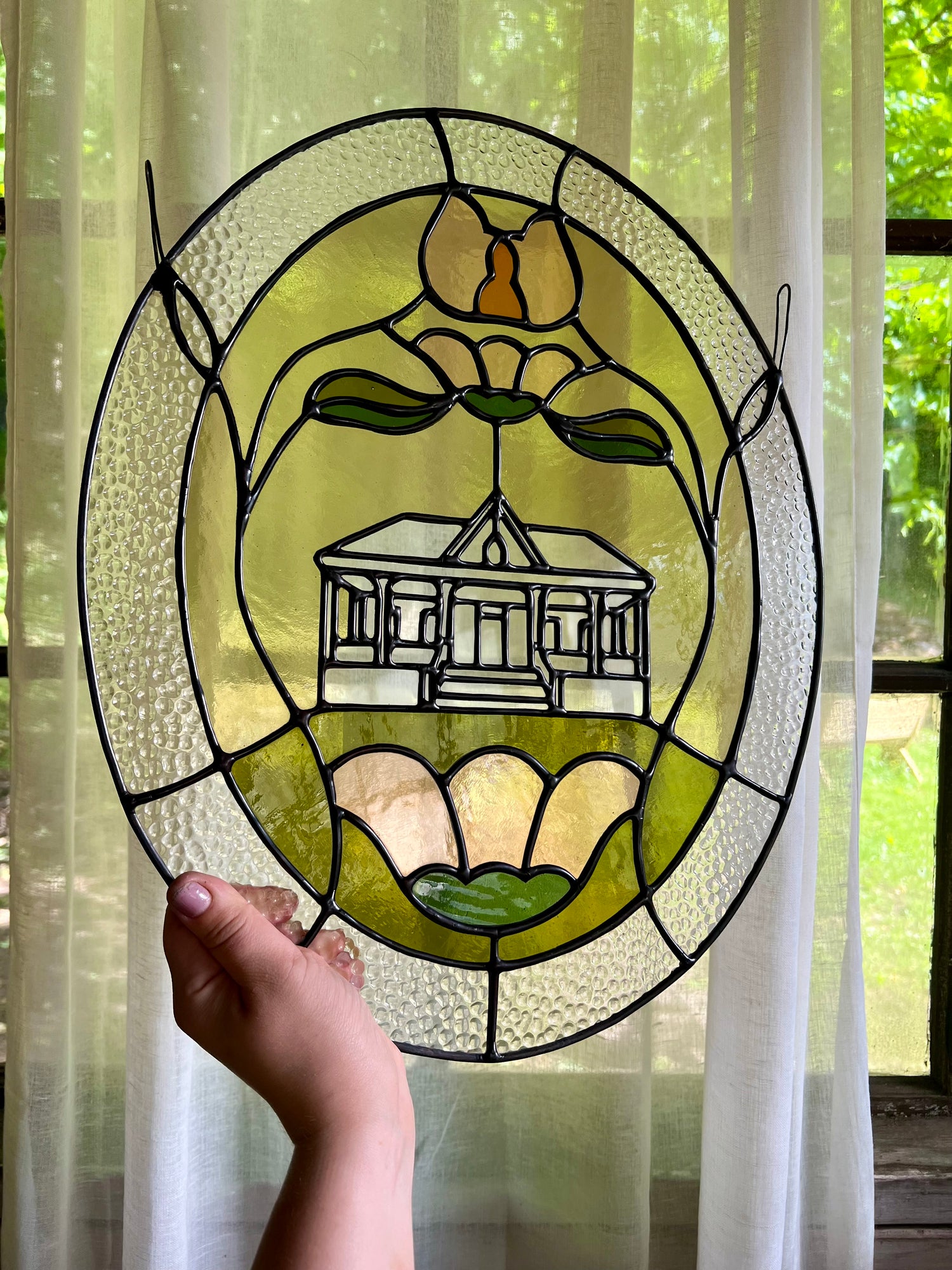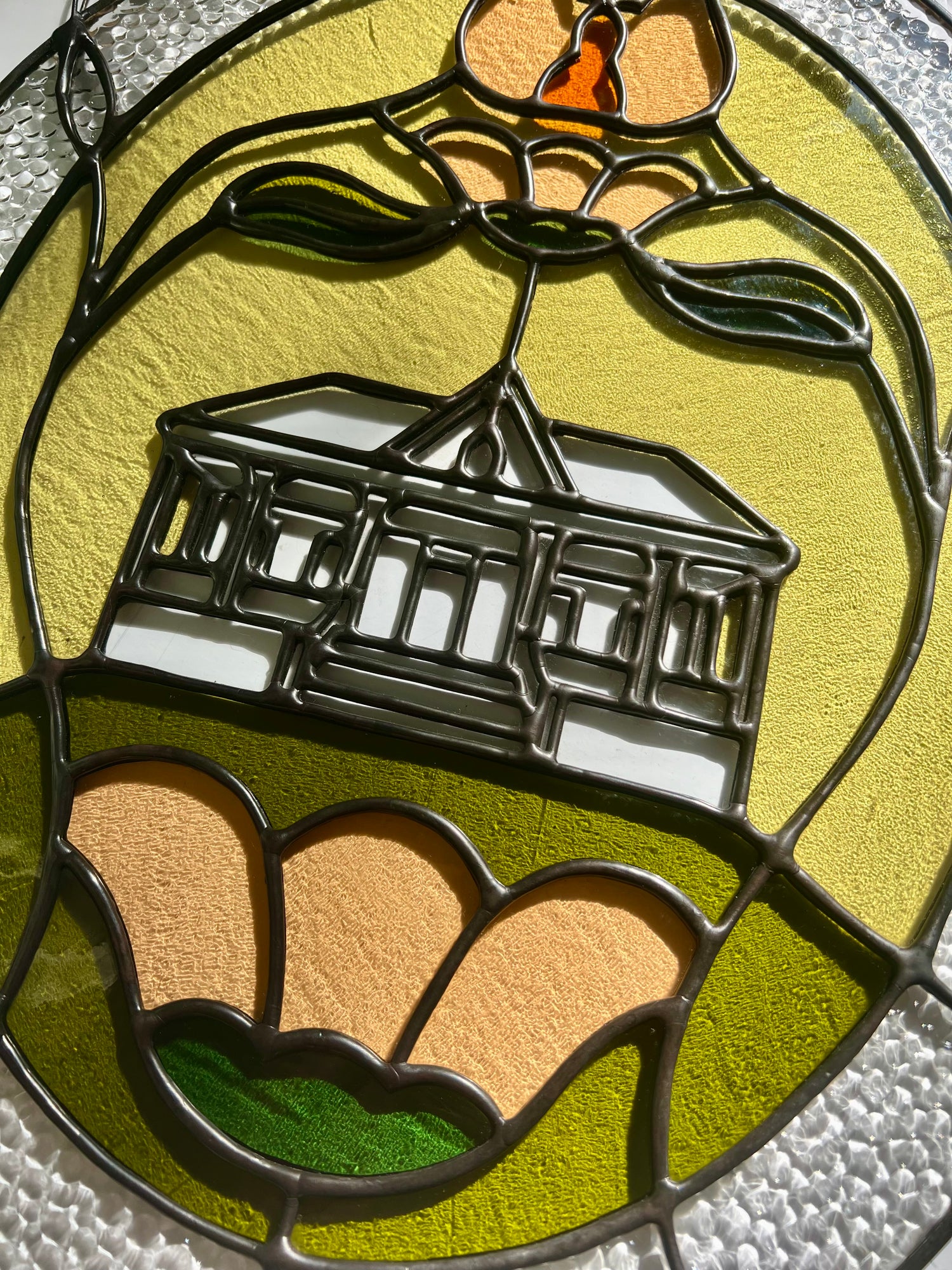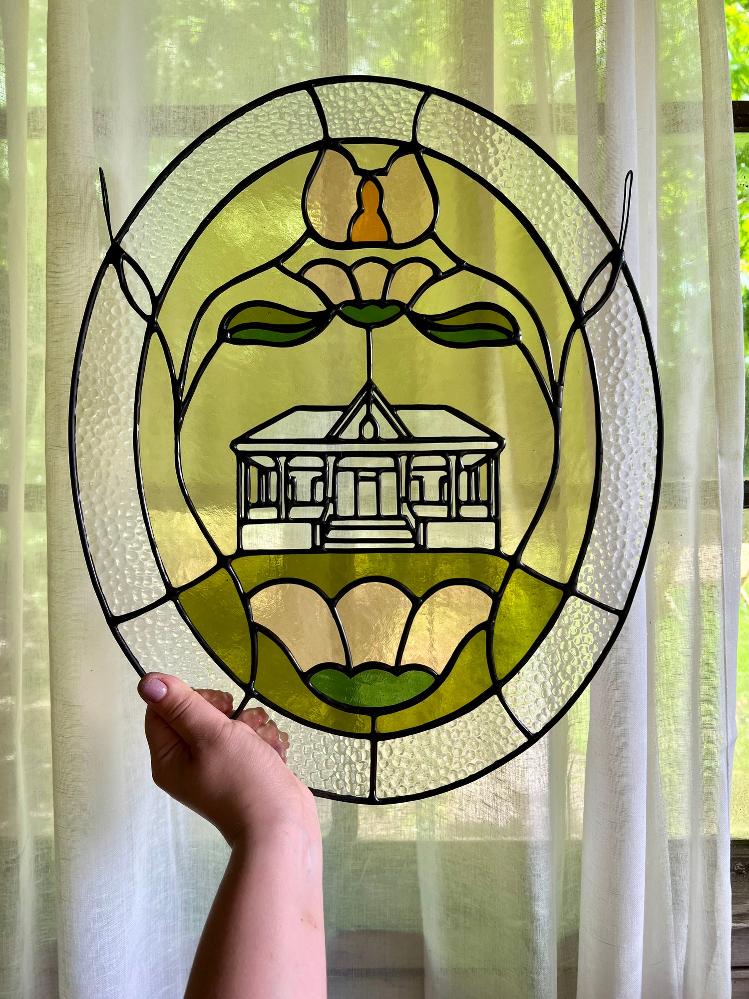 stained glass / lead-tin solder / lead came / black patina / zinc chain