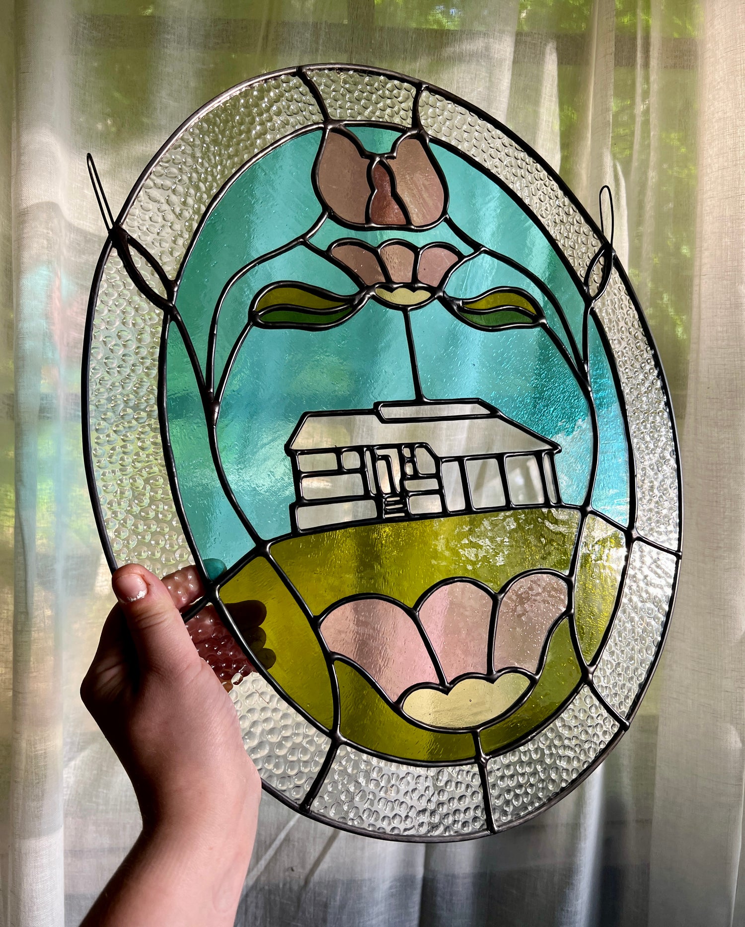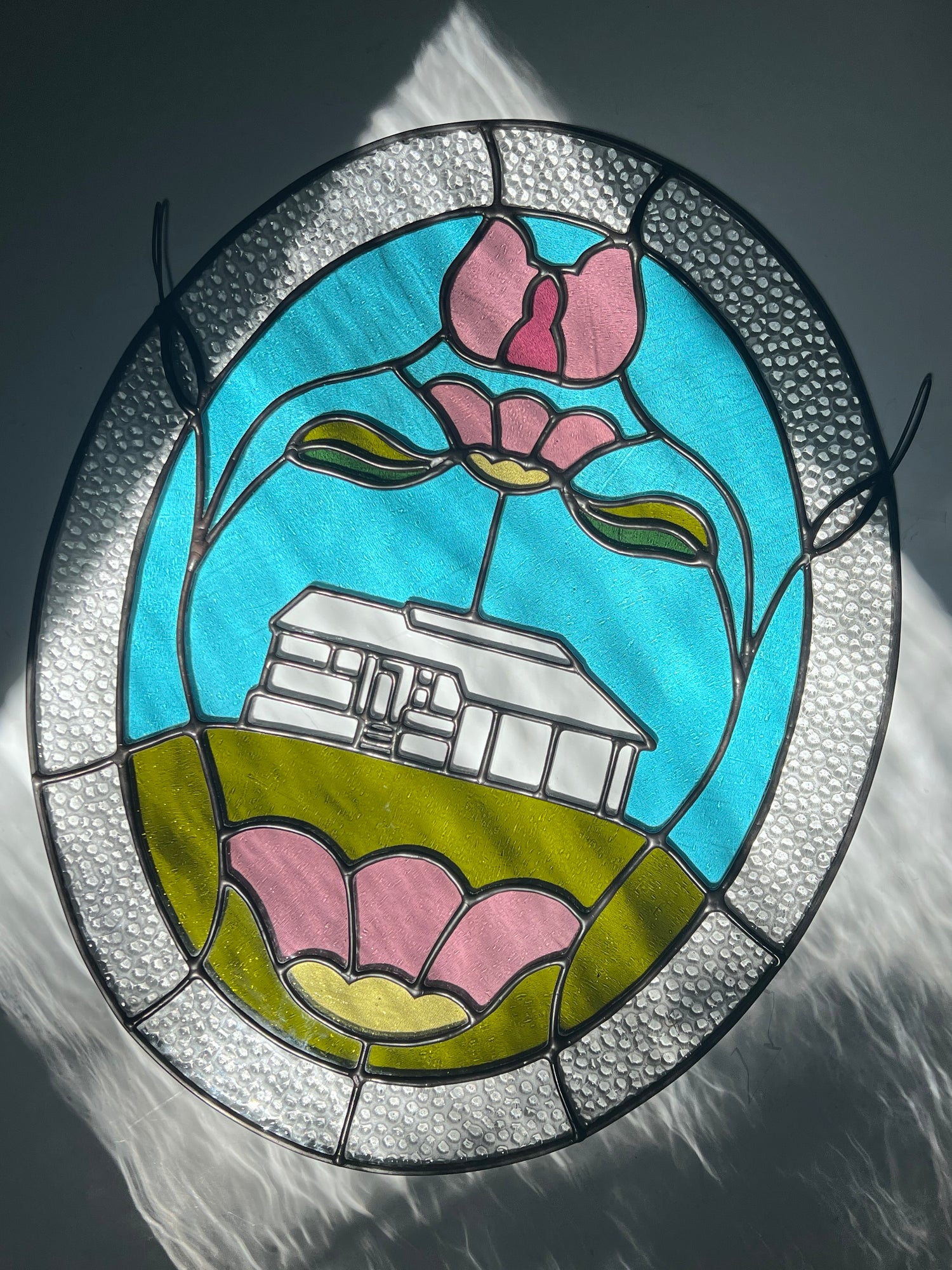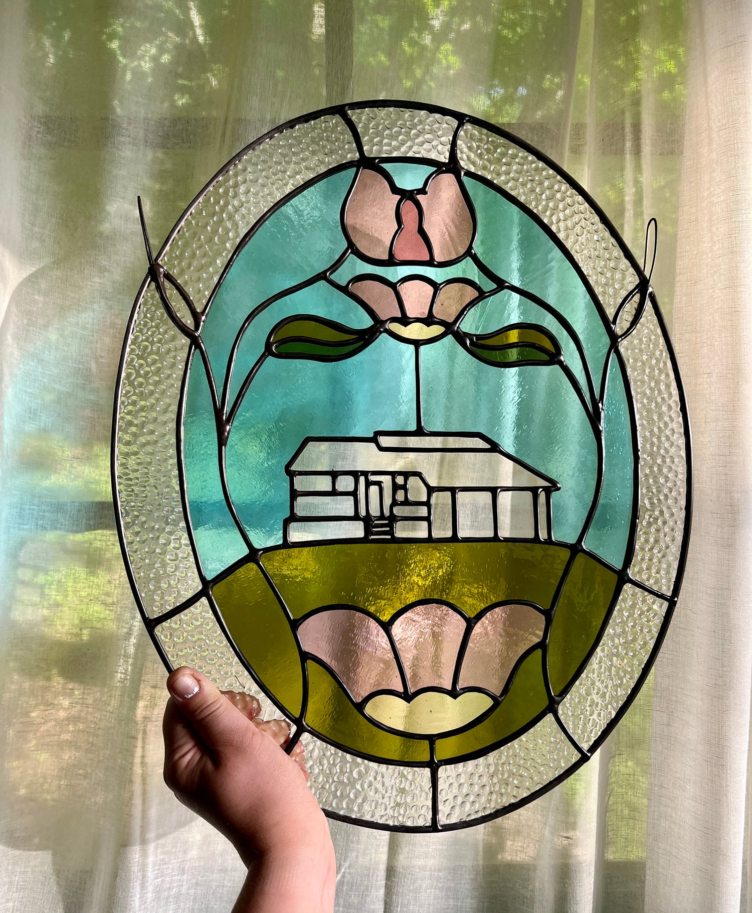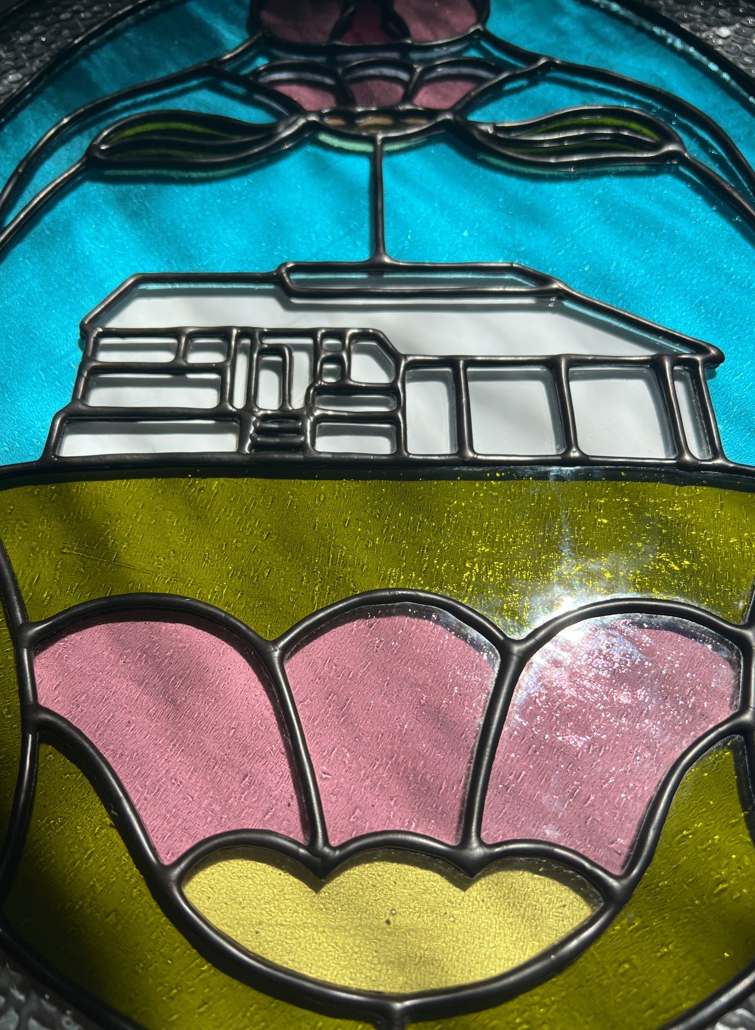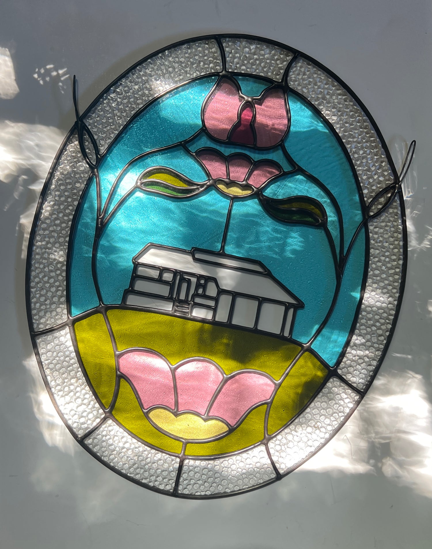 stained glass / lead-tin solder / lead came / black patina / zinc chain