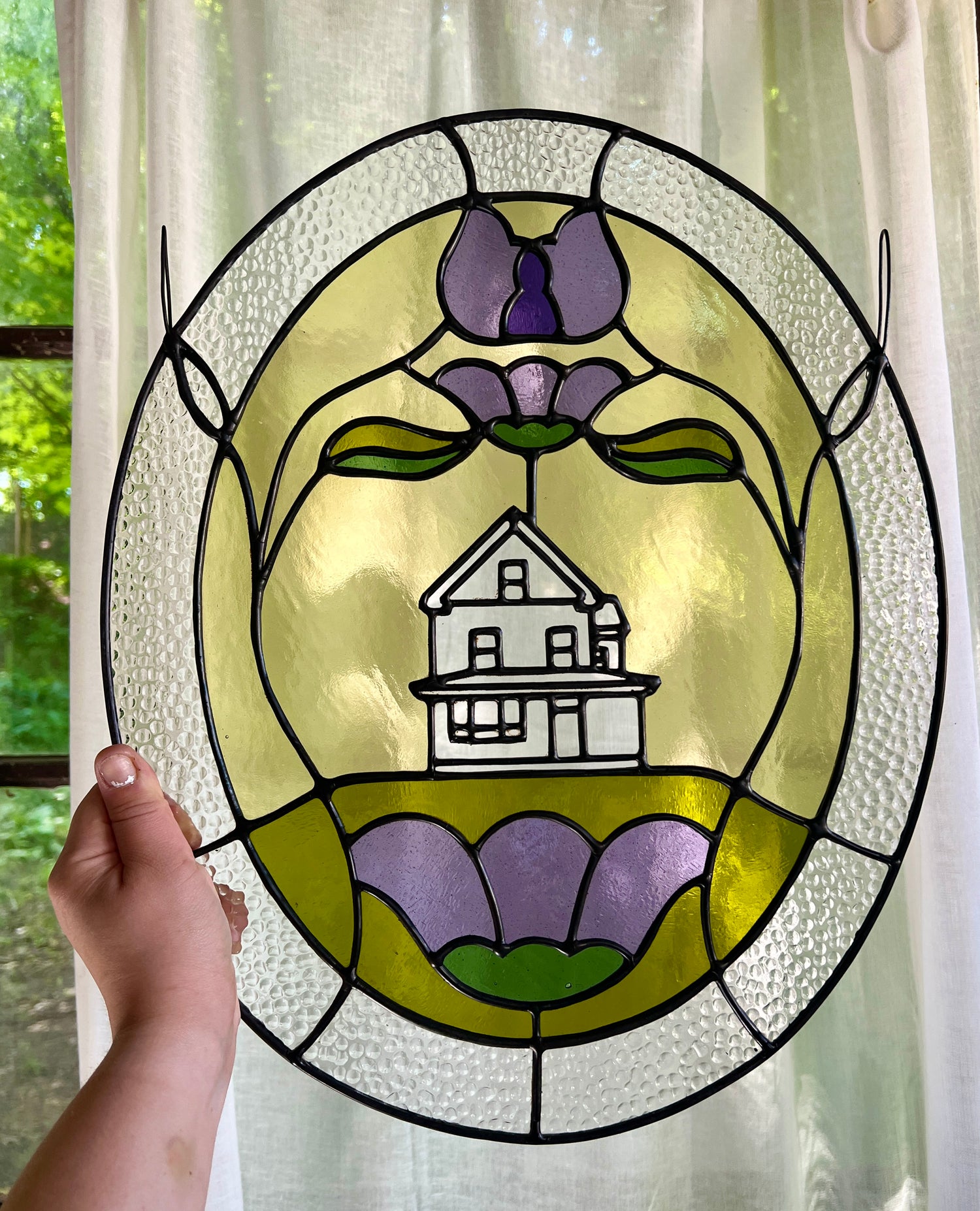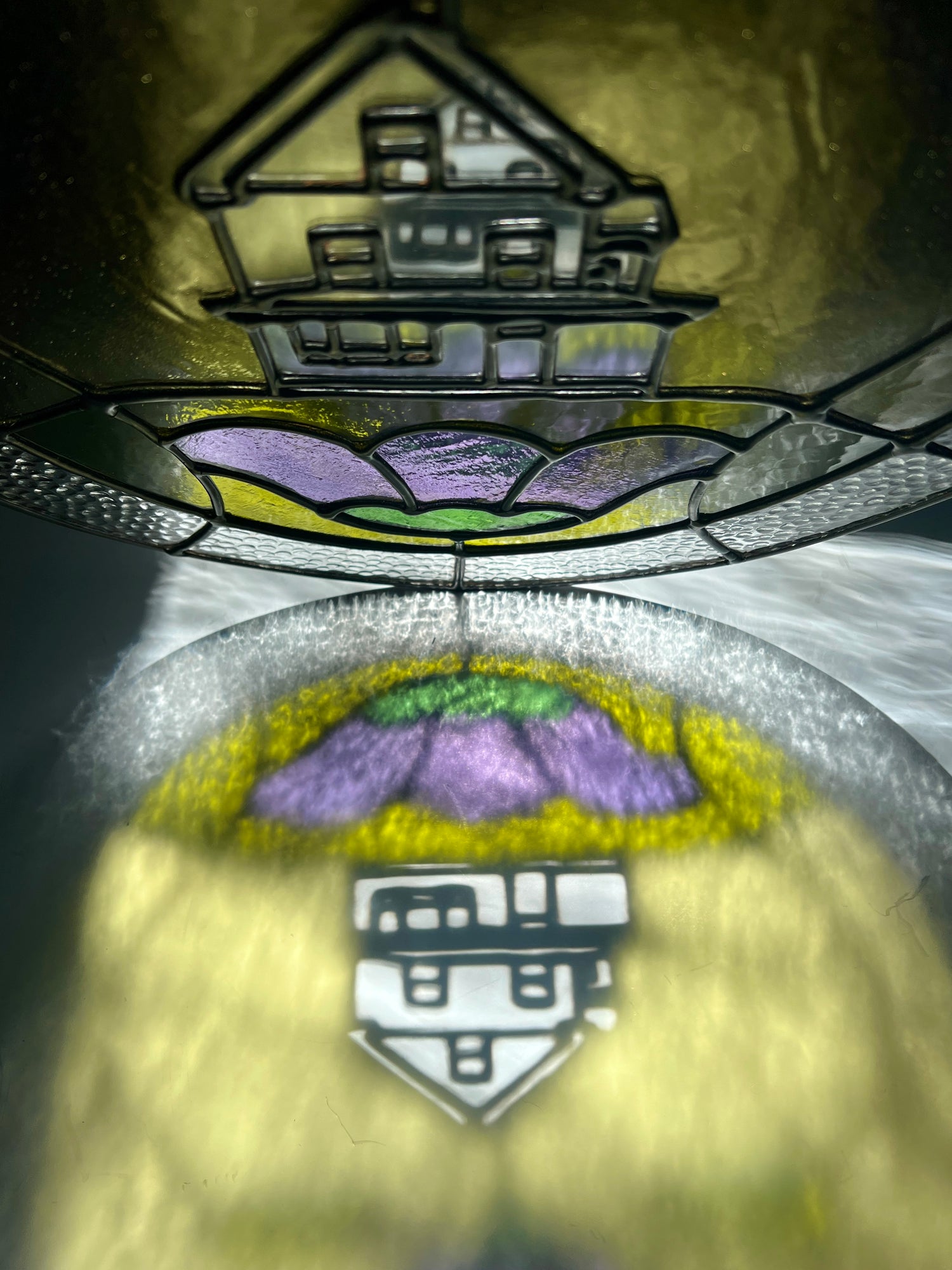 stained glass / lead-tin solder / lead came / black patina / zinc chain
