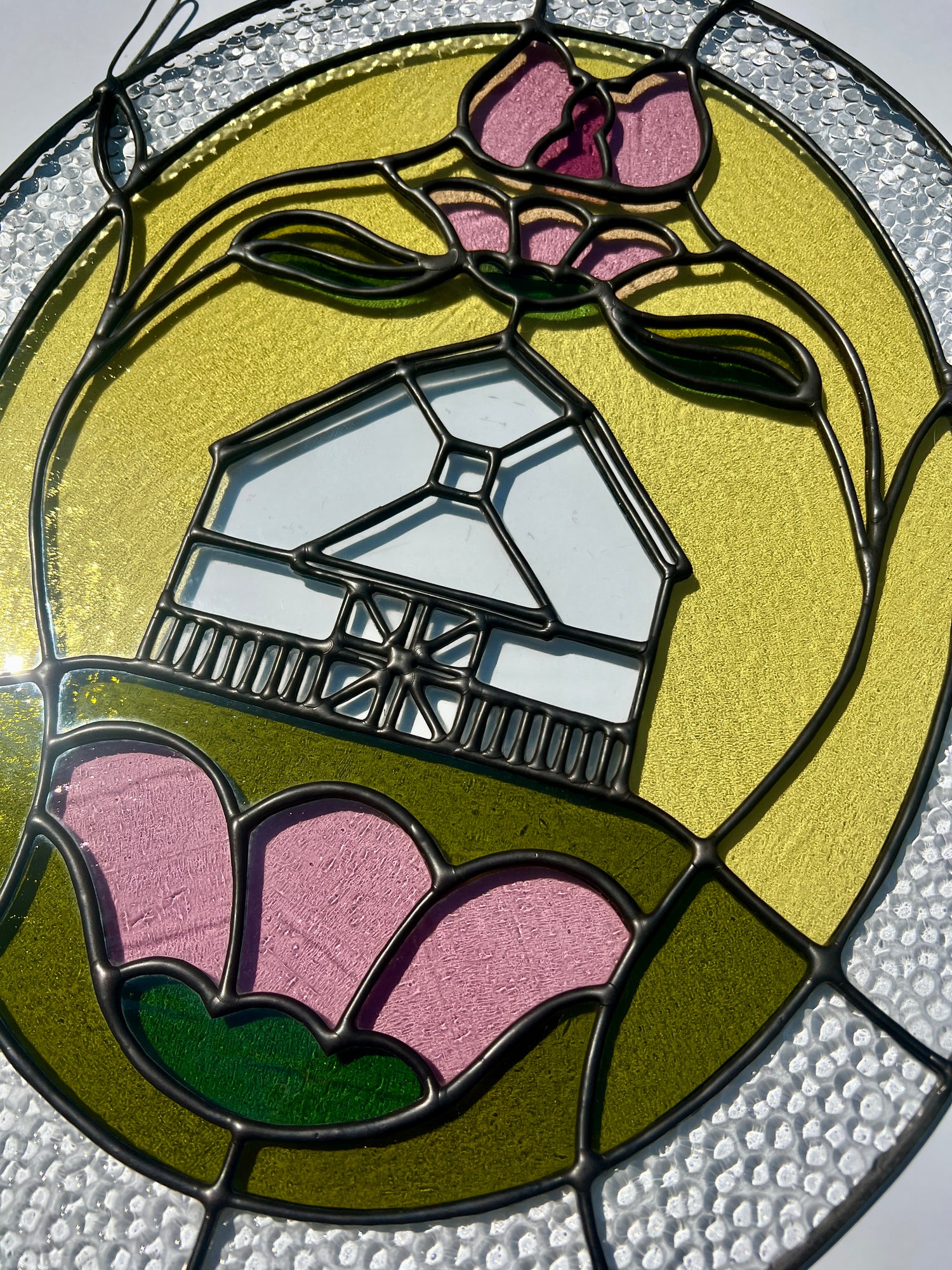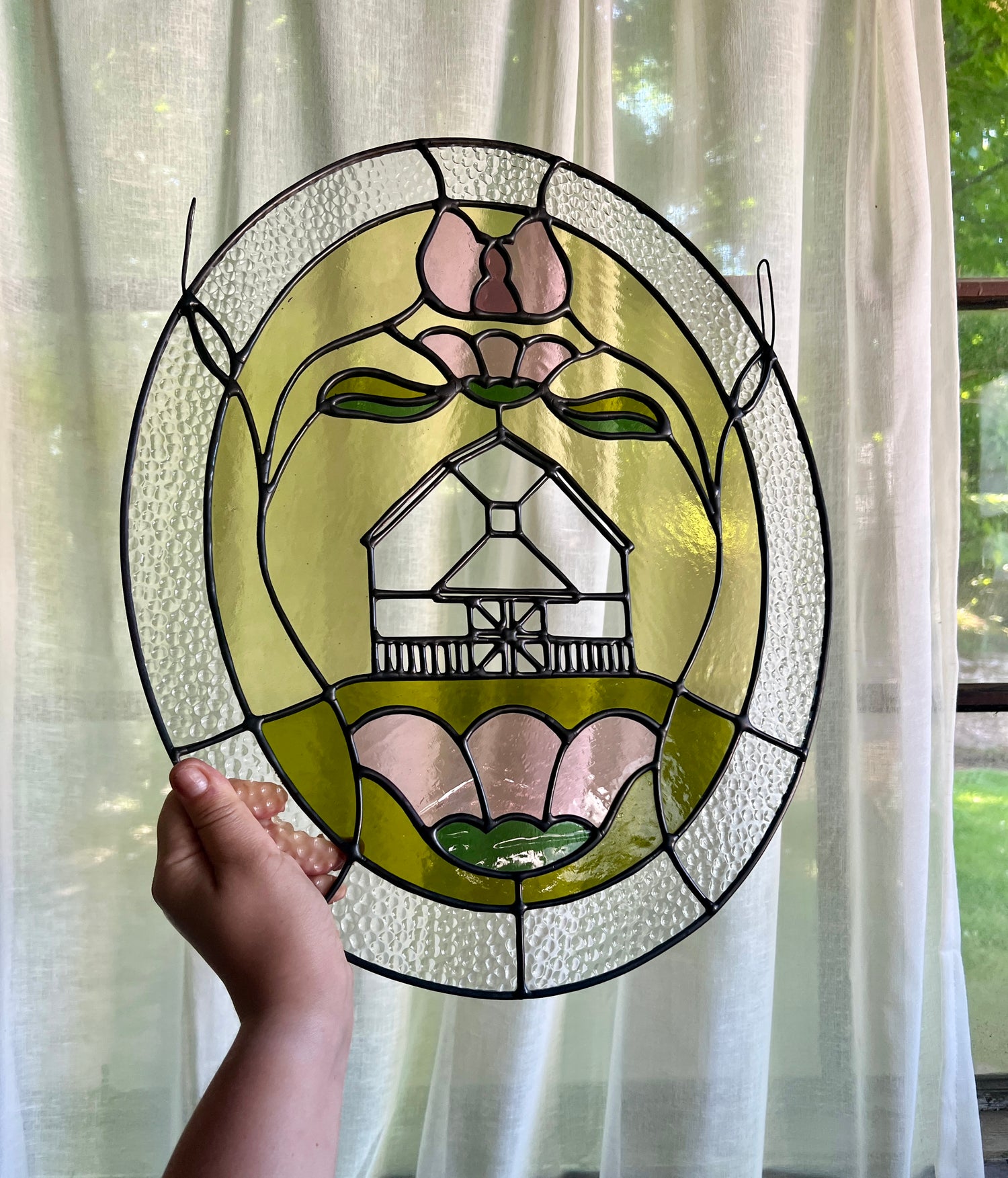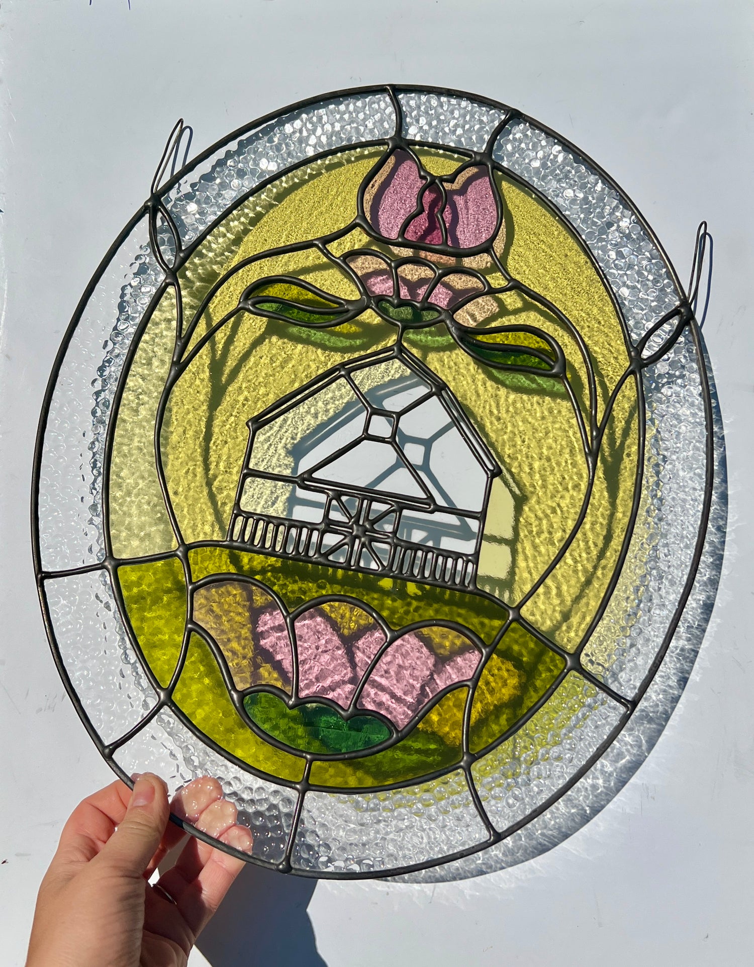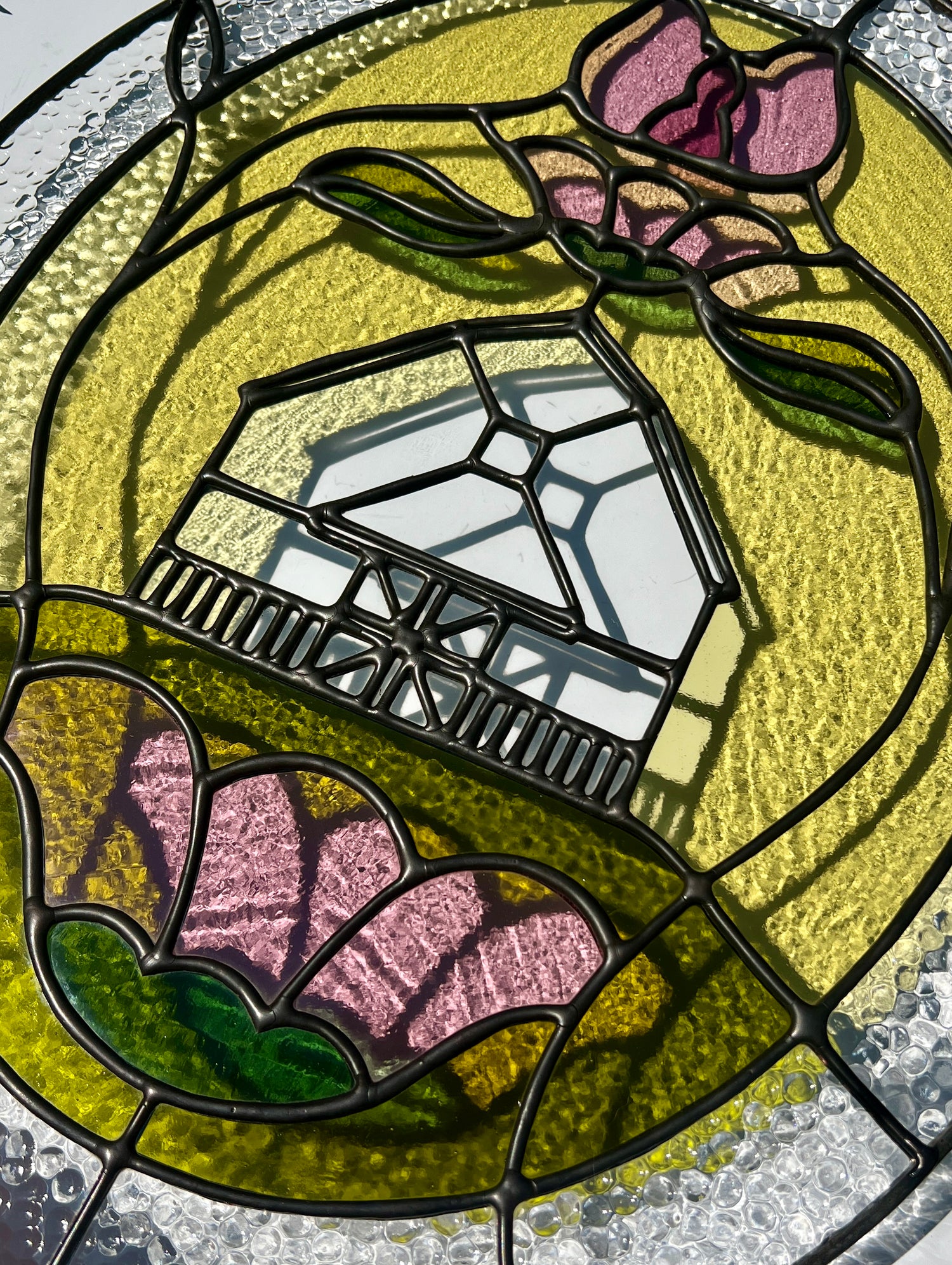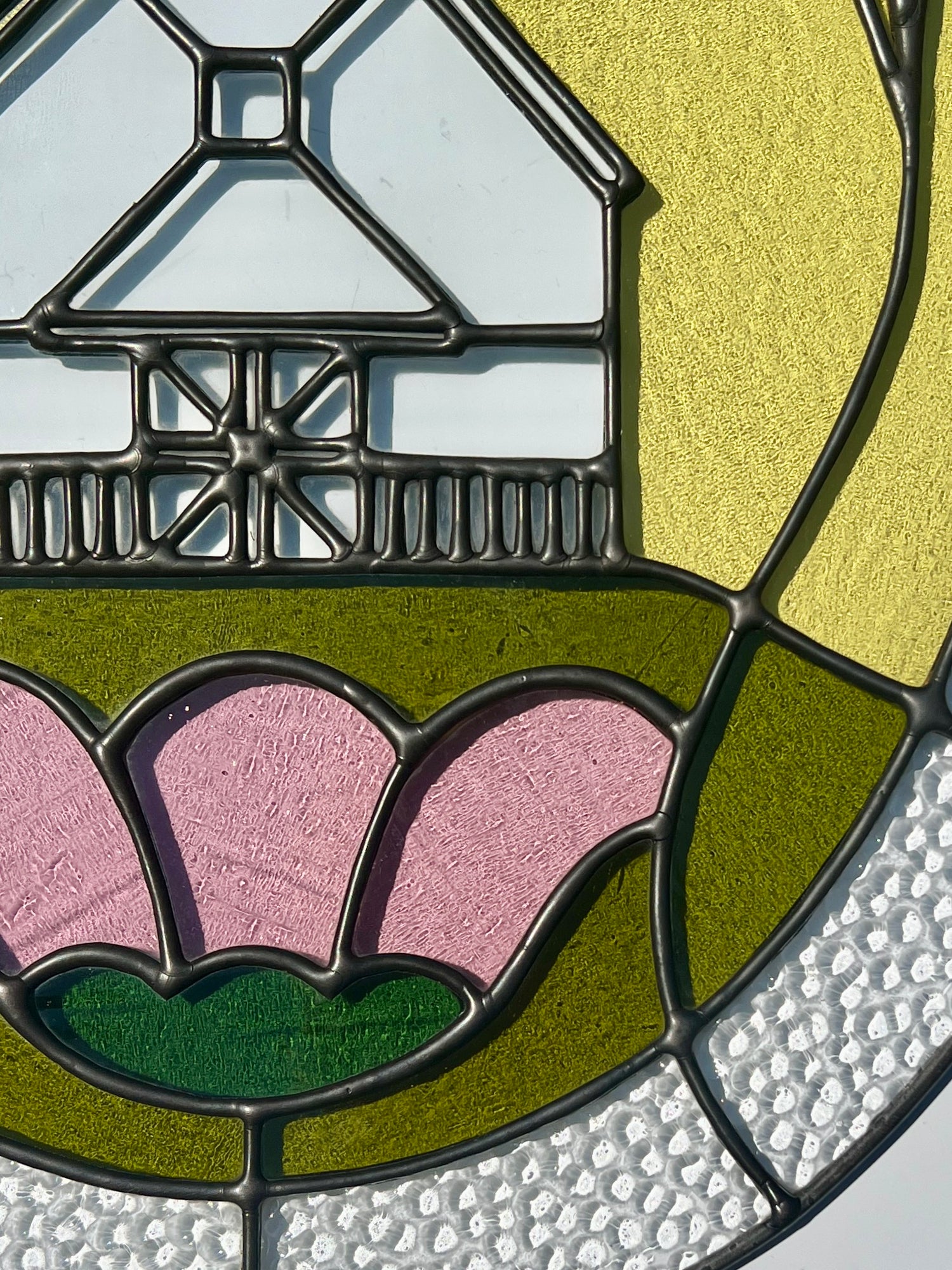 stained glass / lead-tin solder / lead came / black patina / zinc chain