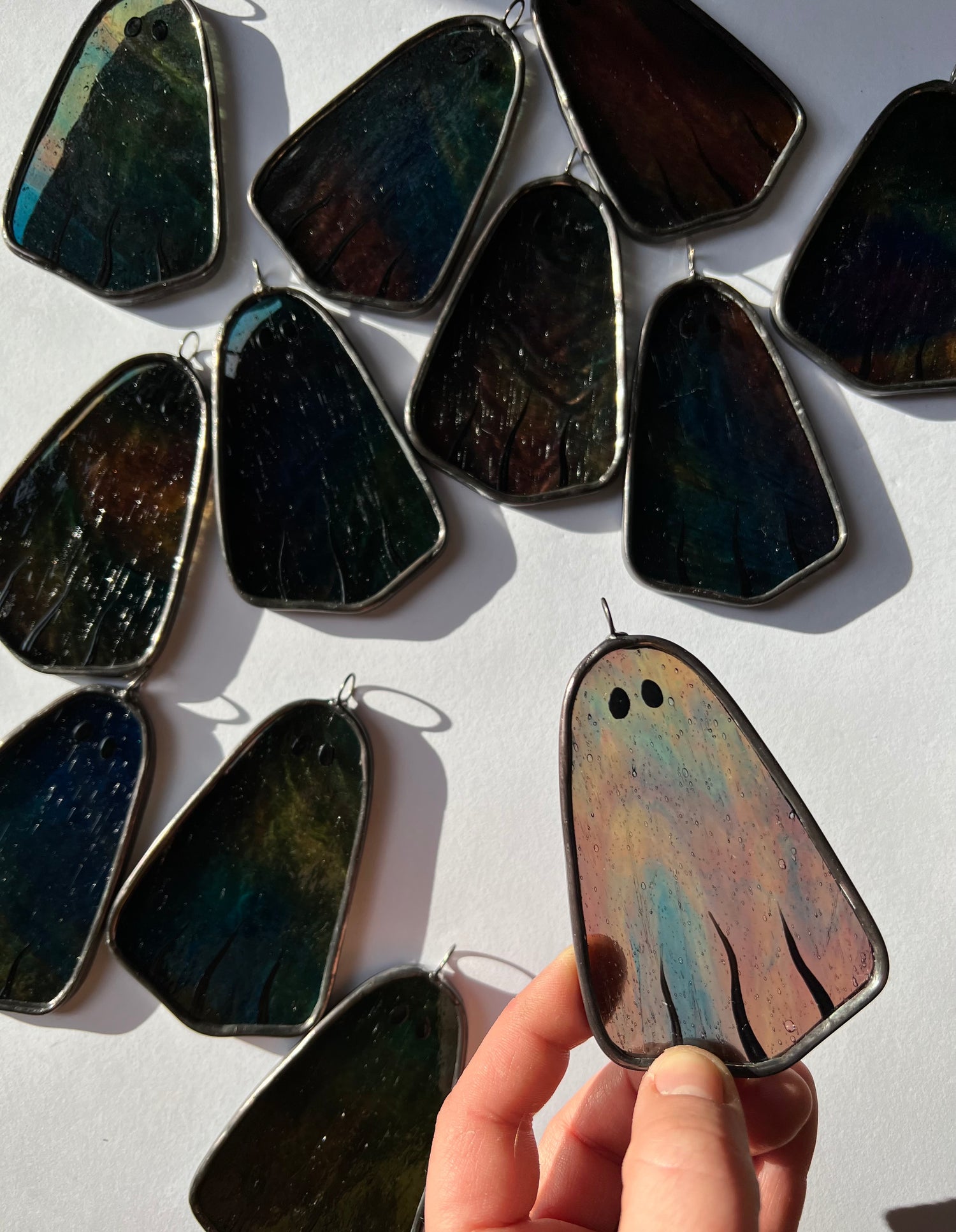 each ghost will have a unique combination of color and texture. this glass looks considerably darker when laying on a solid surface or not backlit with direct light, but when caught in the bright sunlight it shows off its colors. the colors show best when hung in a bright and sunny spot. colors will vary.
