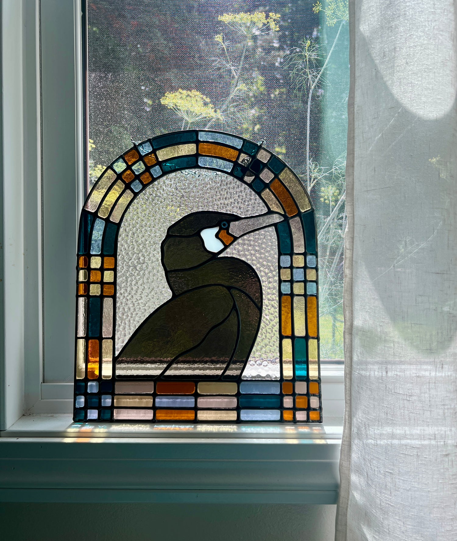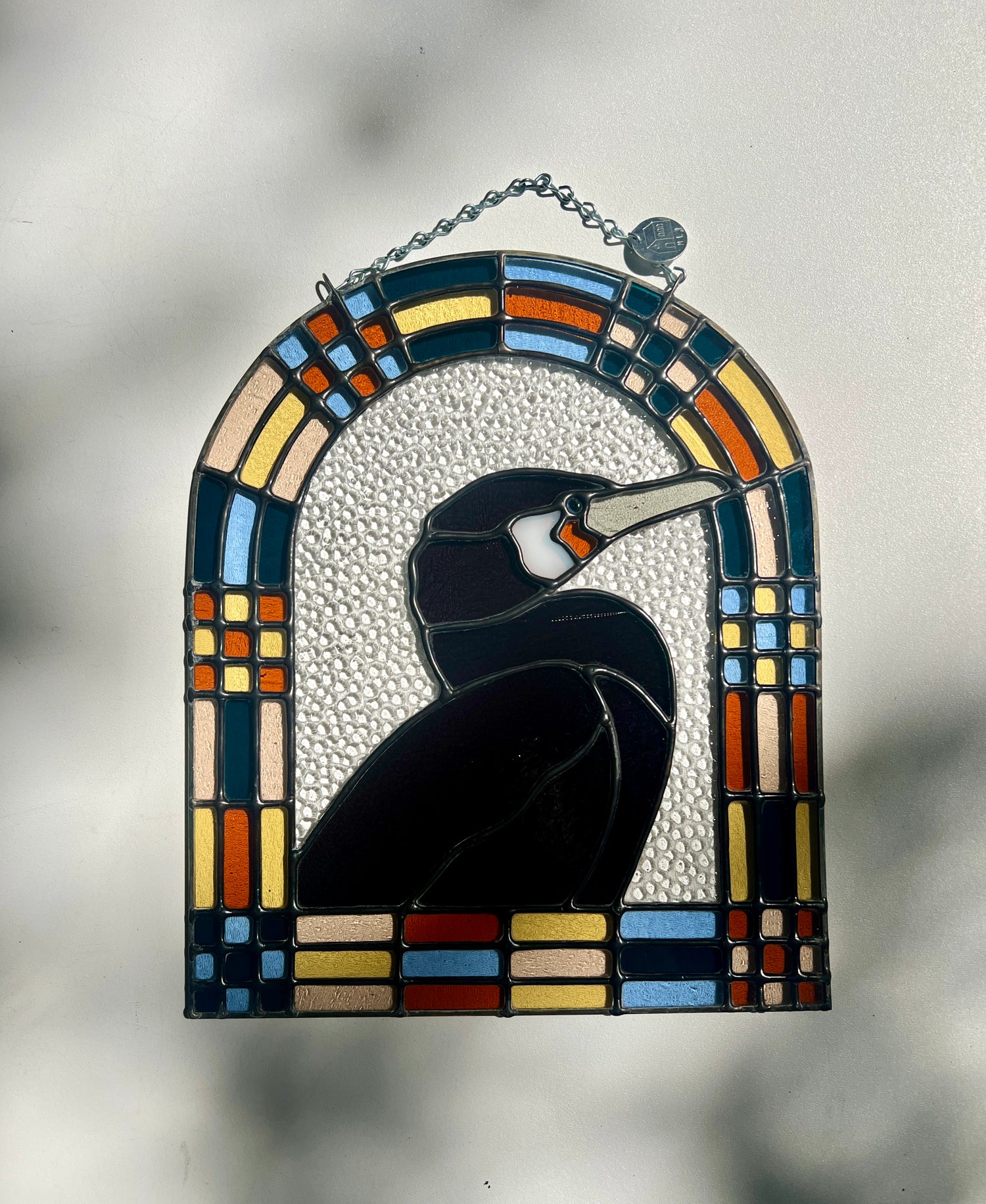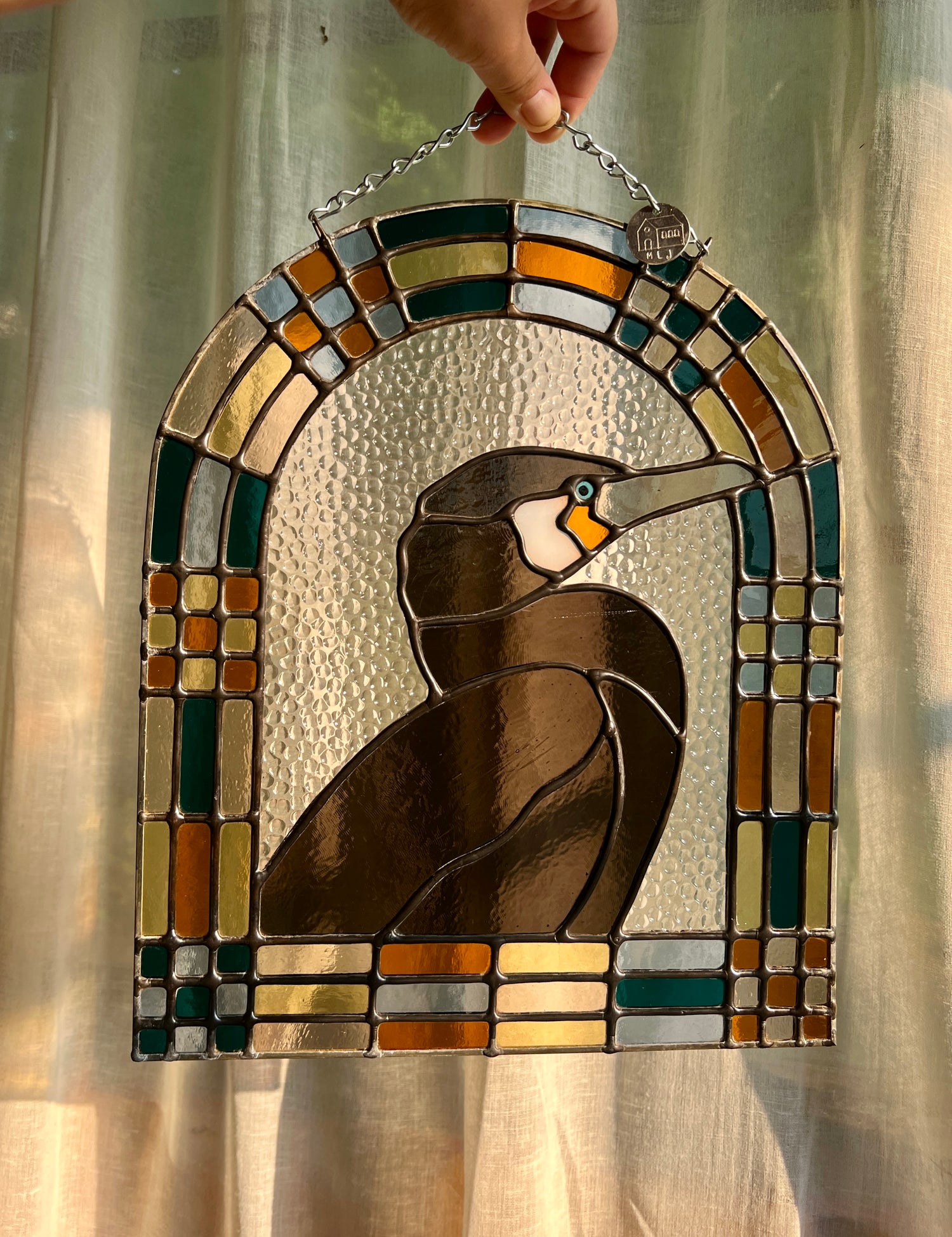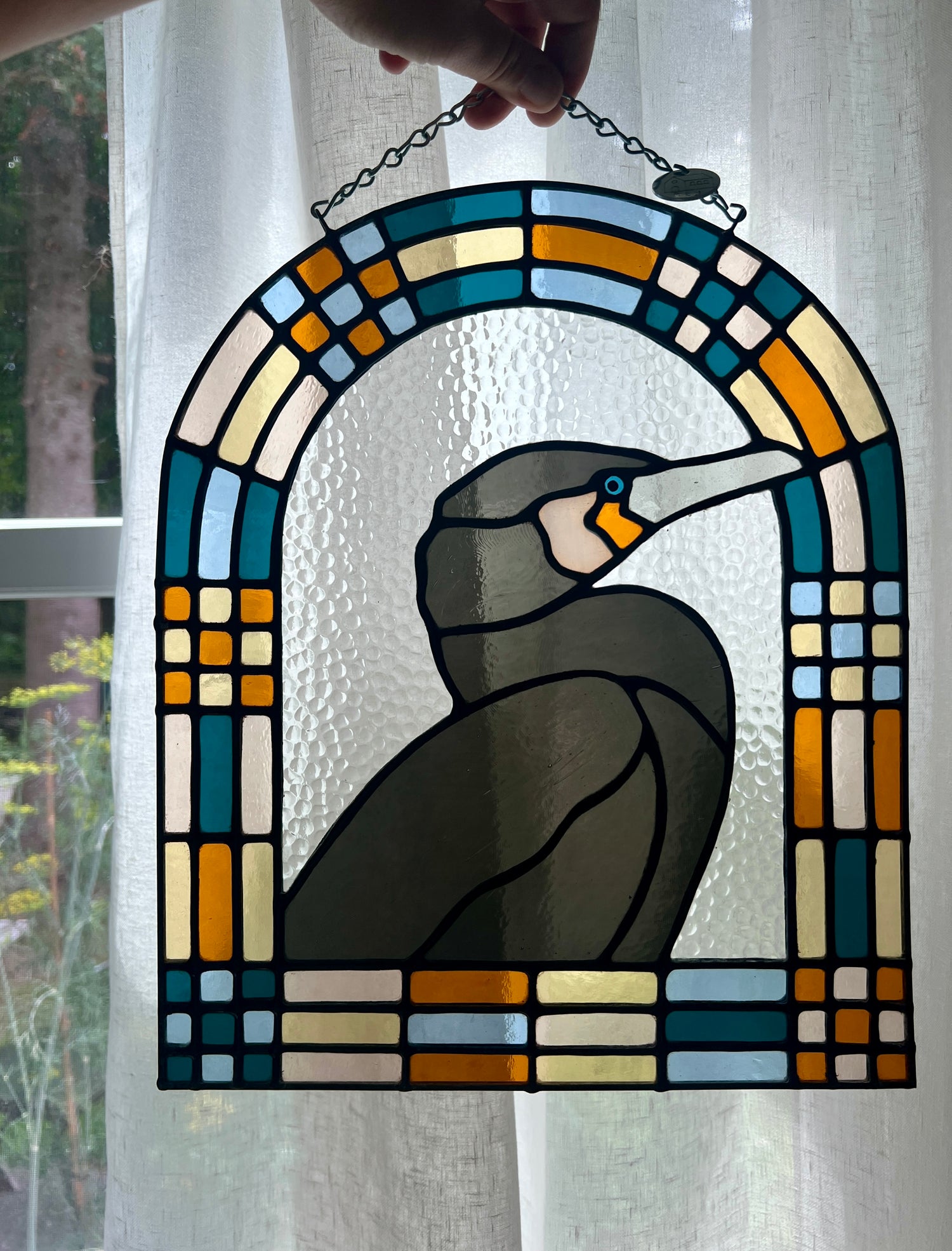 stained glass / lead tin solder / zinc came / black patina / zinc chain / paint detail