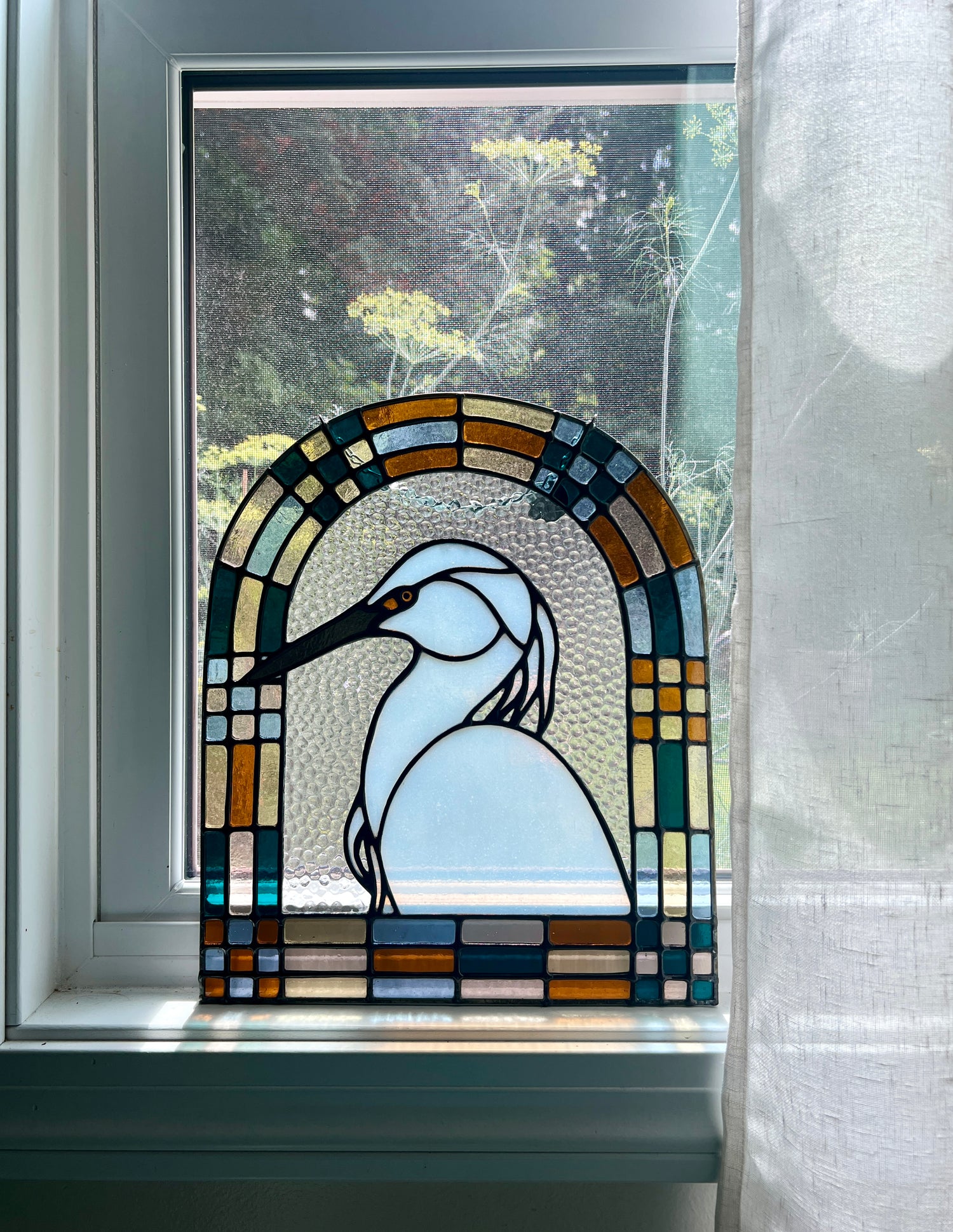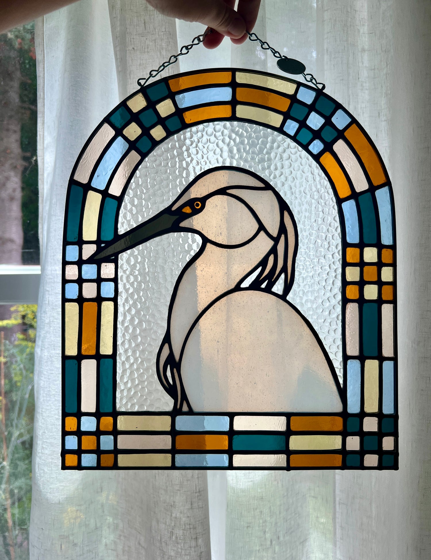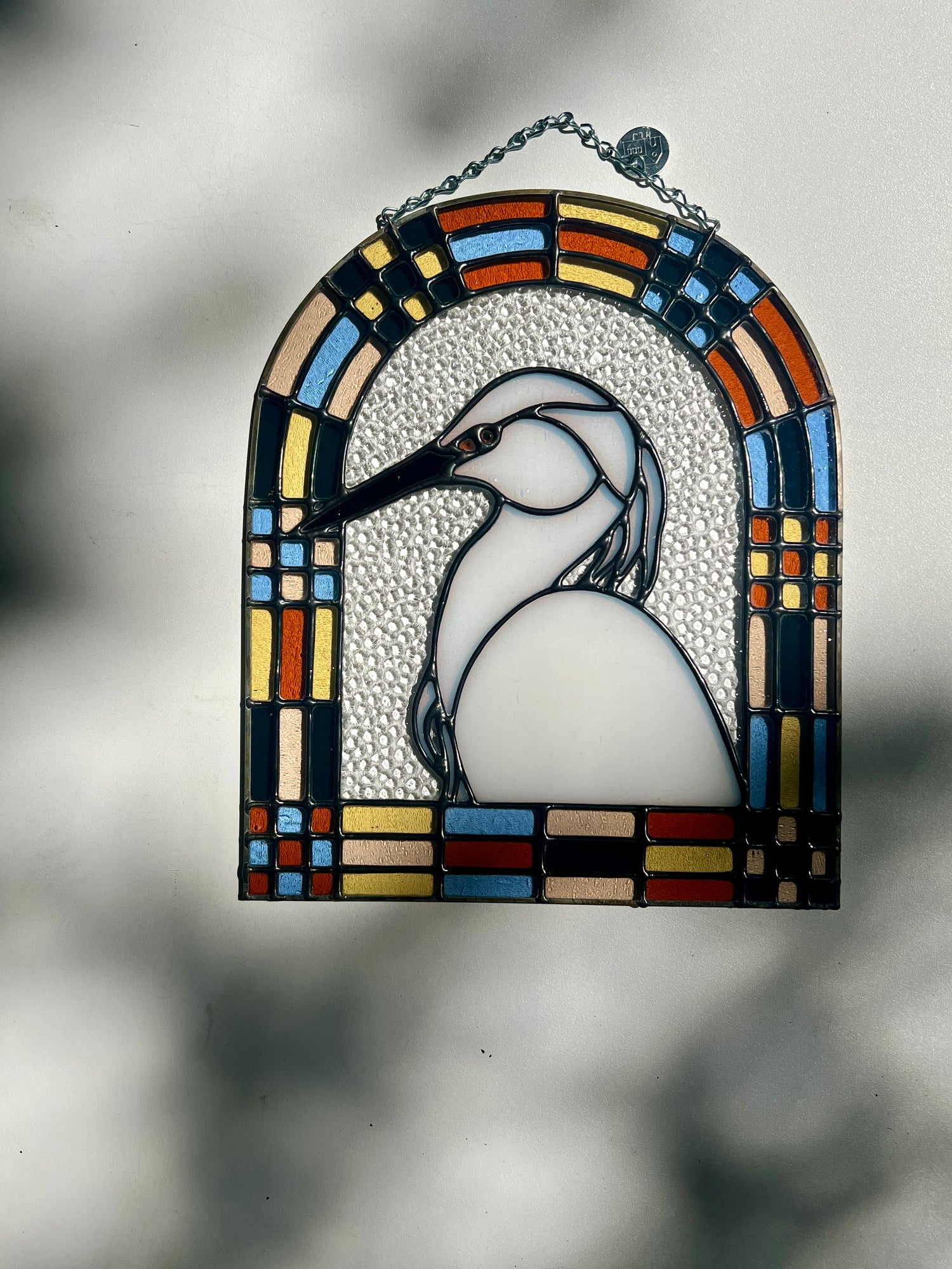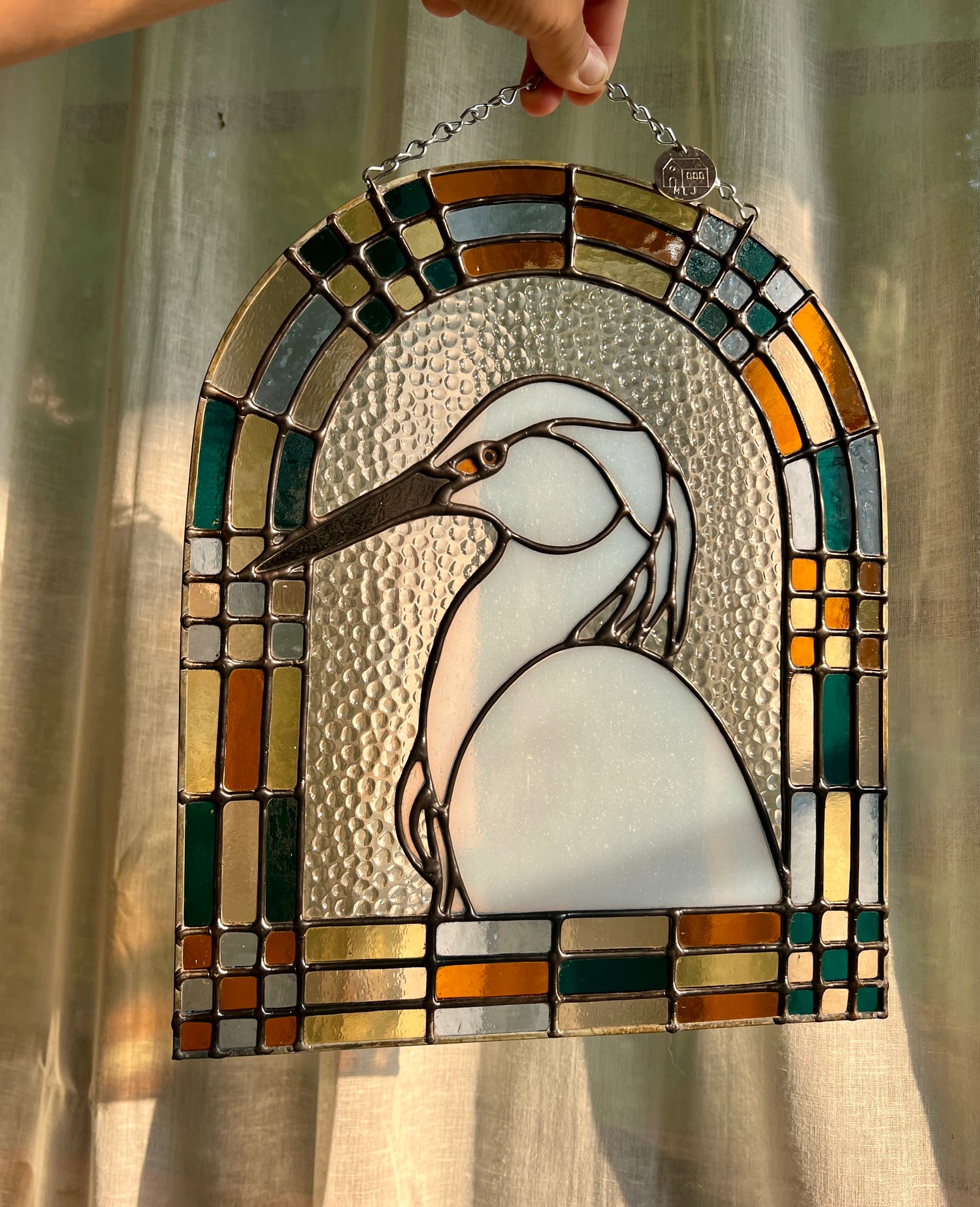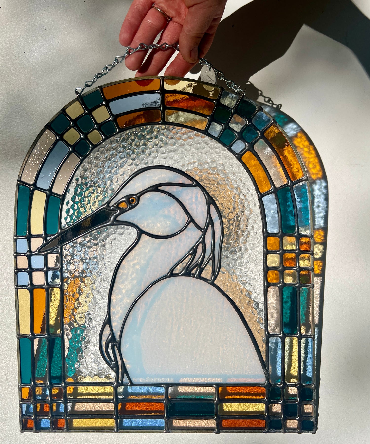 stained glass / lead tin solder / zinc came / black patina / zinc chain / paint detail