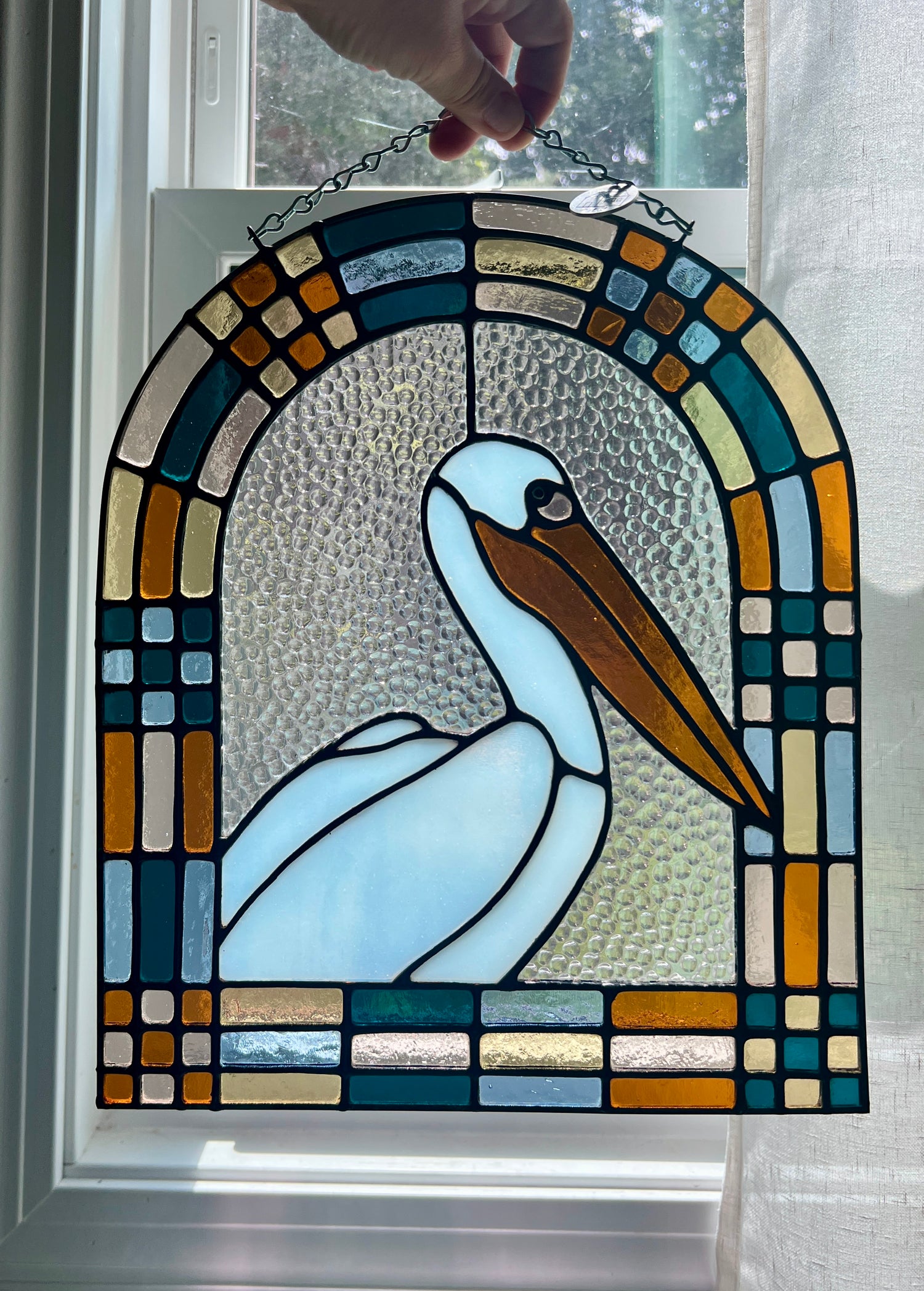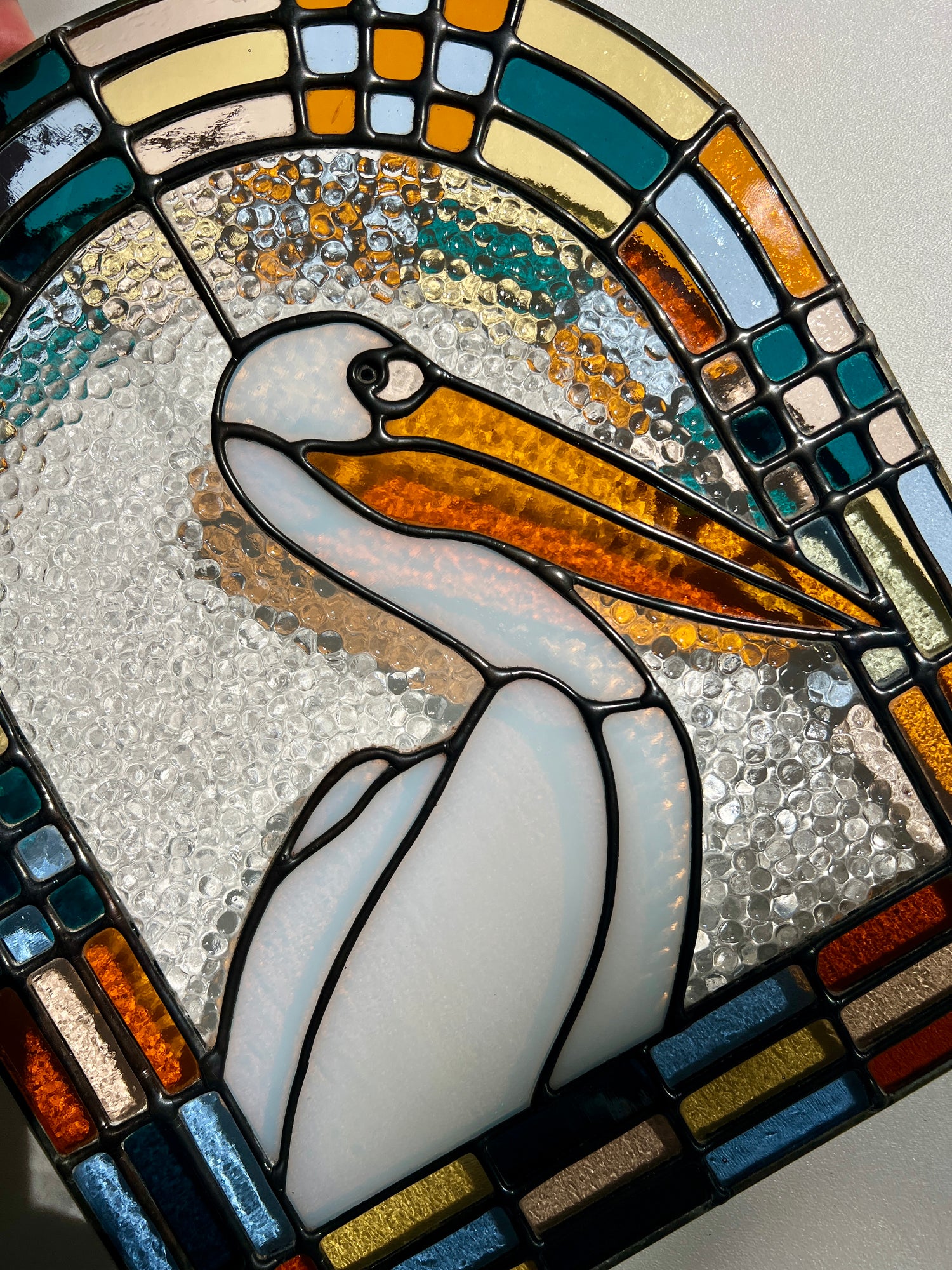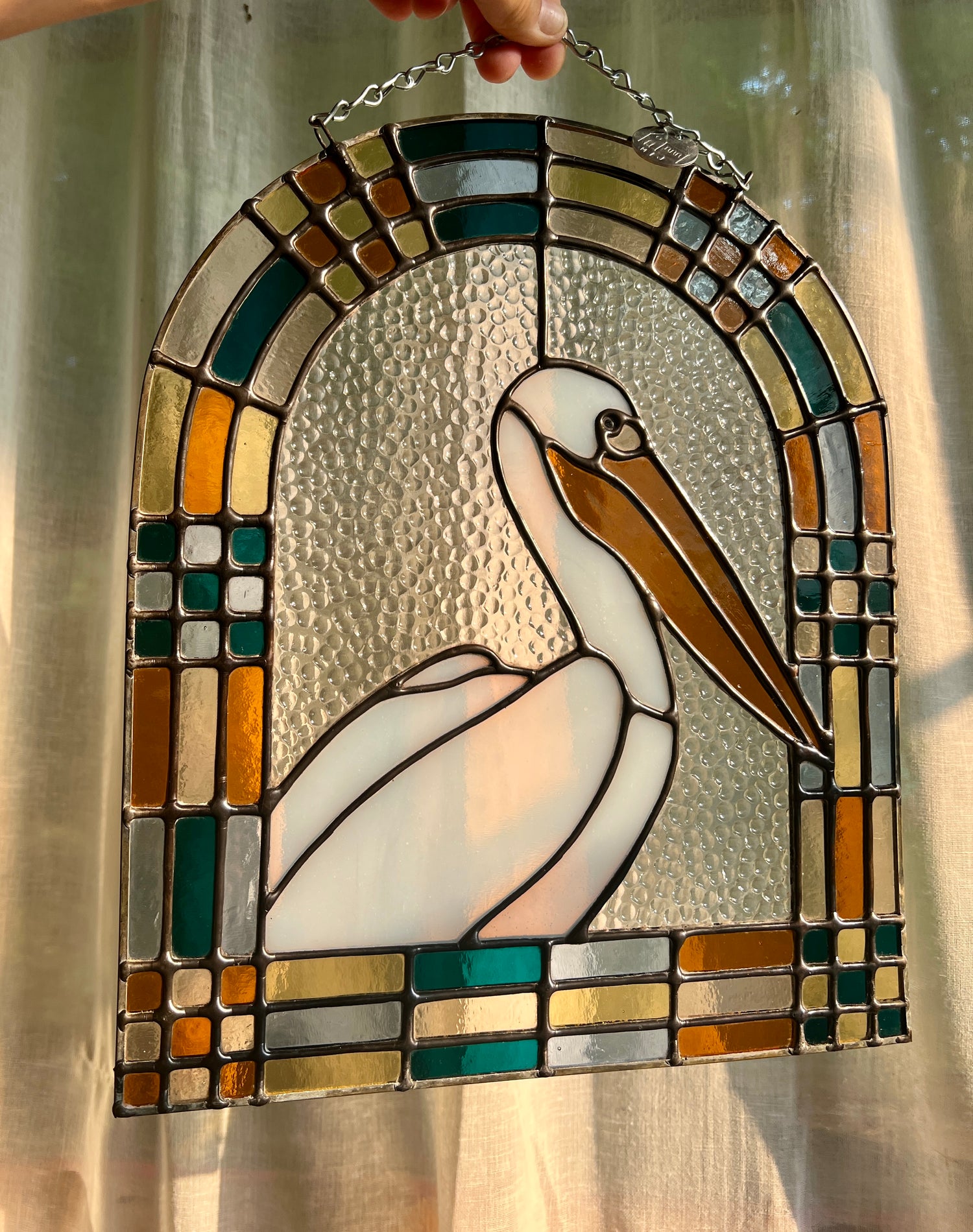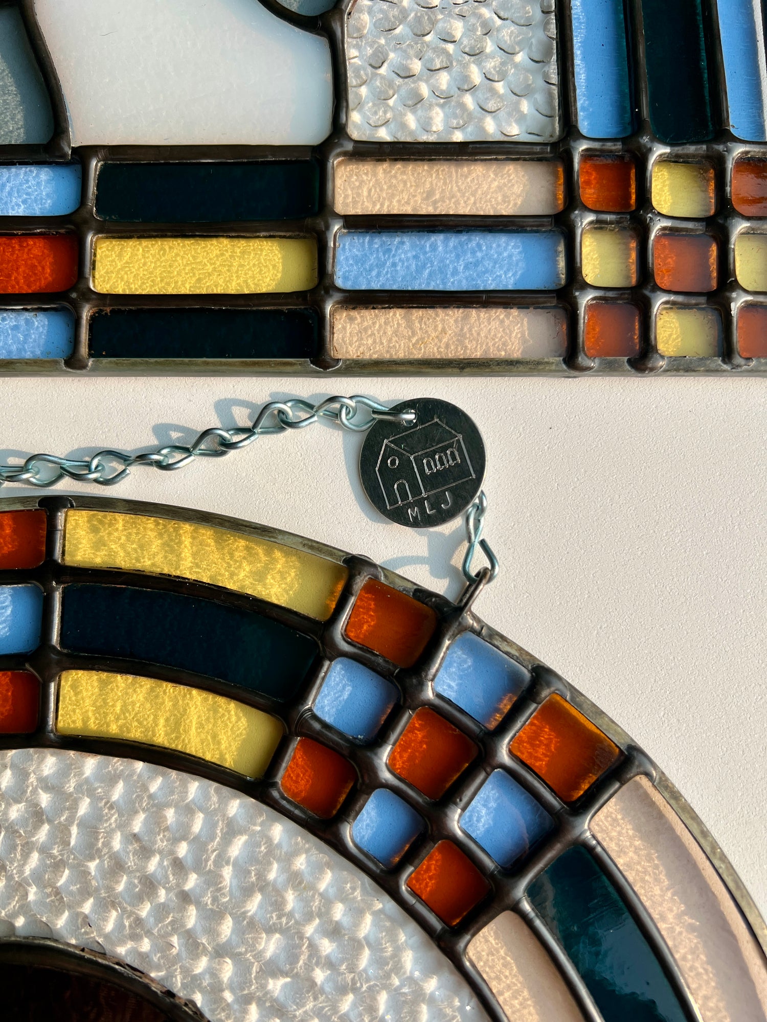 stained glass / lead tin solder / zinc came / black patina / zinc chain / paint detail
