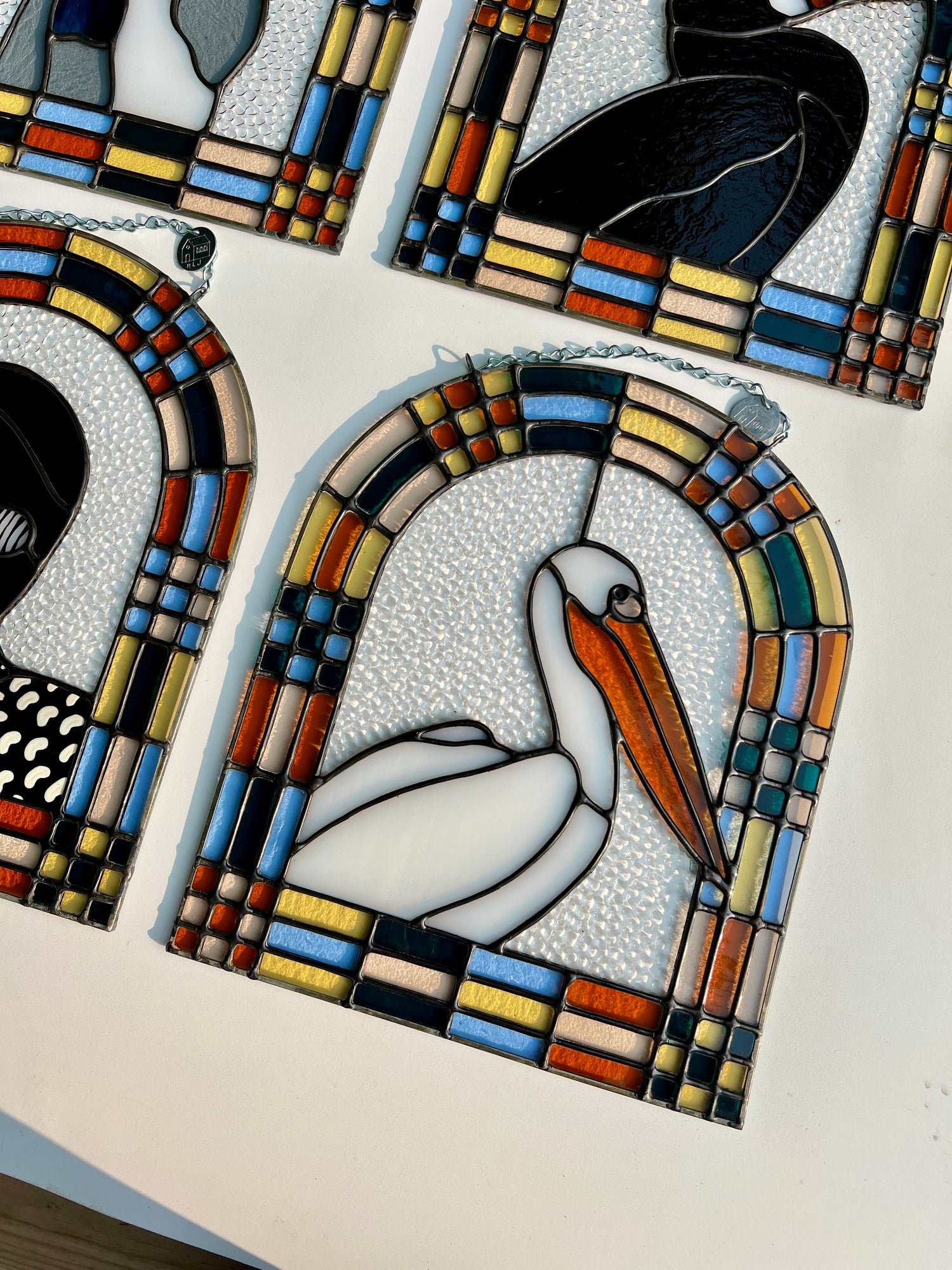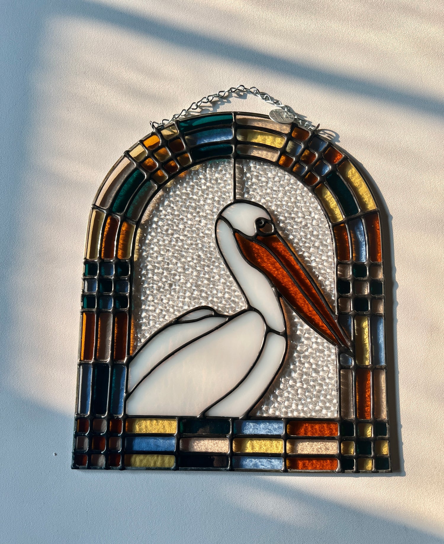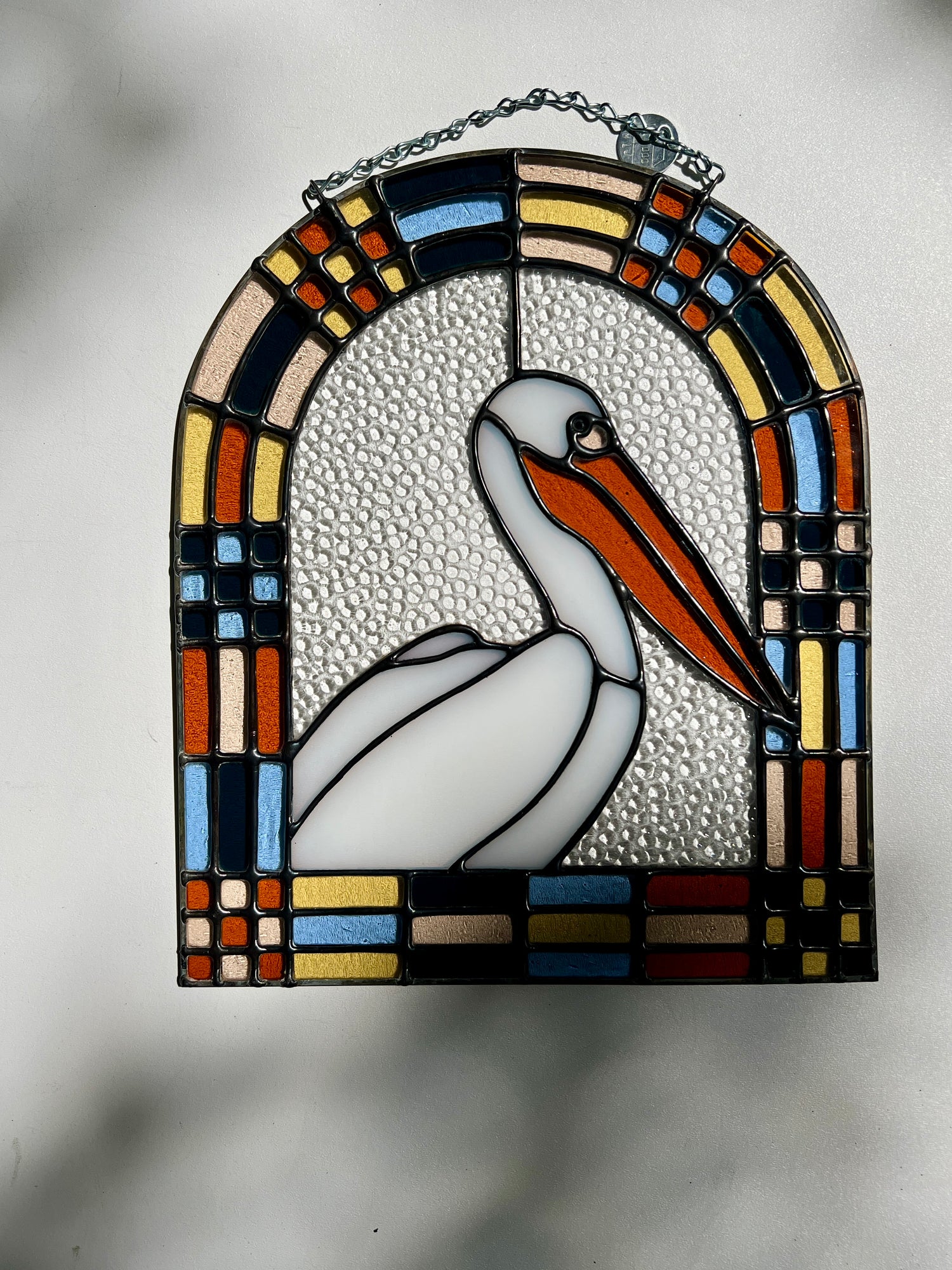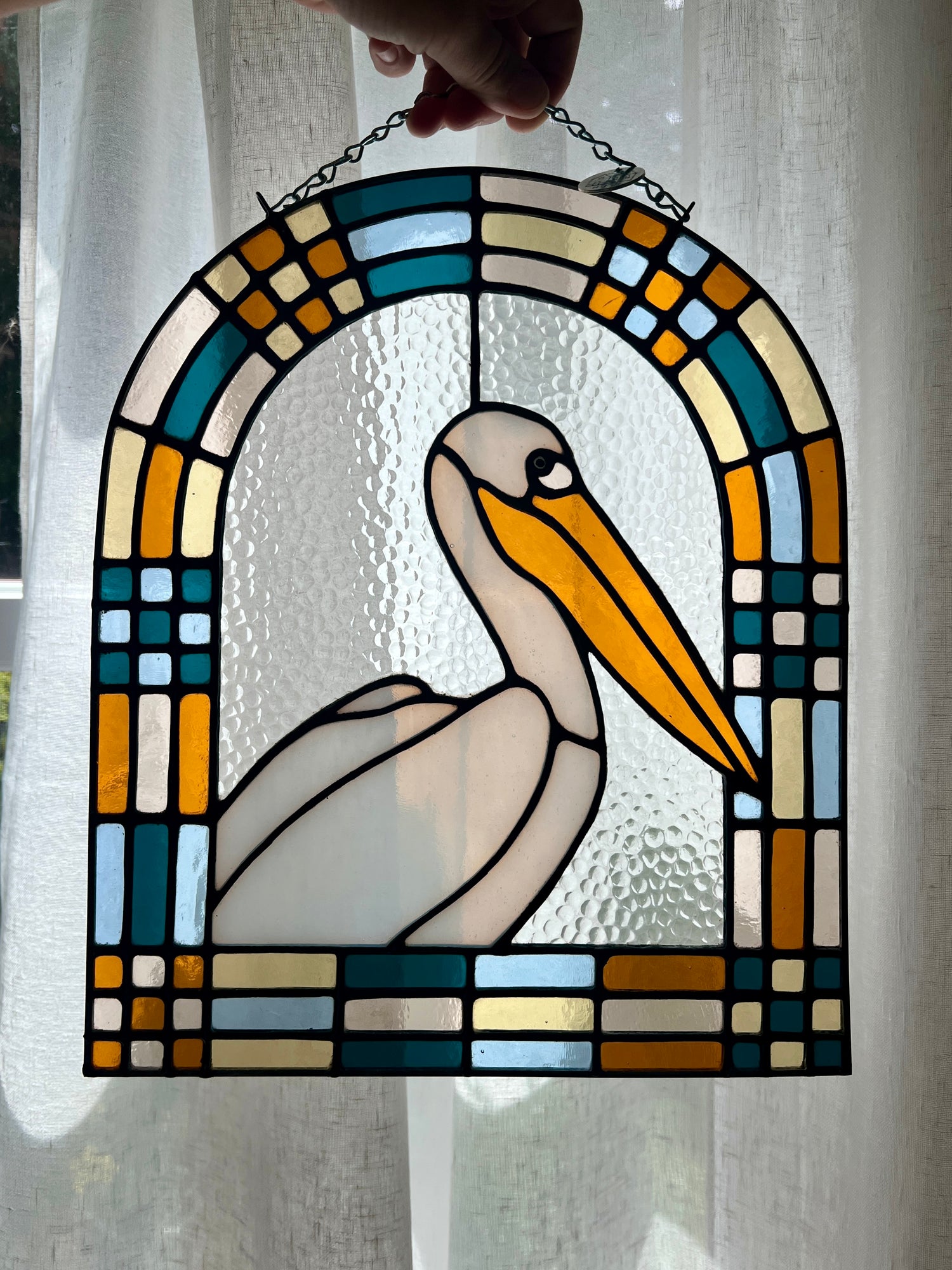 stained glass / lead tin solder / zinc came / black patina / zinc chain / paint detail