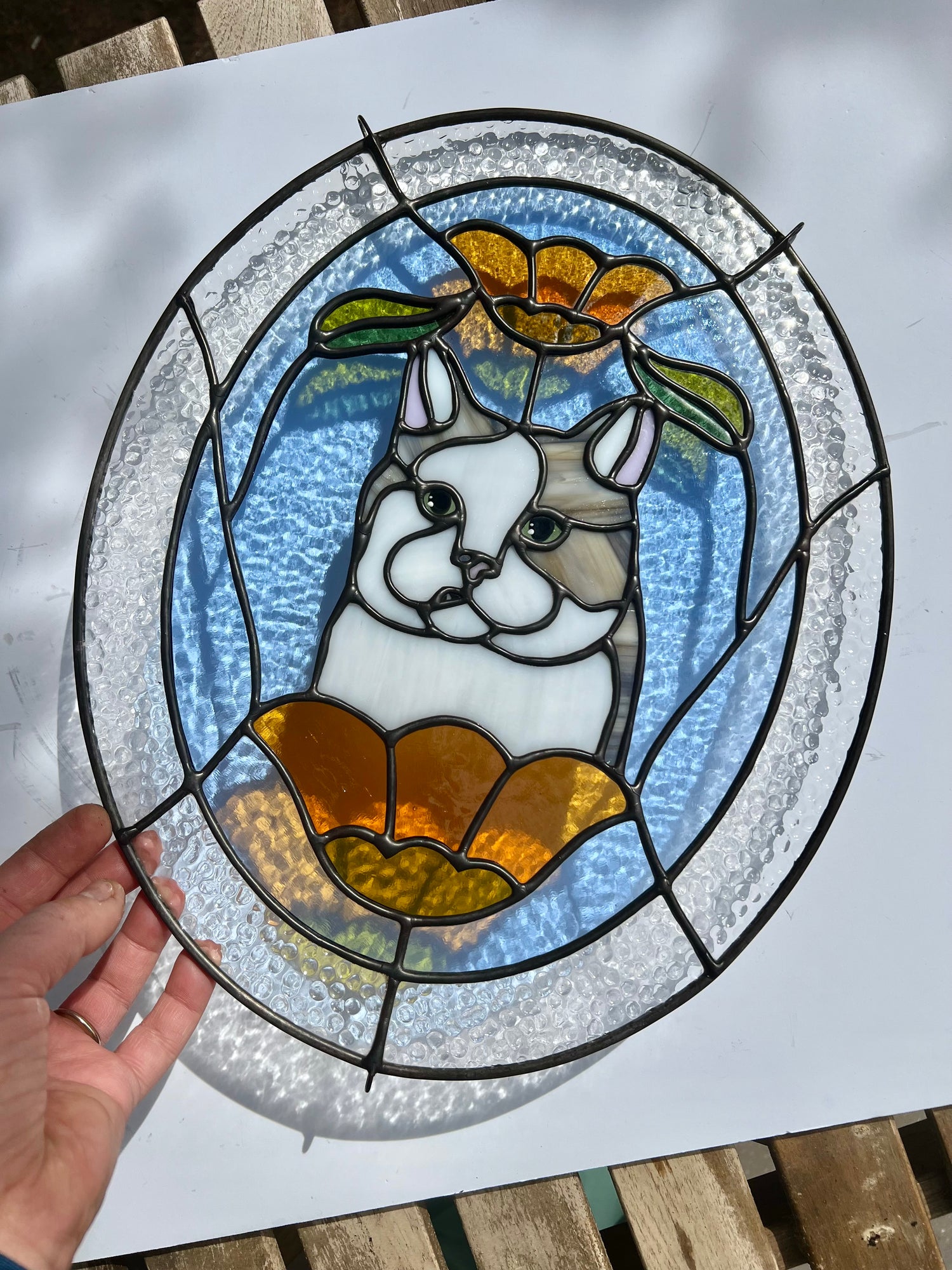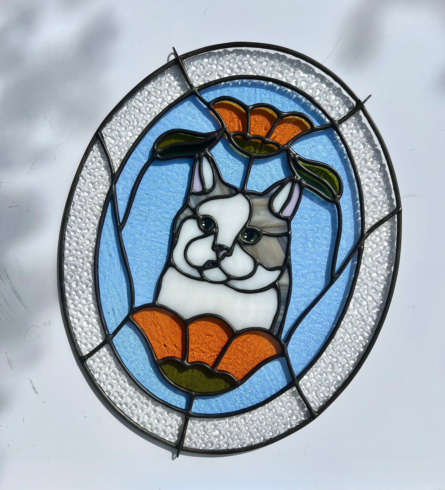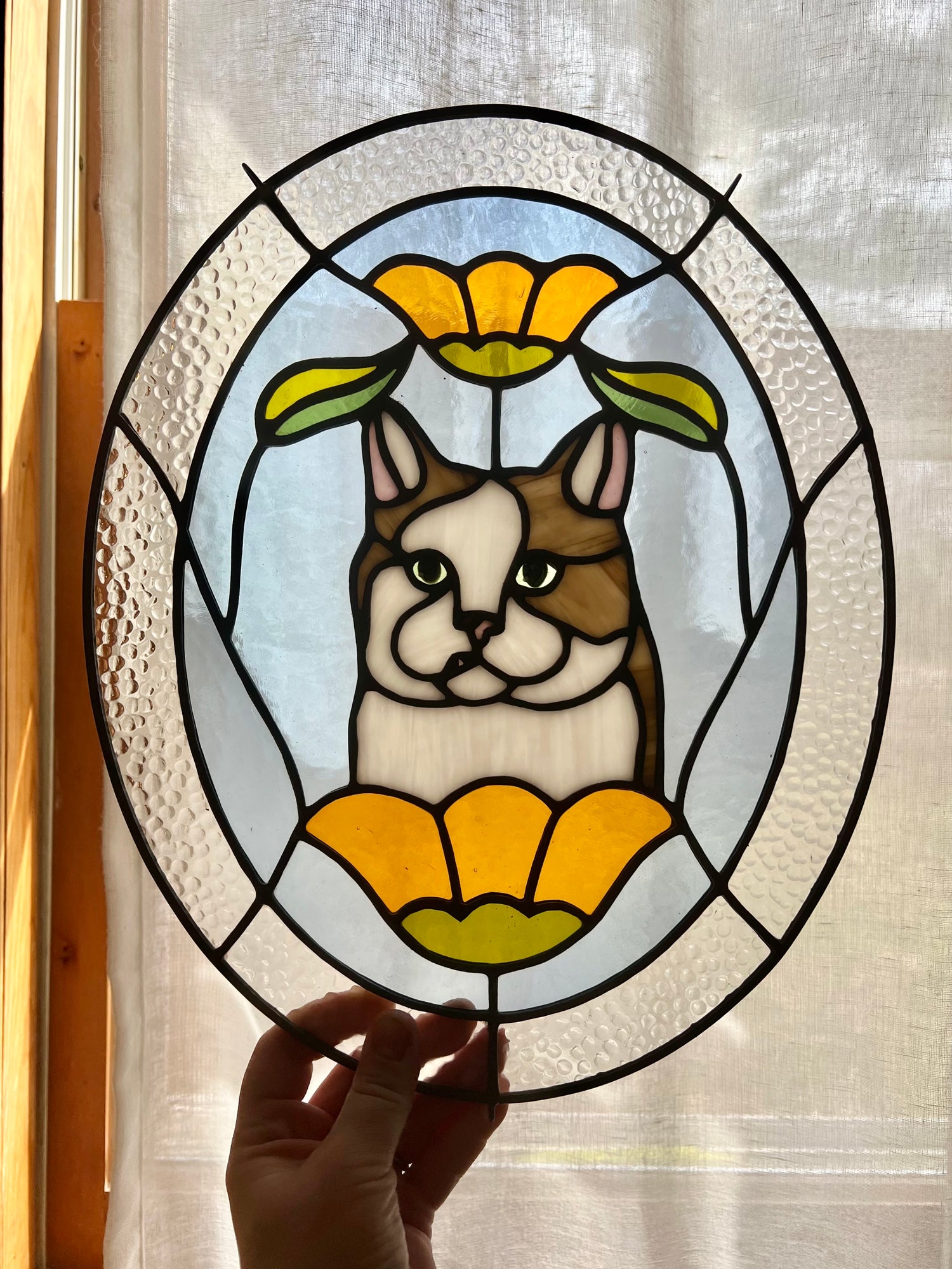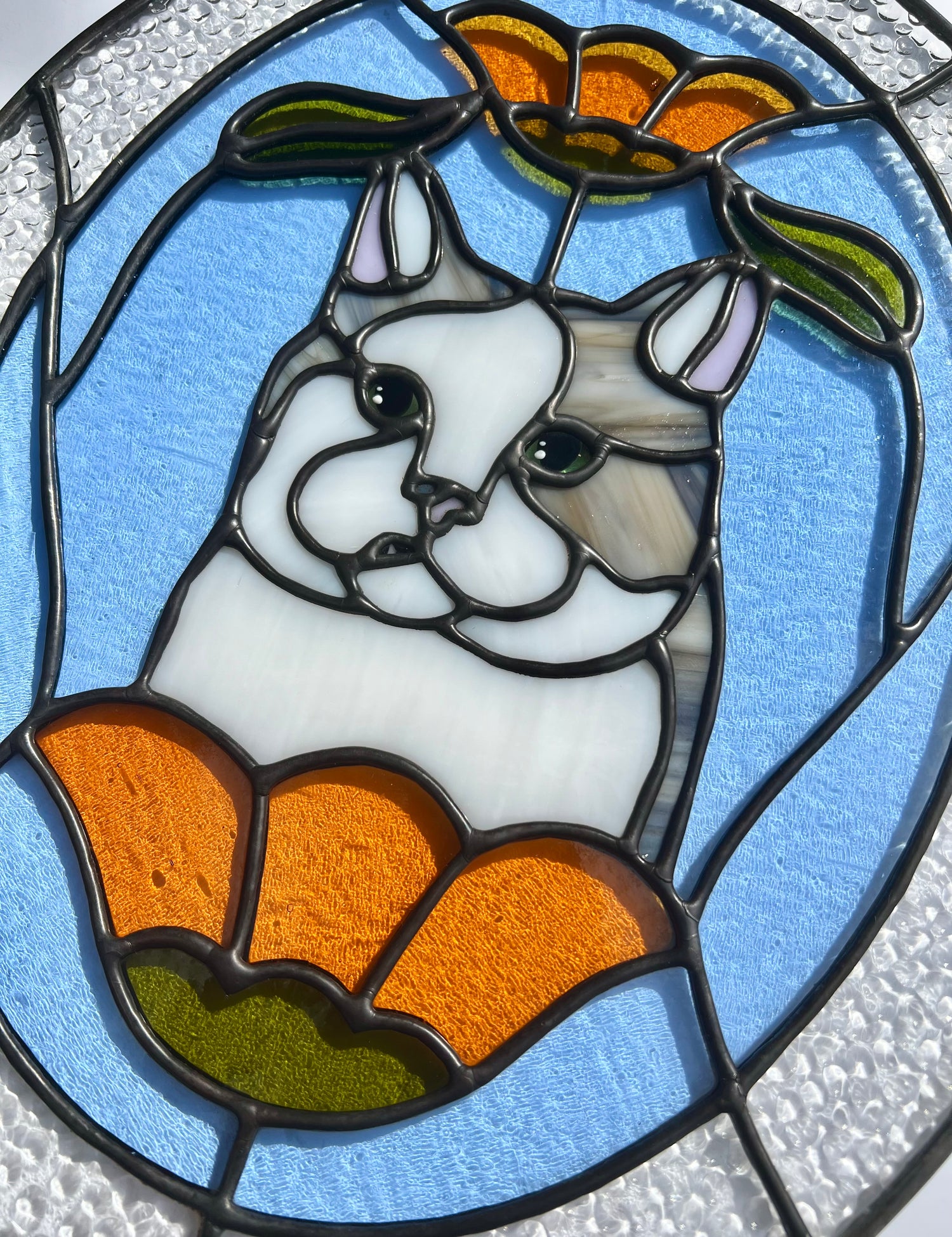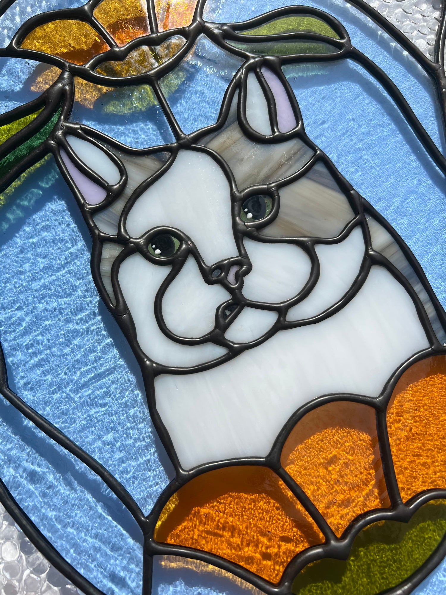 stained glass / lead-tin solder / lead frame / black patina / hand painted details / zinc chain