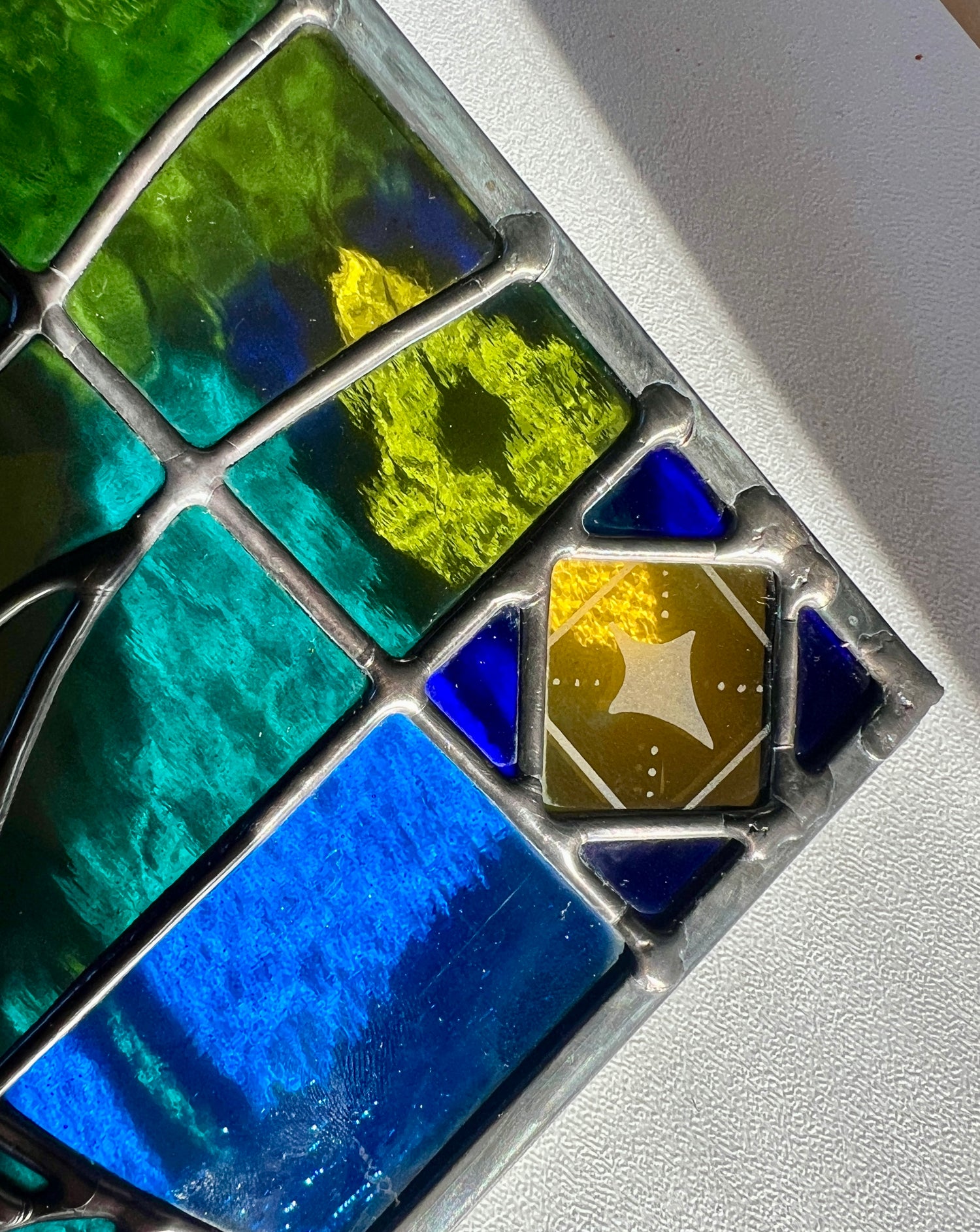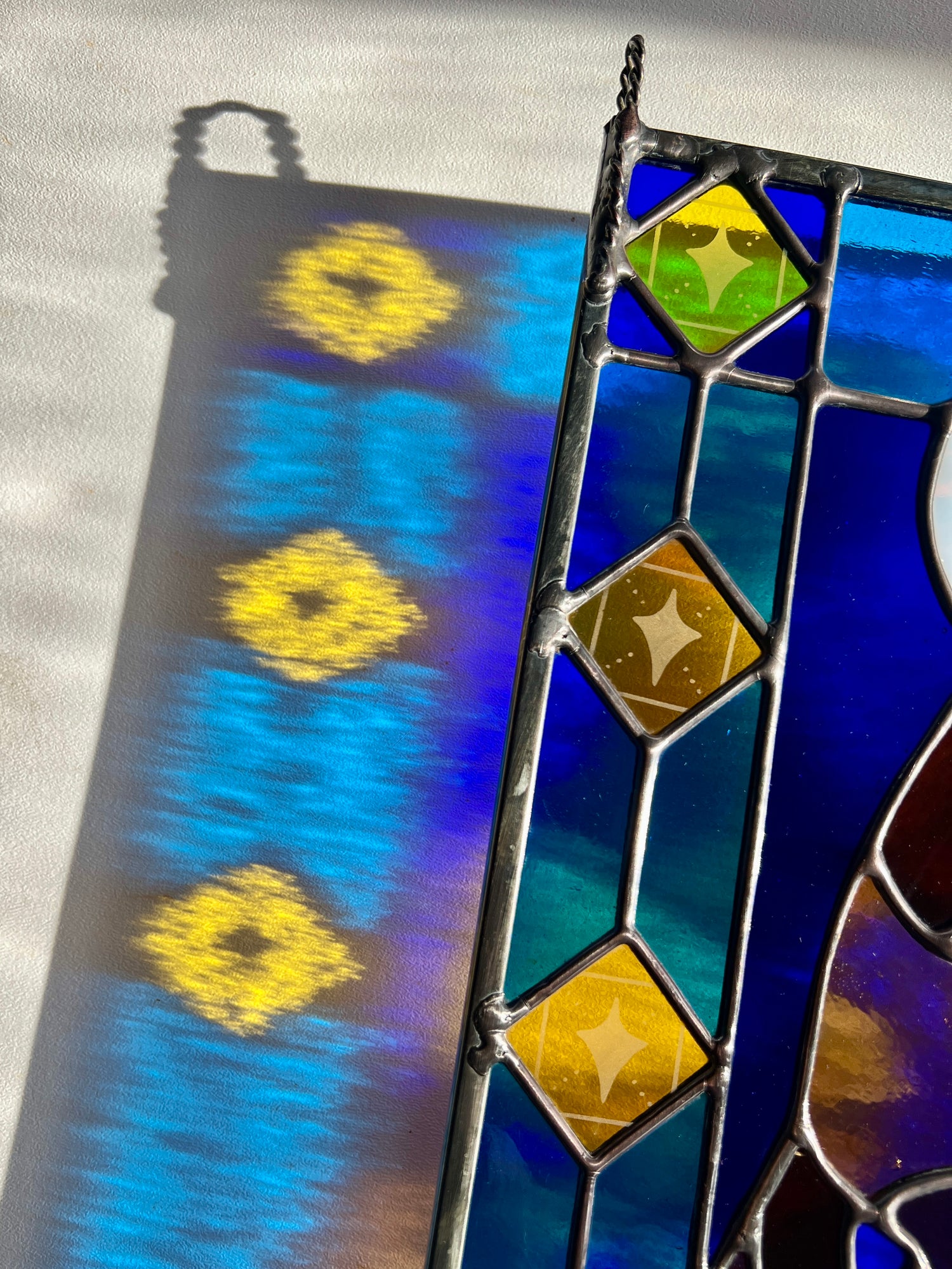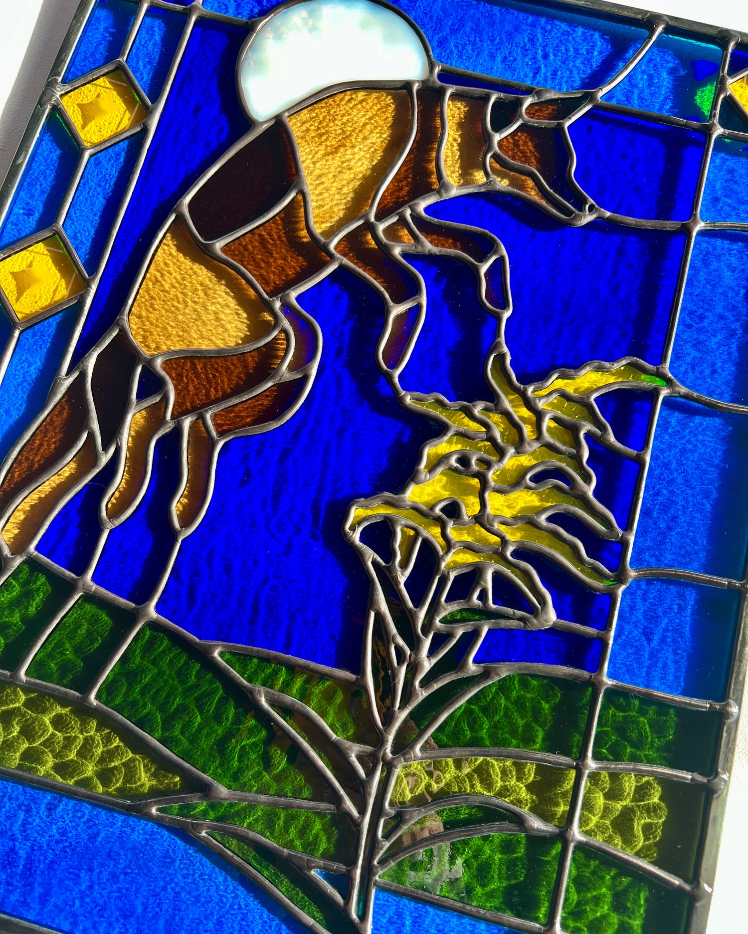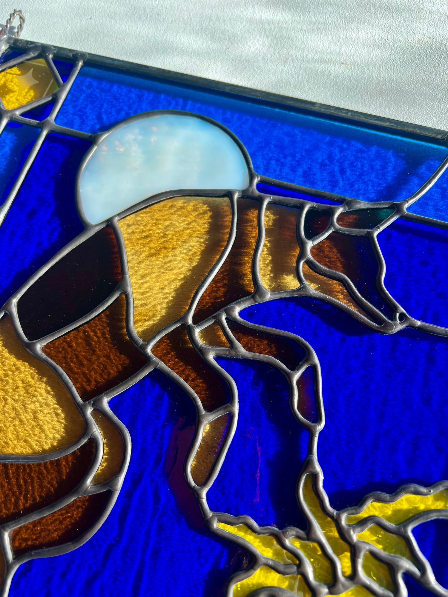 stained glass / lead tin solder / zinc came / black patina / etched details / zinc chain