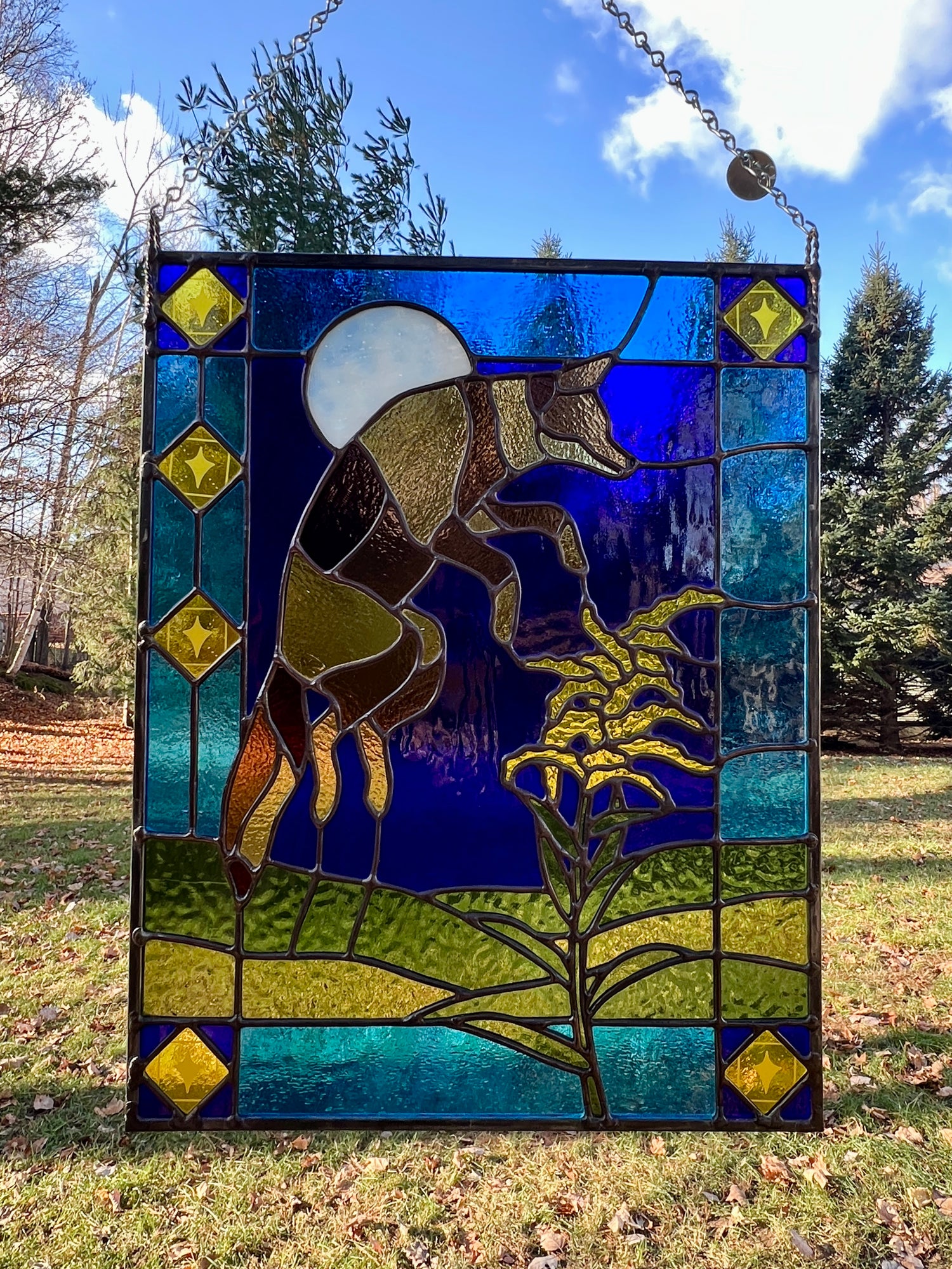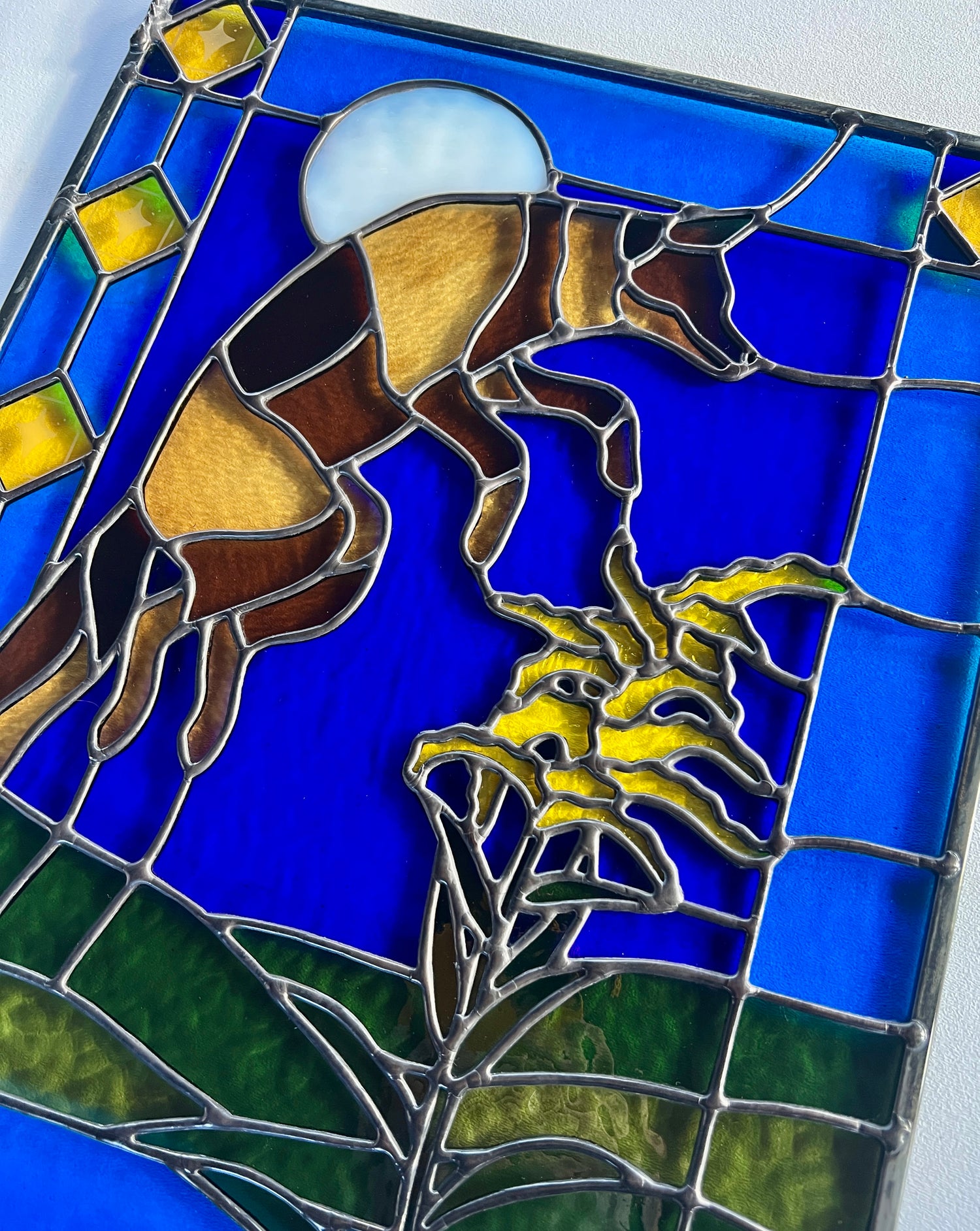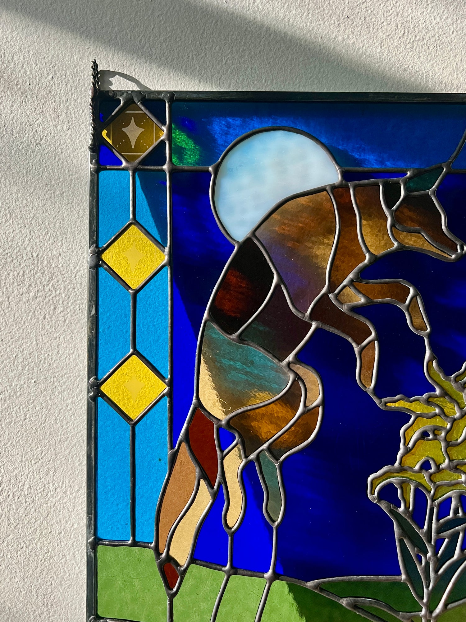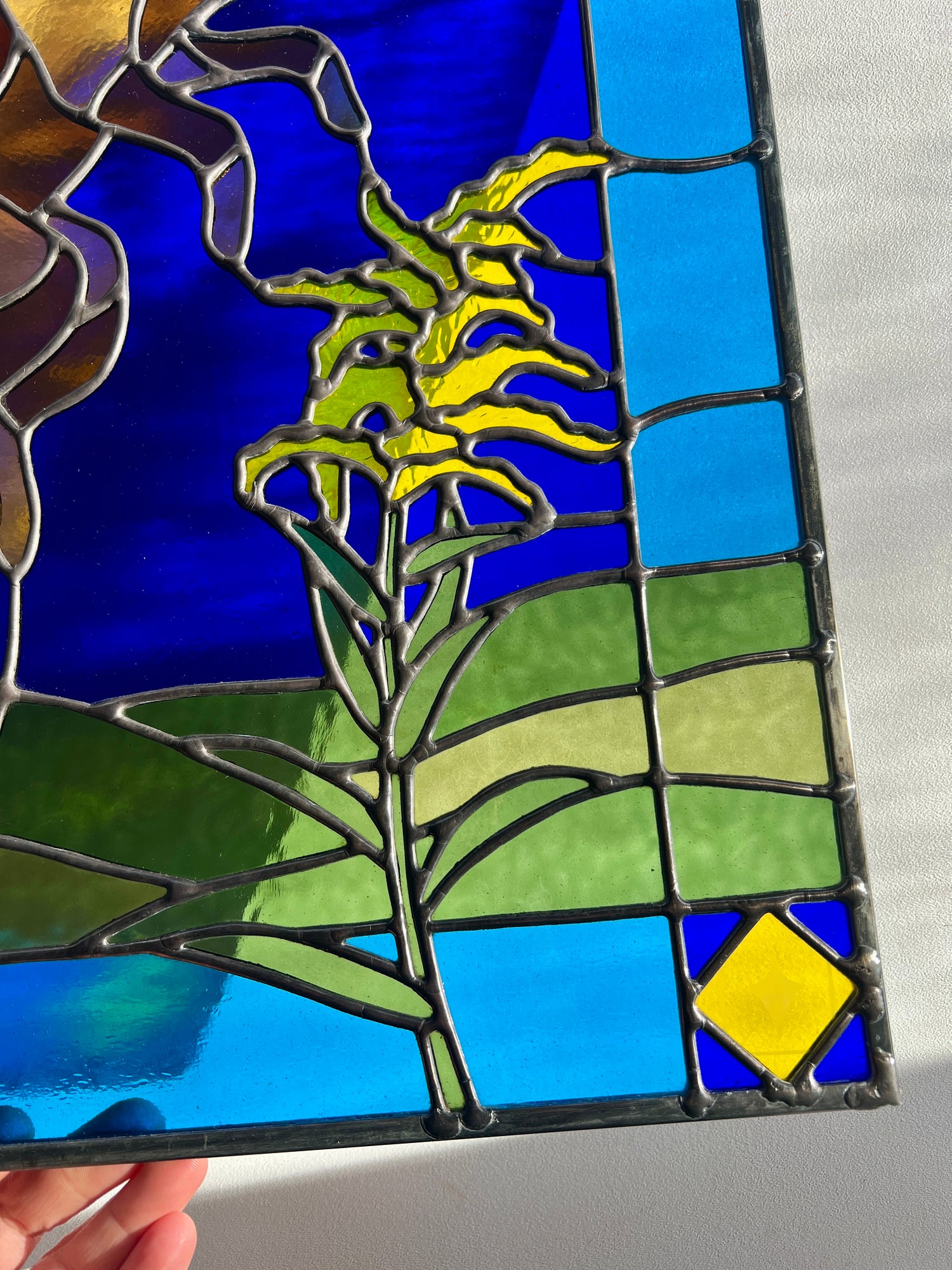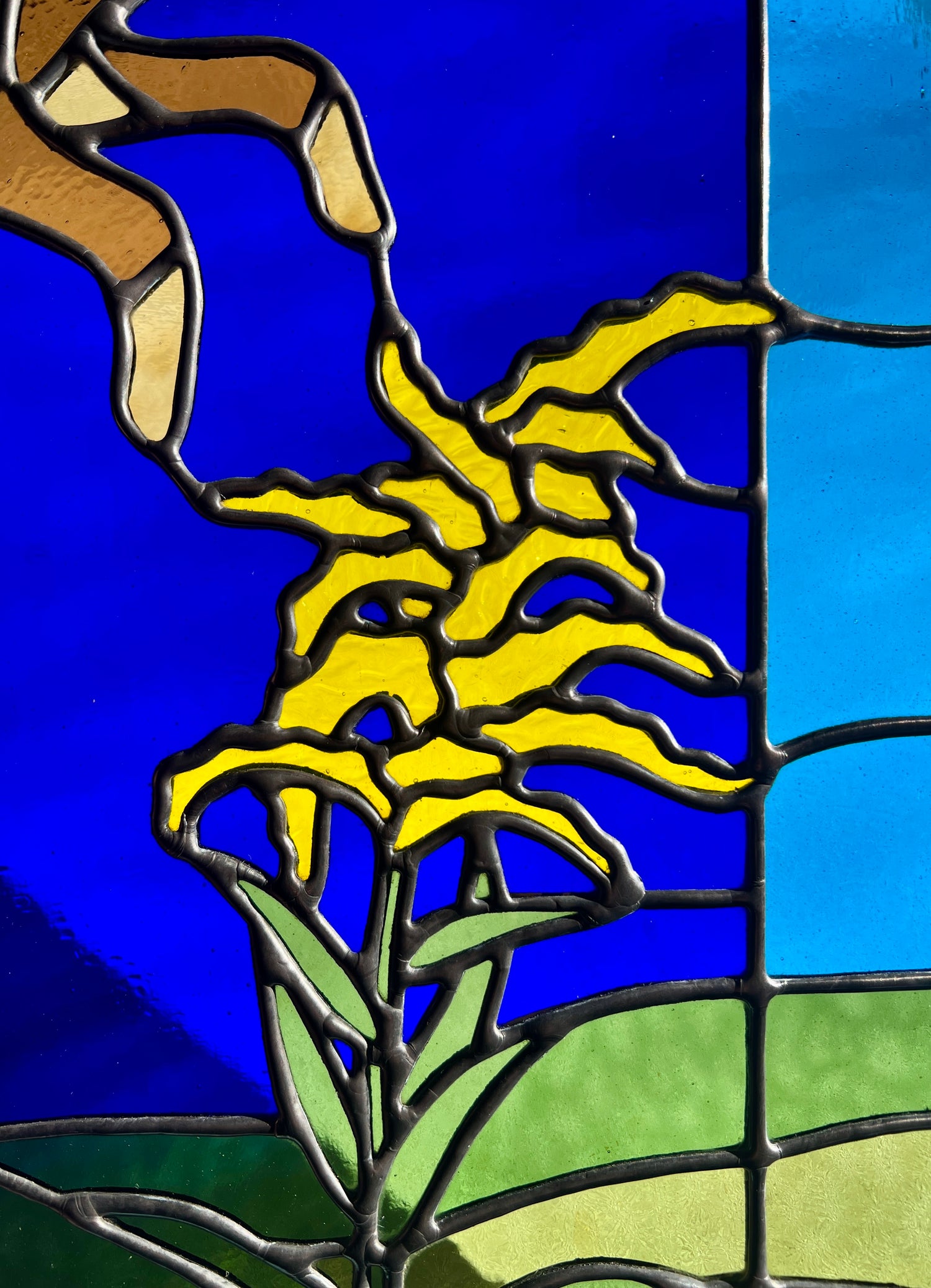 stained glass / lead tin solder / zinc came / black patina / etched details / zinc chain