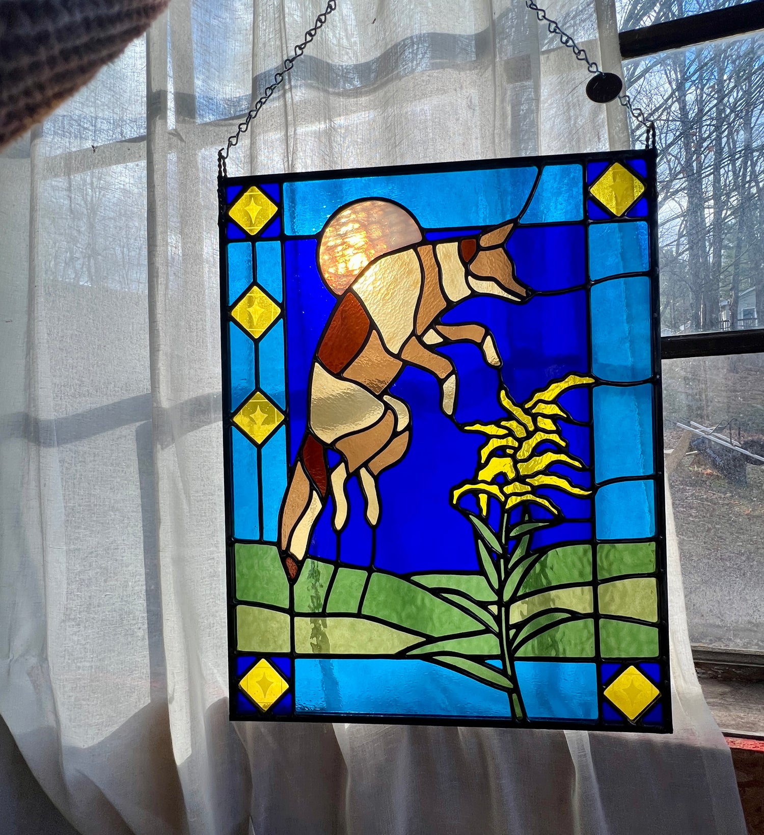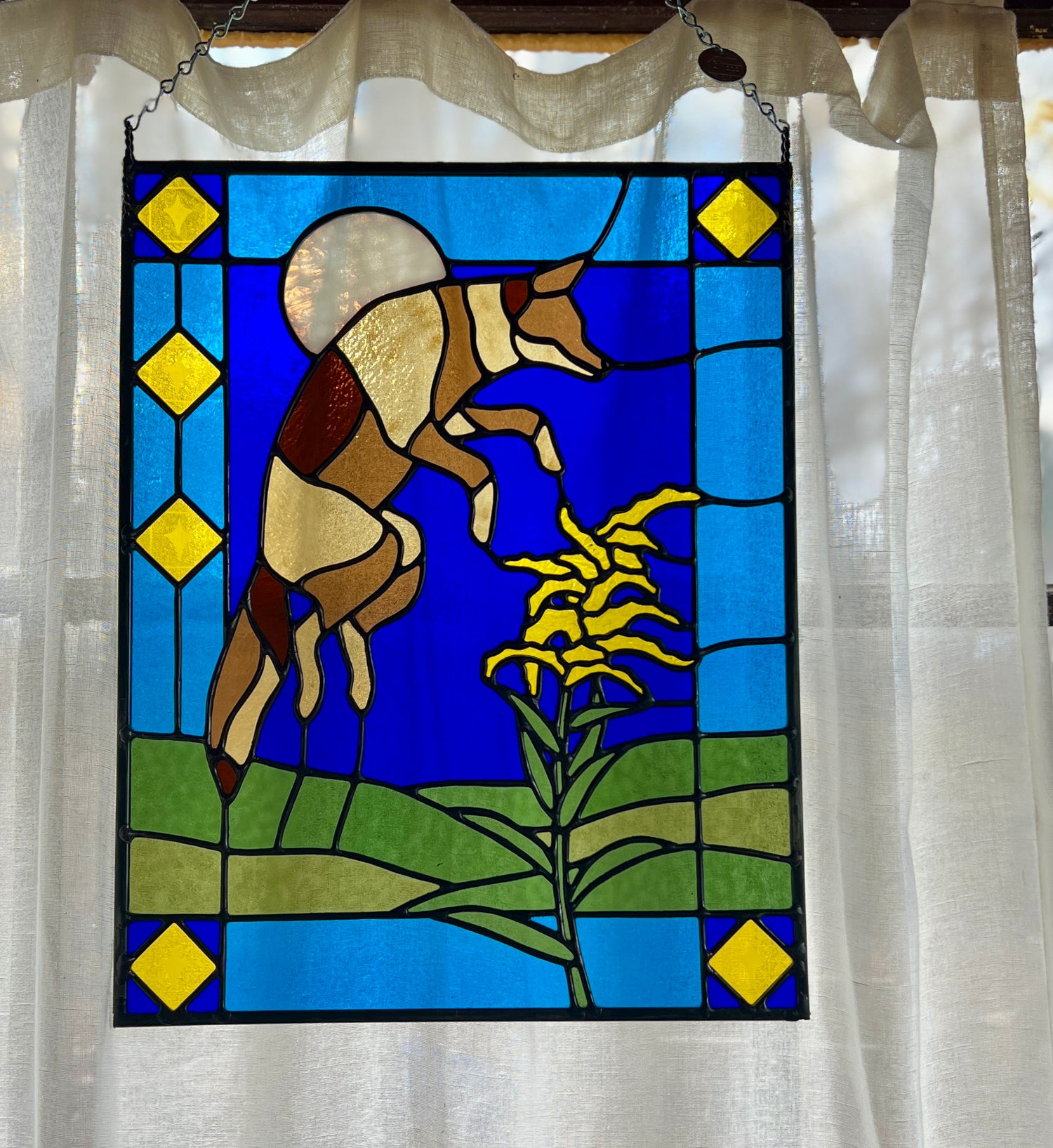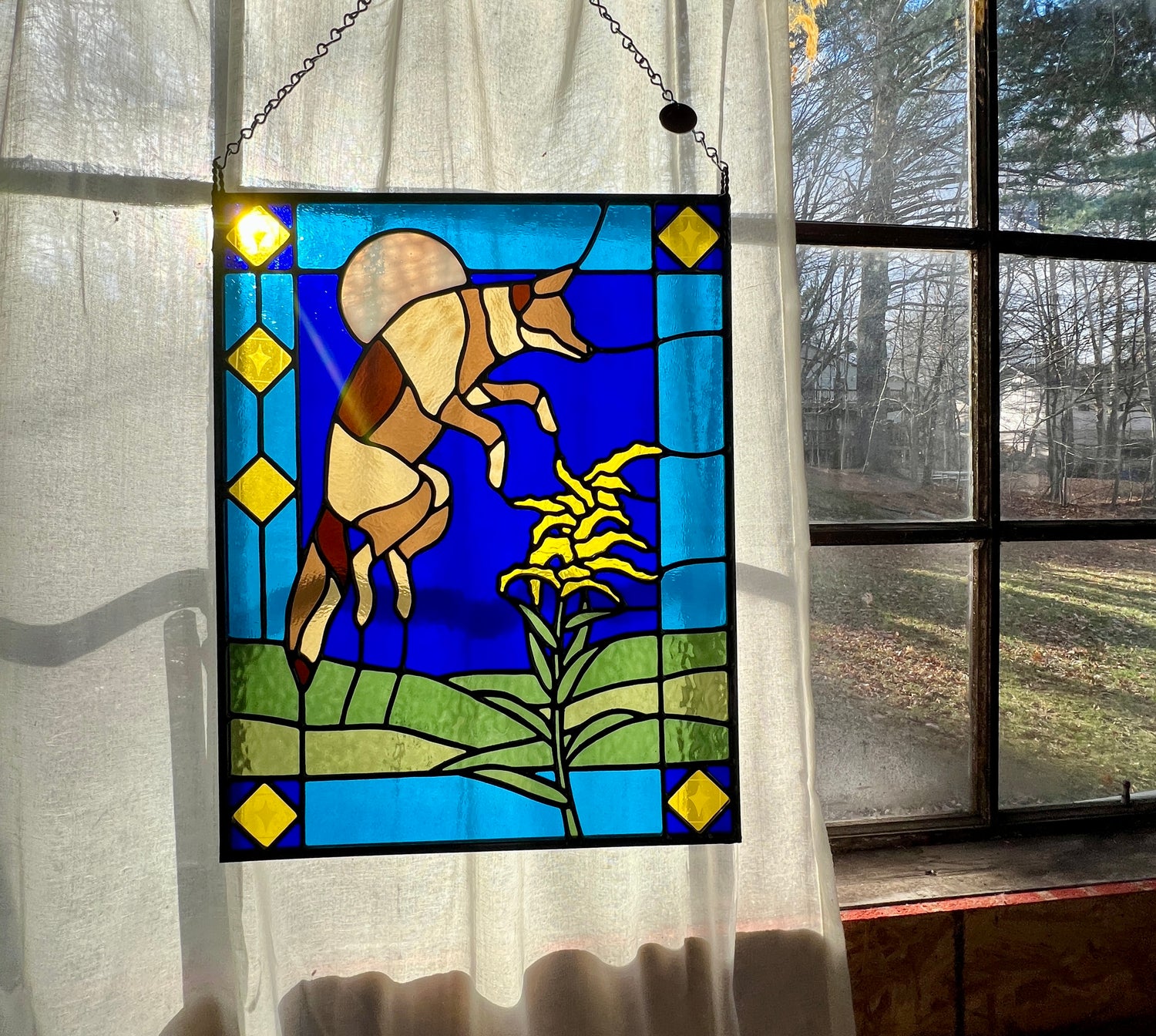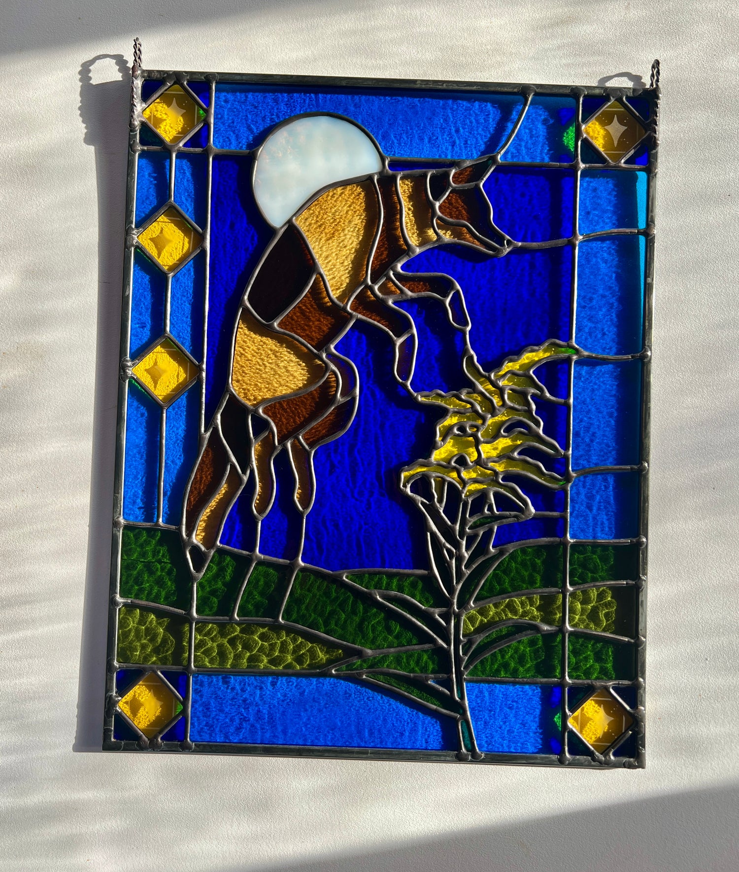 stained glass / lead tin solder / zinc came / black patina / etched details / zinc chain