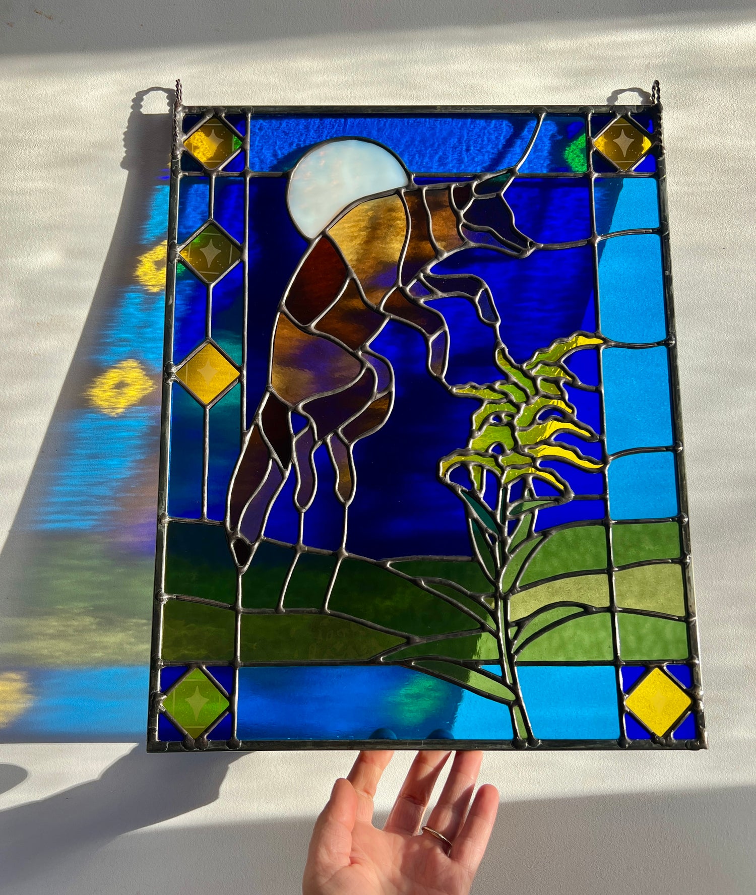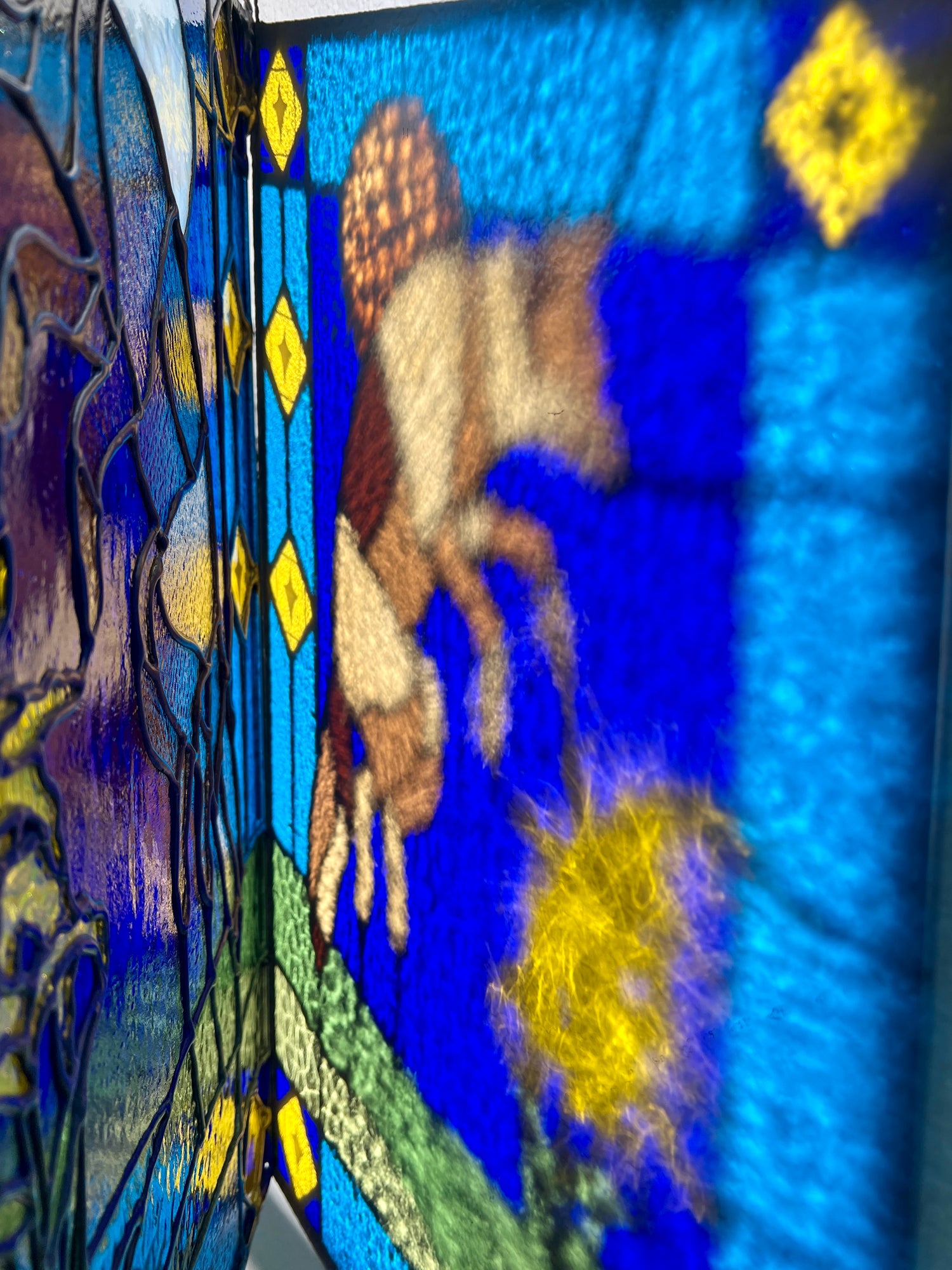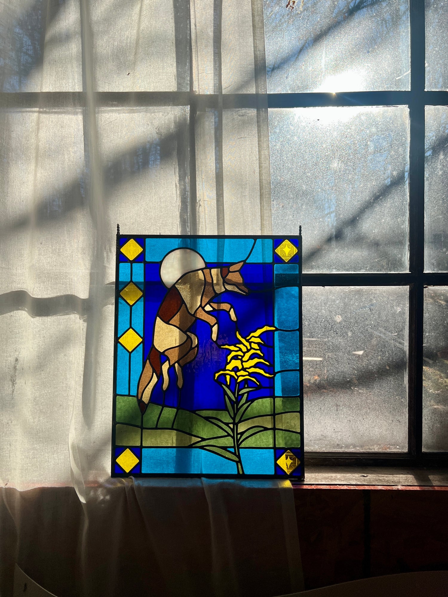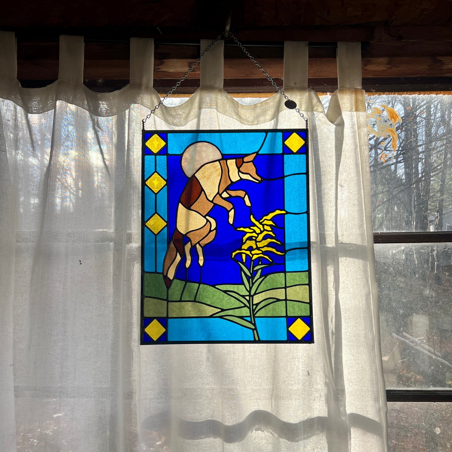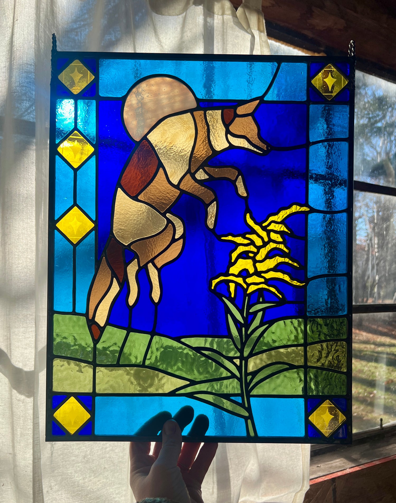 stained glass / lead tin solder / zinc came / black patina / etched details / zinc chain