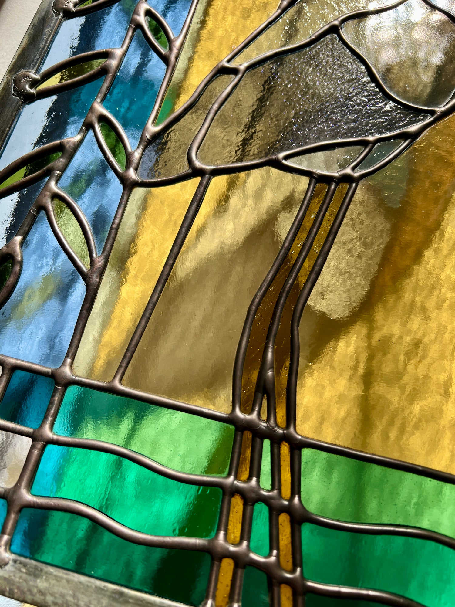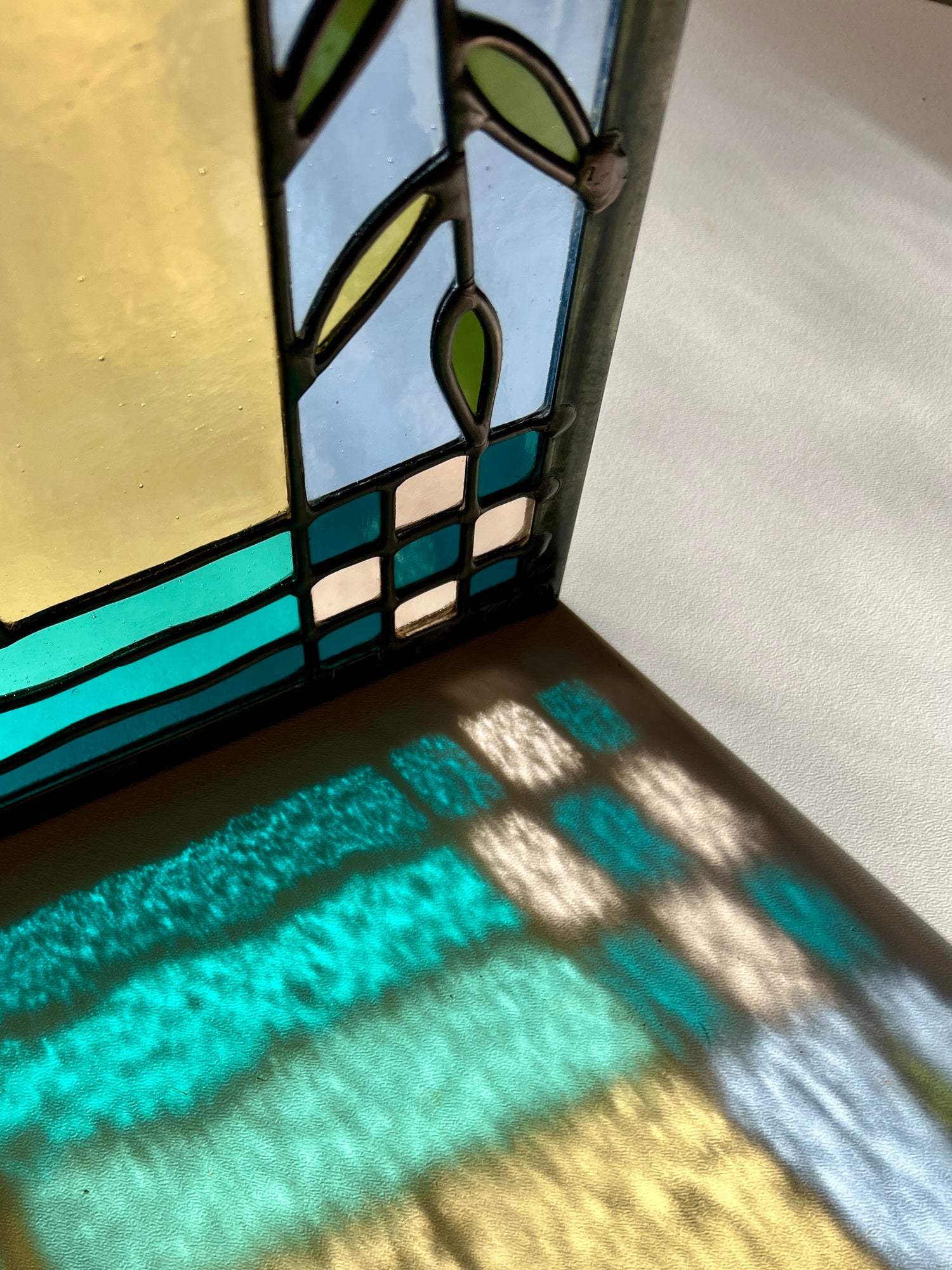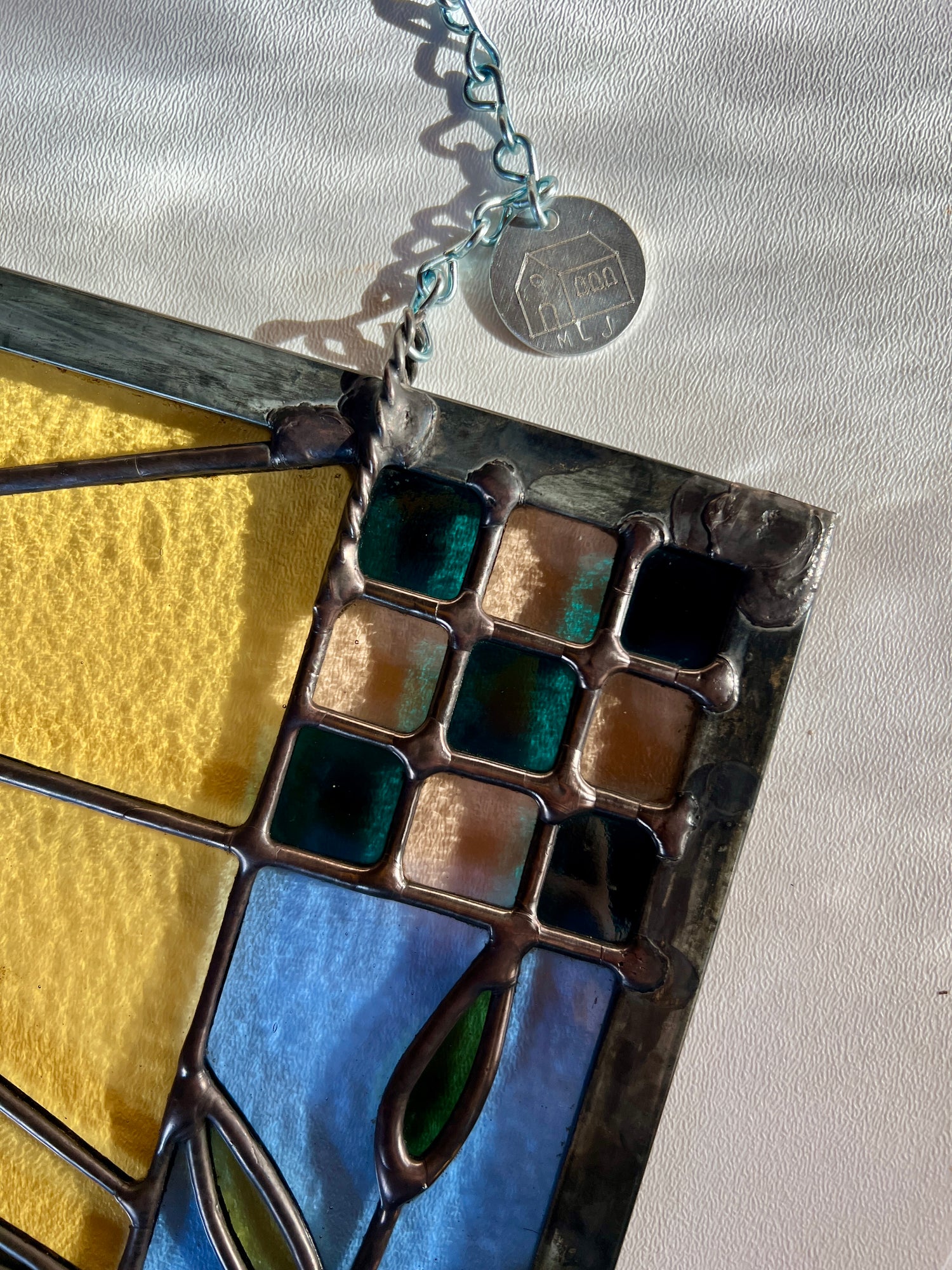 stained glass / lead tin solder / zinc came / black patina / zinc chain