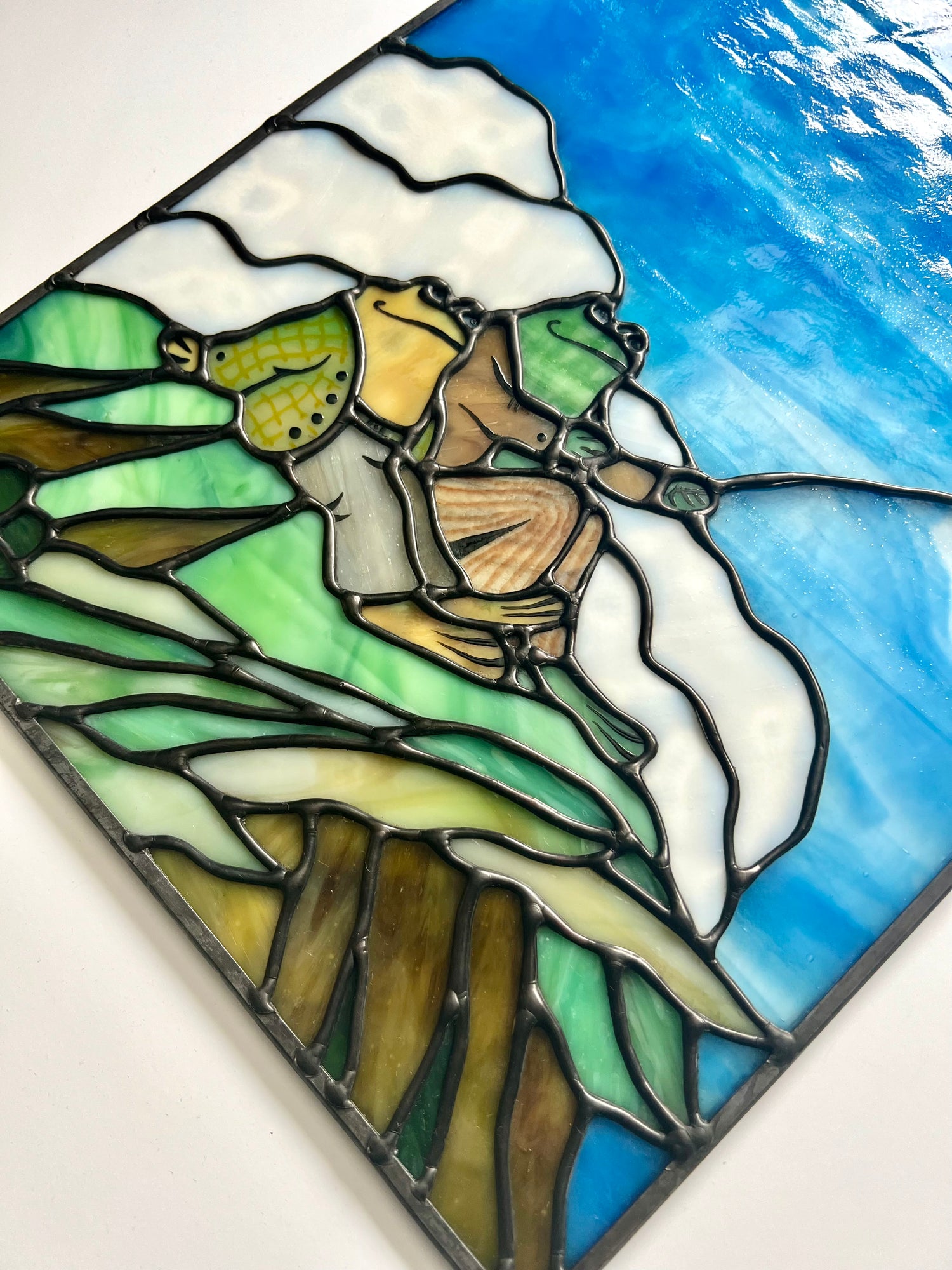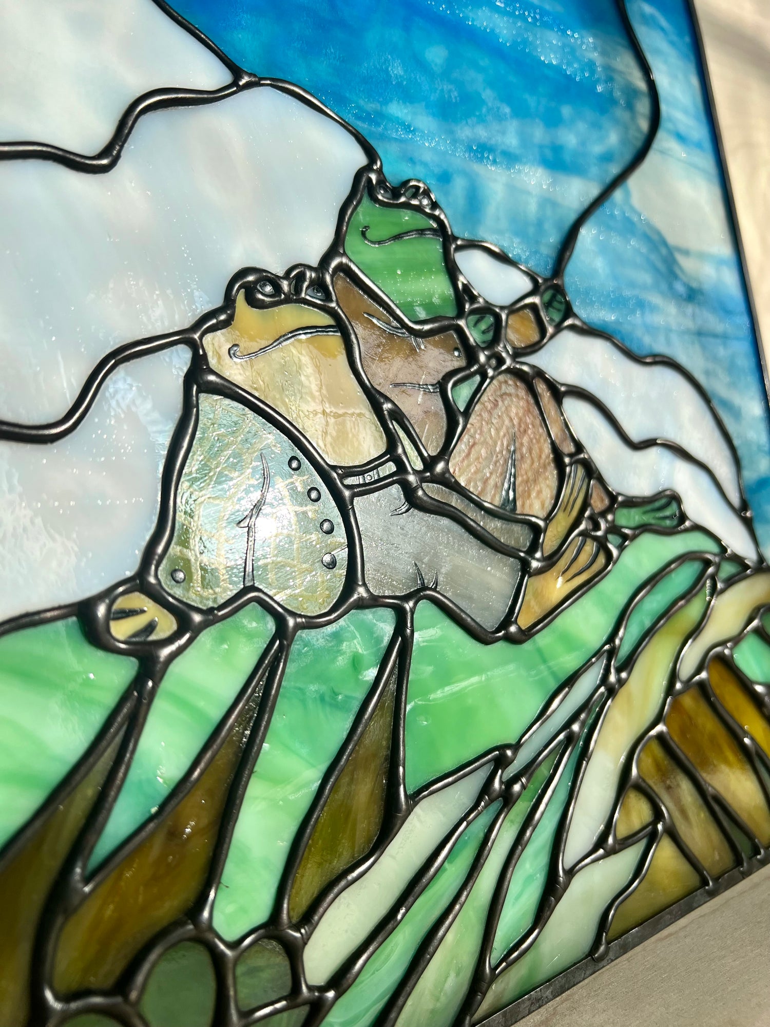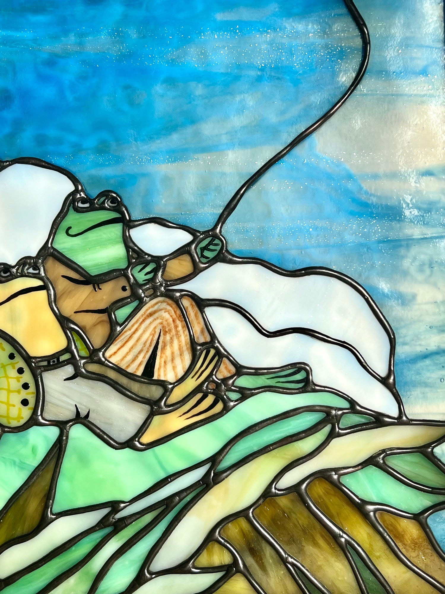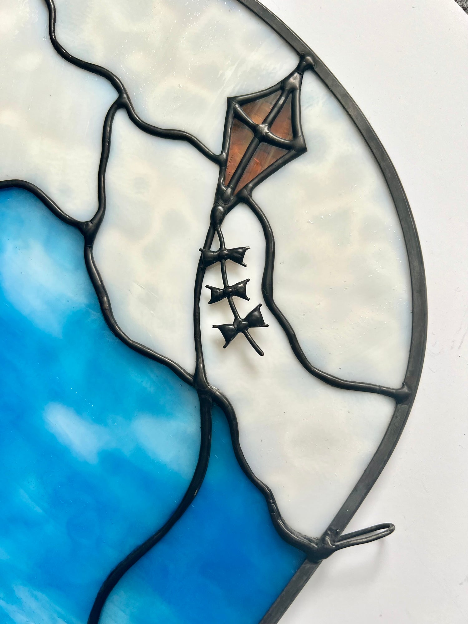 stained glass / lead tin solder / lead frame / black patina / hand painted details / wire details / solder details / zinc chain for hanging
