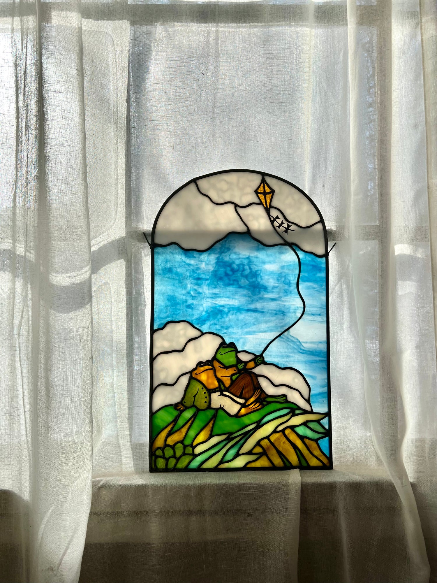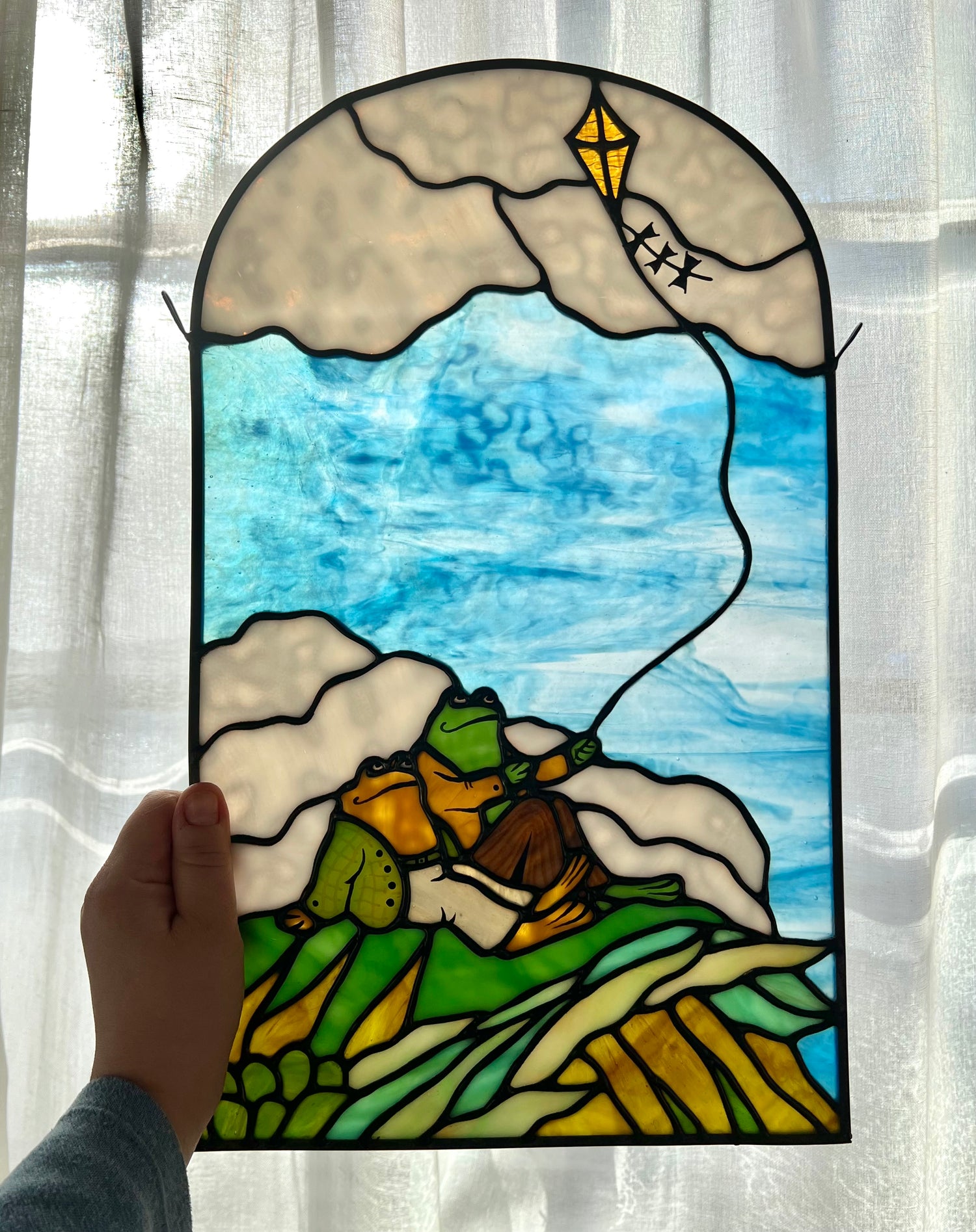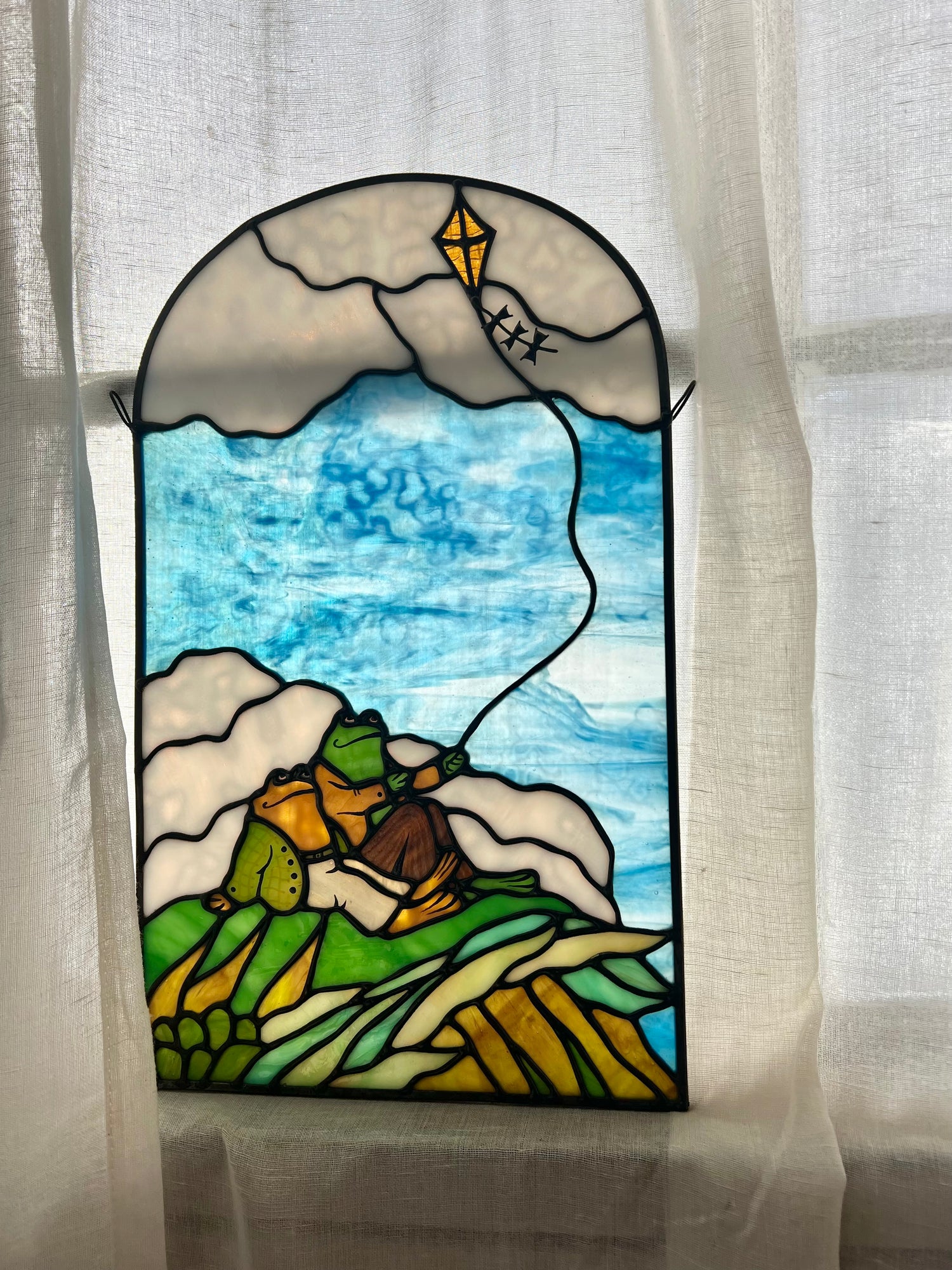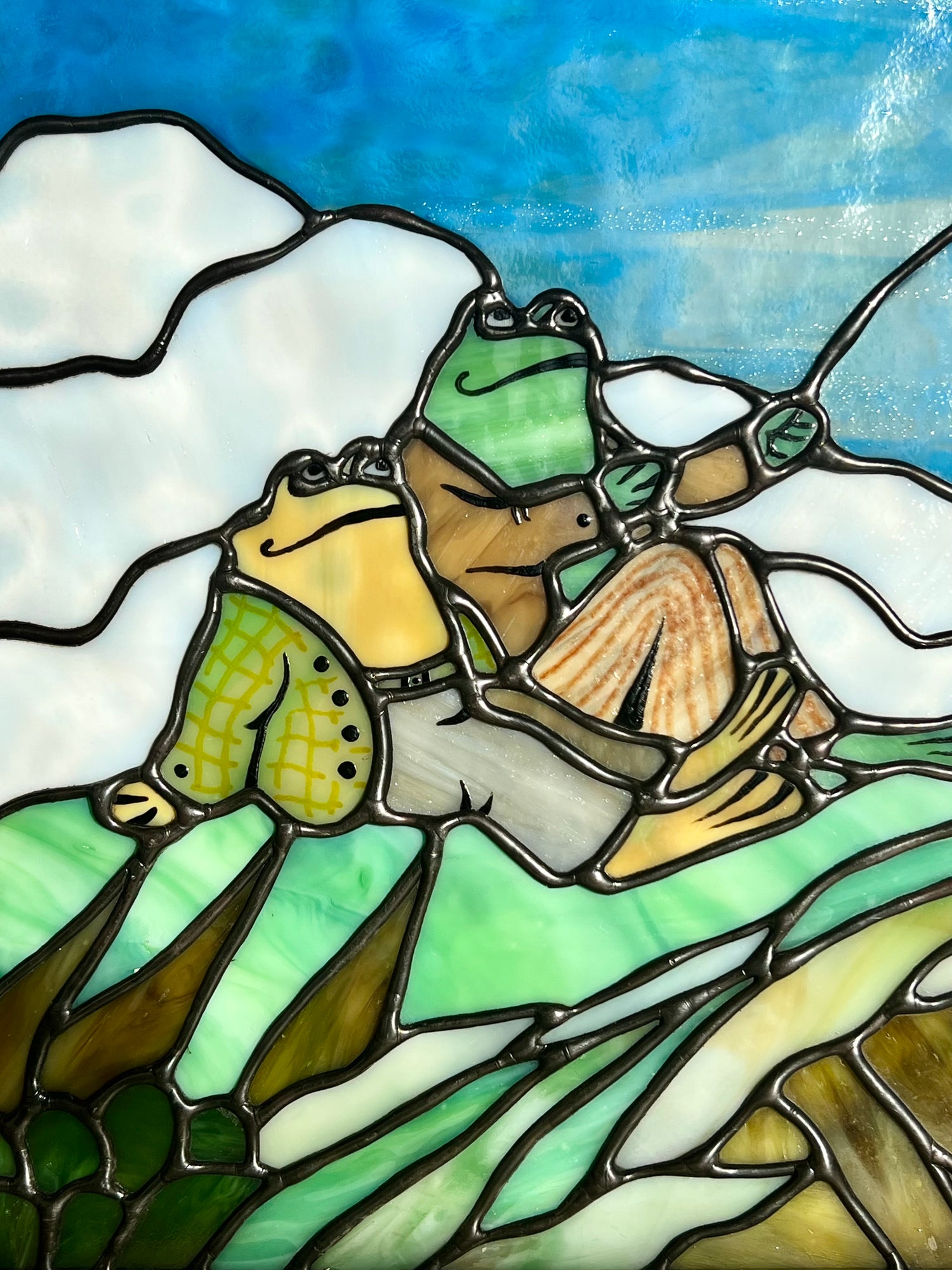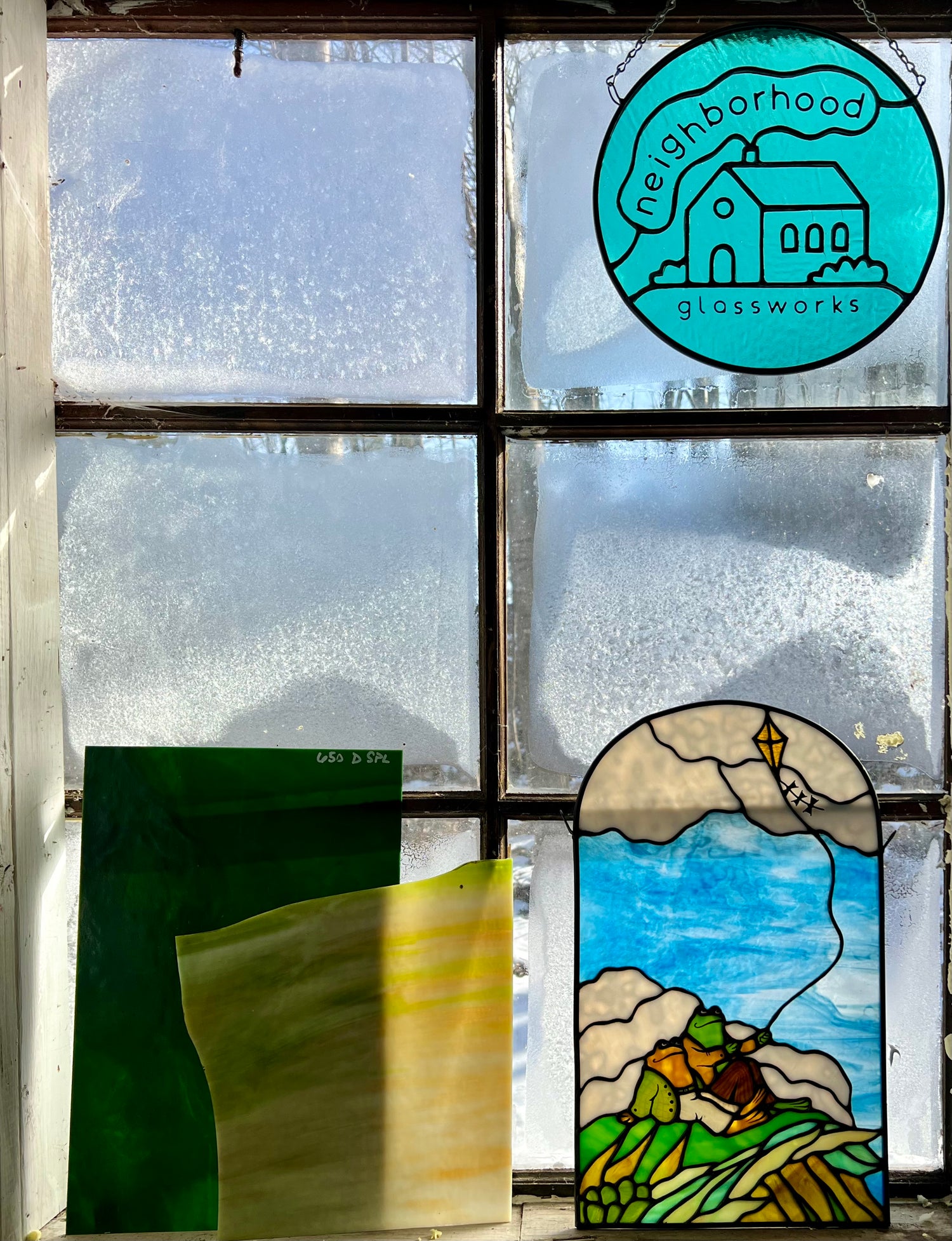 stained glass / lead tin solder / lead frame / black patina / hand painted details / wire details / solder details / zinc chain for hanging