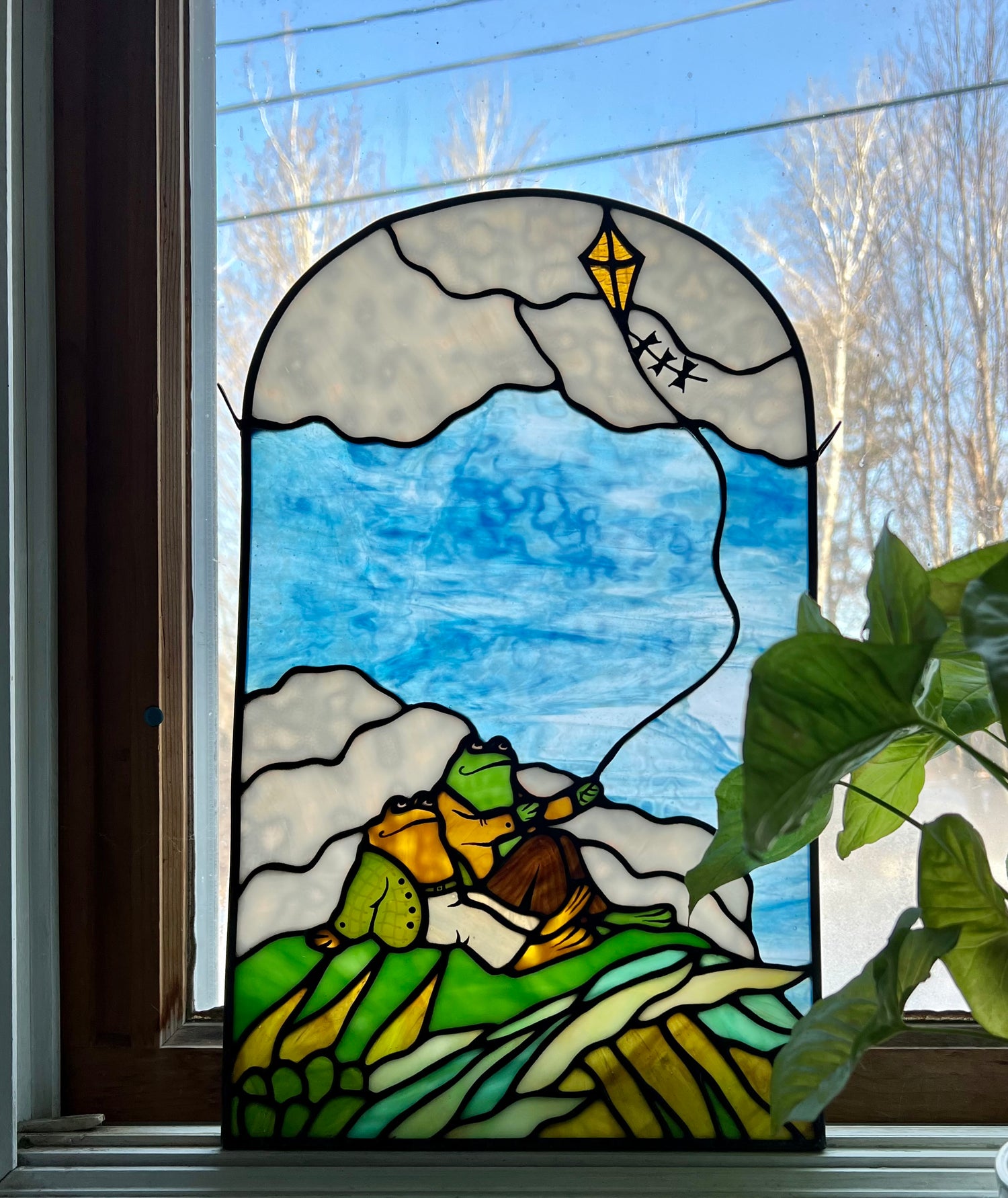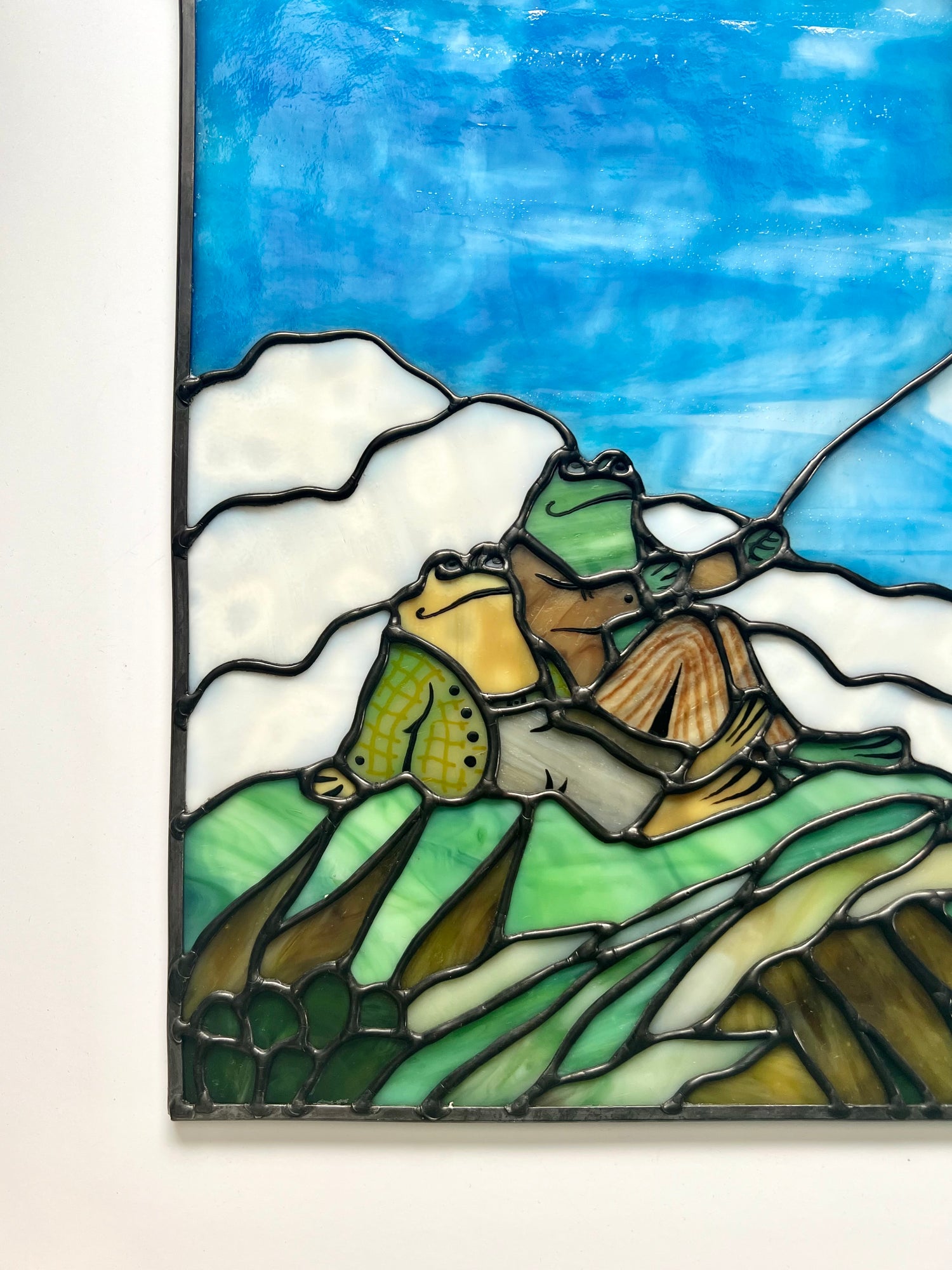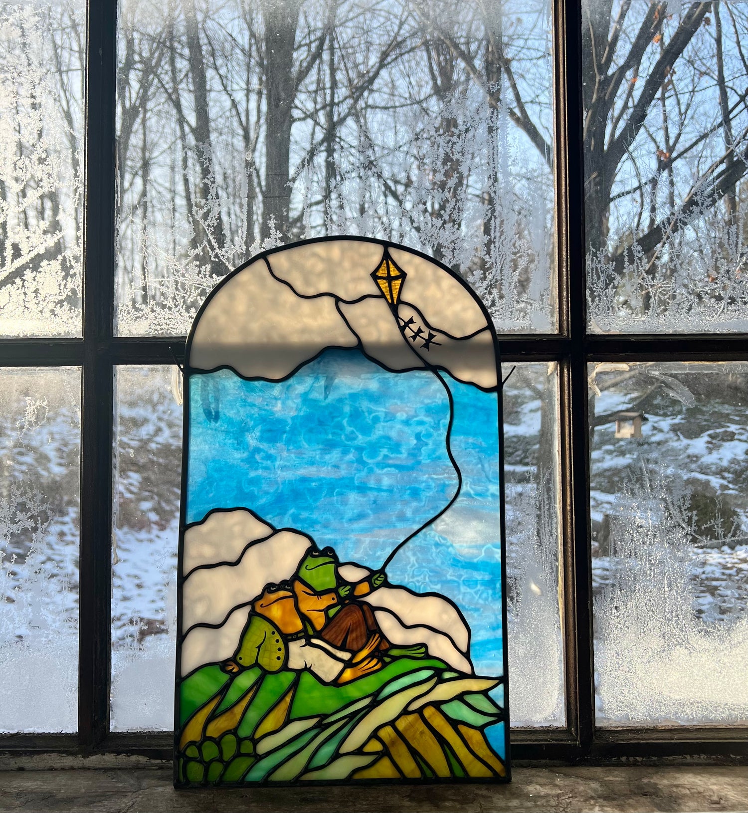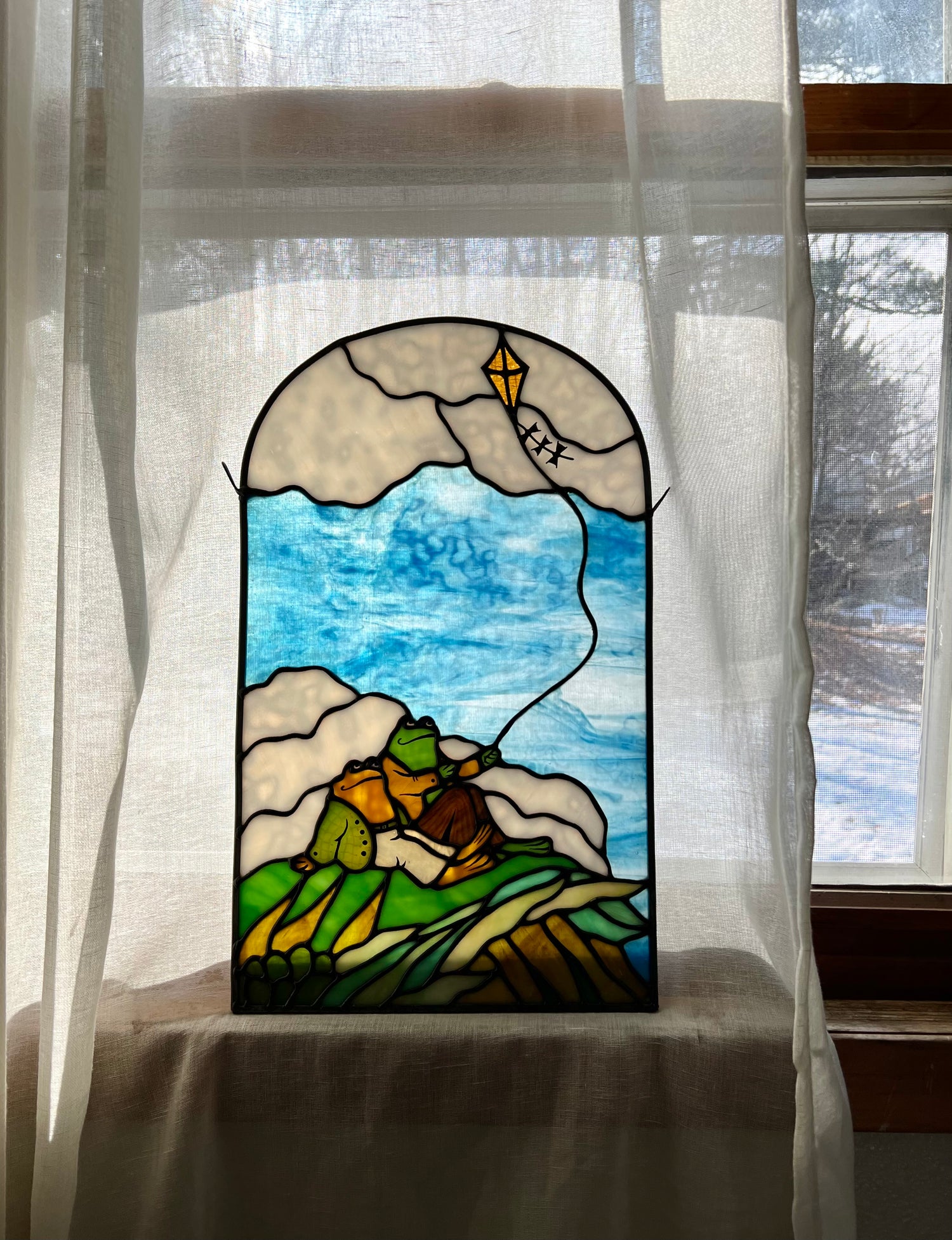stained glass / lead tin solder / lead frame / black patina / hand painted details / wire details / solder details / zinc chain for hanging