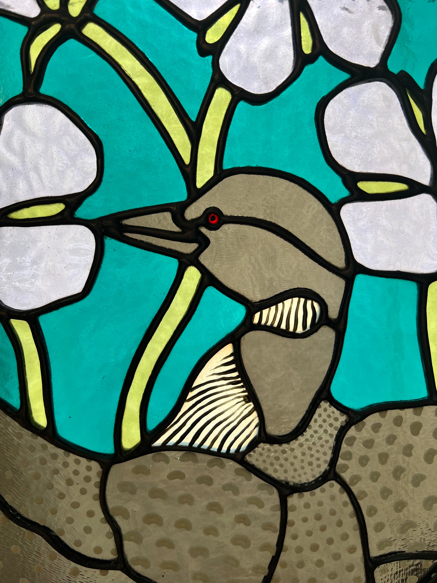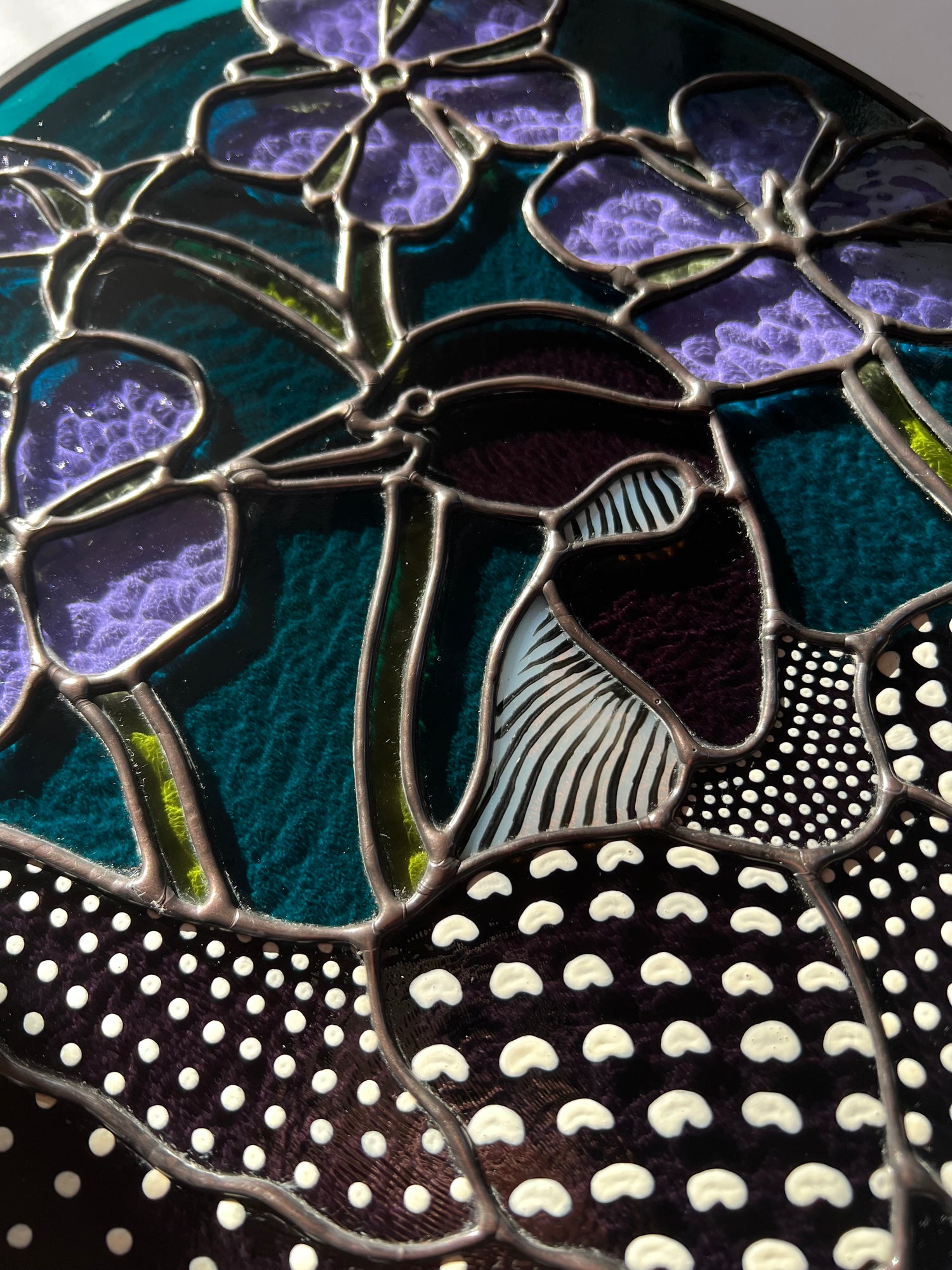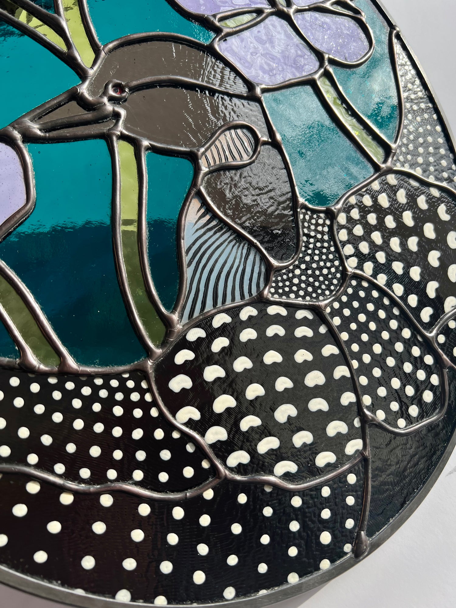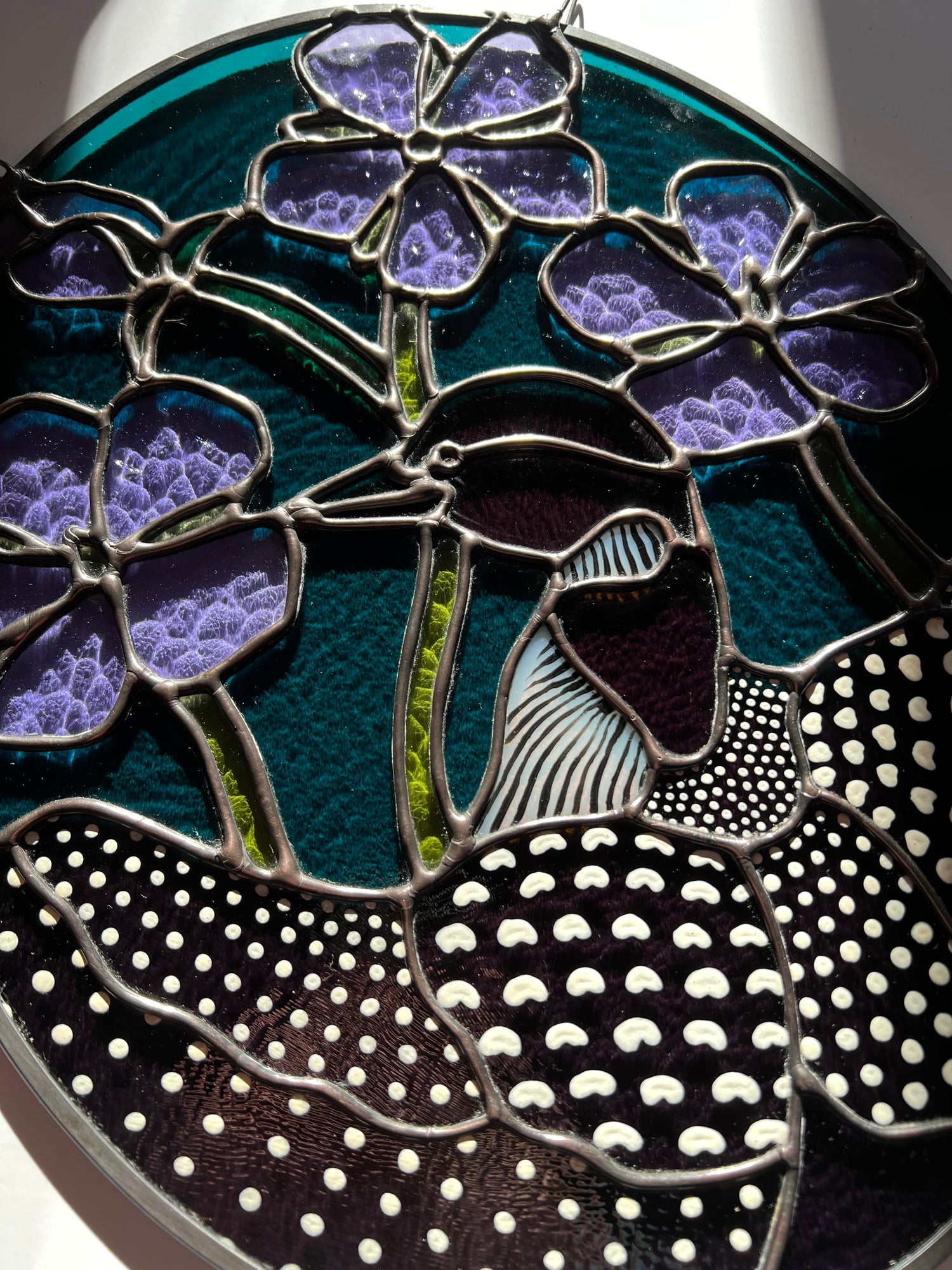 lead tin solder / black patina / lead came / hand painted details / zinc chain